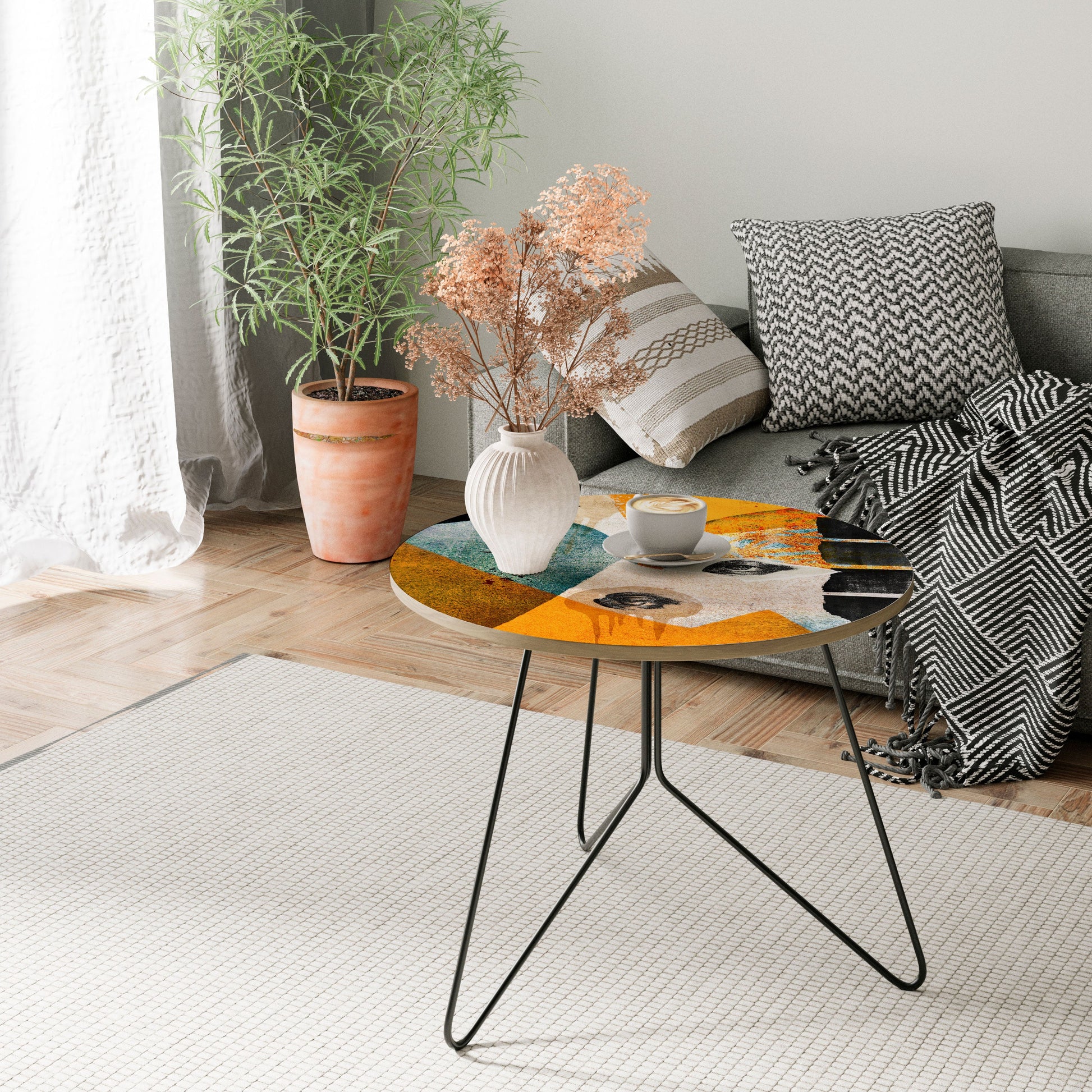 The tabletop features a high-quality printed motif, adding a distinctive artistic accent to your space. Crafted from durable chipboard covered with laminate, it ensures long-lasting use and resistance to daily wear.