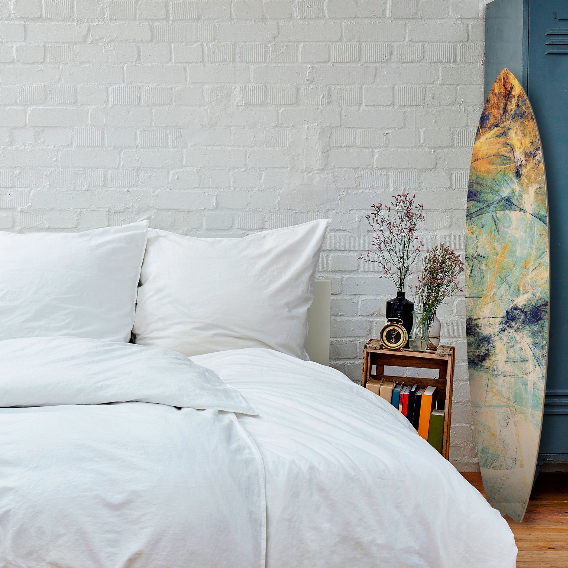 The surfboard has been designed with maximum functionality and arrangement flexibility in mind. It can be hung vertically or horizontally, or displayed freestanding by leaning it against a wall, dresser, or shelf. This makes it easy to adapt the piece to the character of the space and changing interior needs.