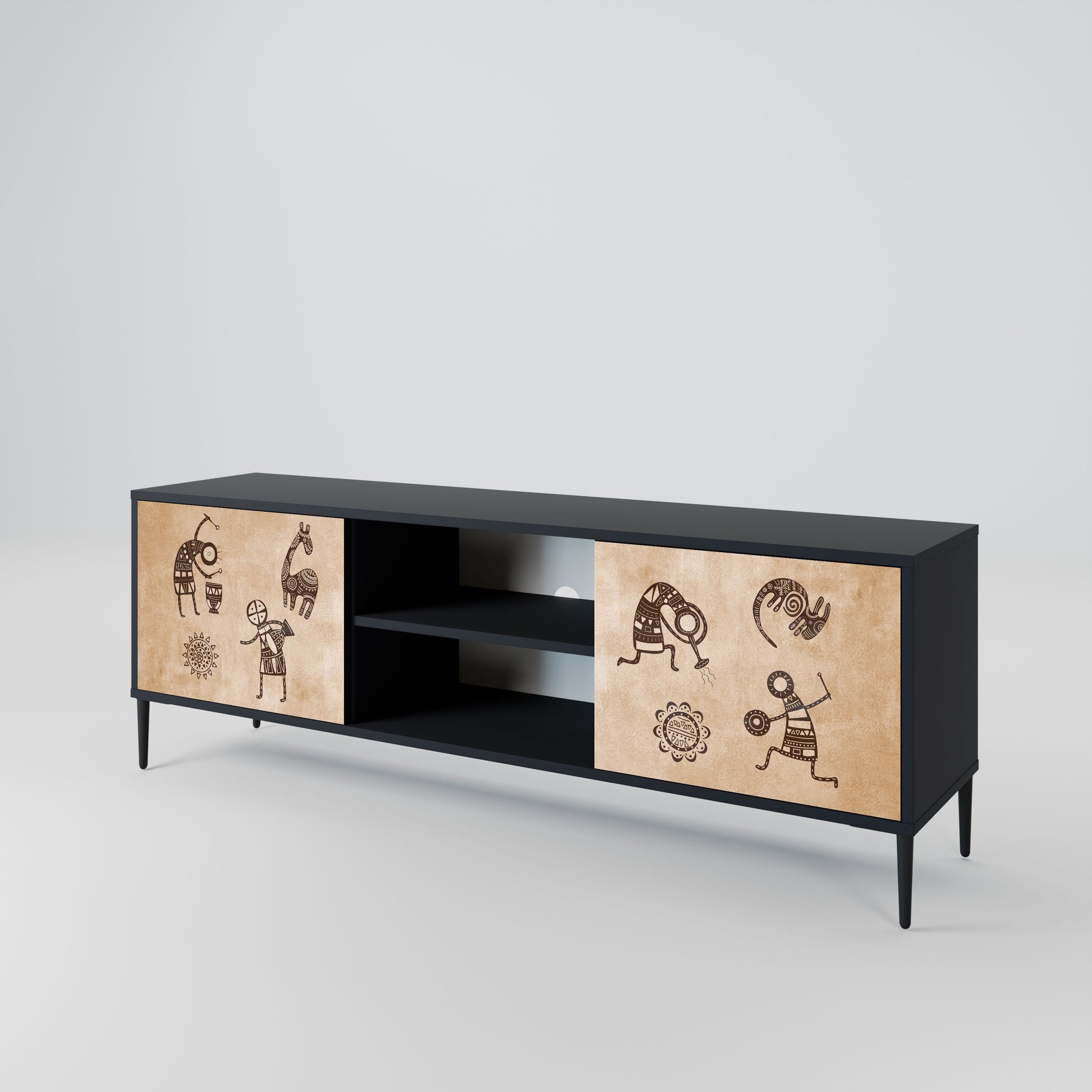 The black body gives the TV stand an elegant, modern look, while the fronts with an exceptional print draw attention, making it the focal point of any room. The spacious interior provides room for electronic devices, cables, remotes, and other accessories, helping you maintain order and organization.