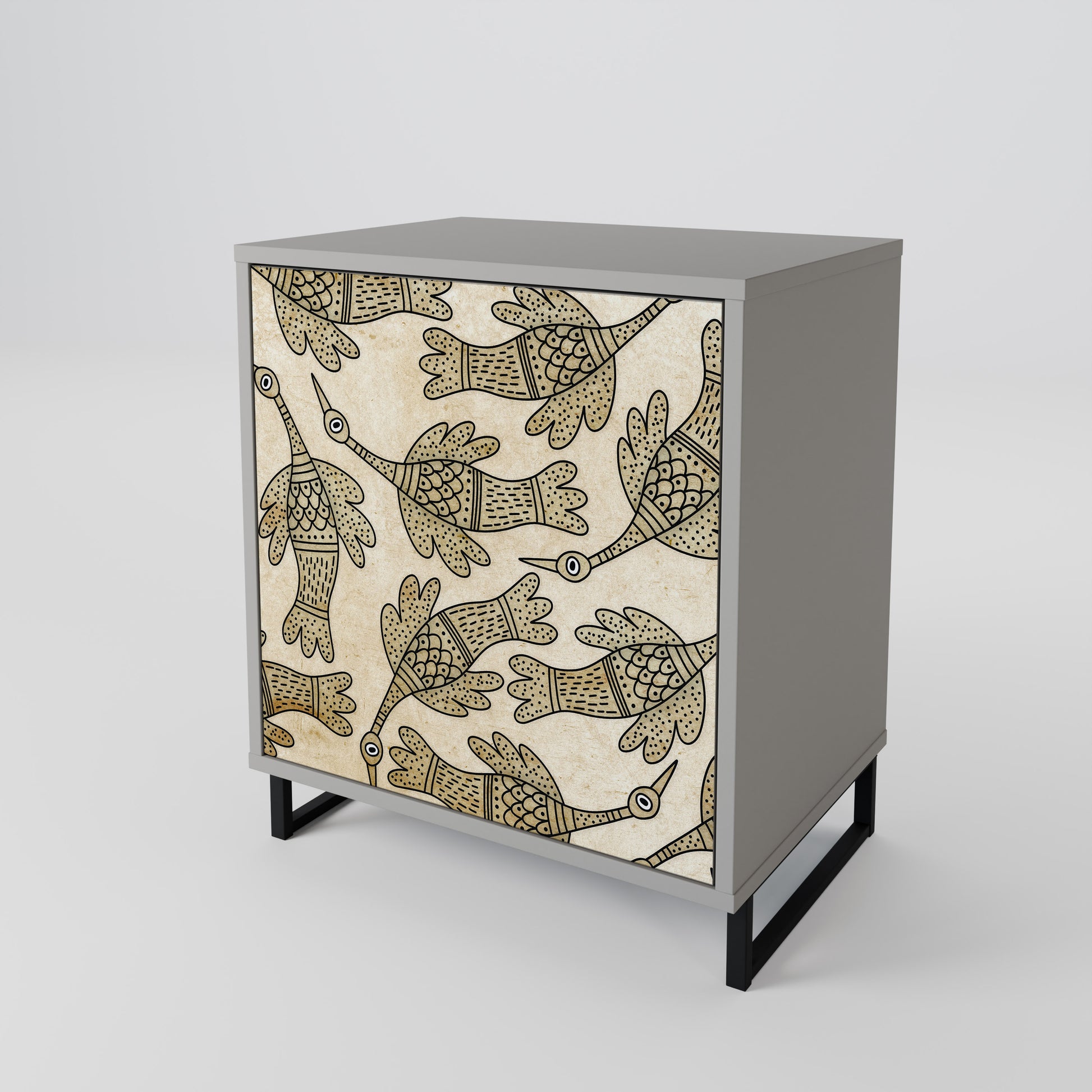 This compact yet remarkably elegant piece of furniture impresses with its minimalist design, perfectly fitting into both modern and classic interiors. The subdued grey color of the body gives the furniture a subtle yet distinctive character, while the fronts with a unique print add an artistic touch.