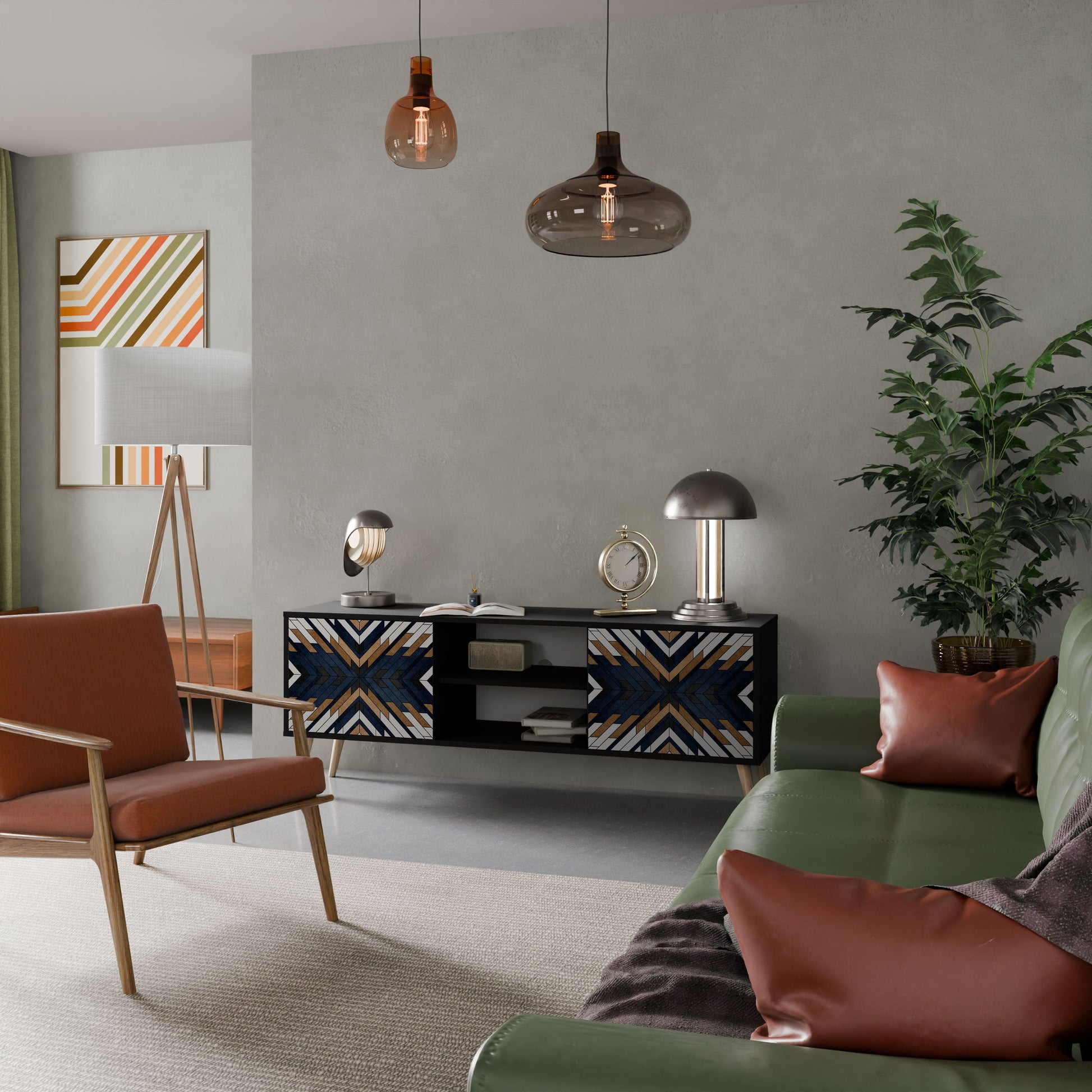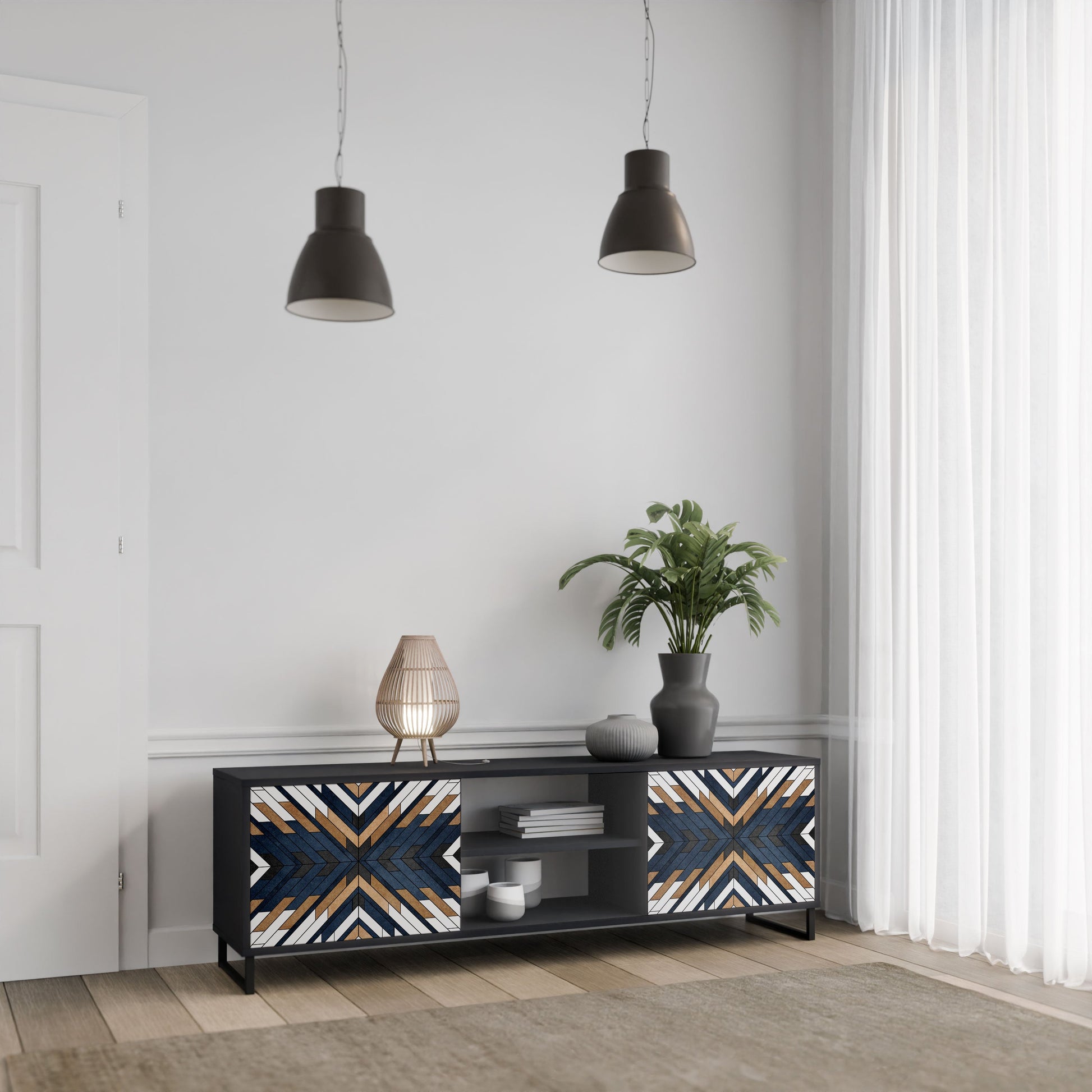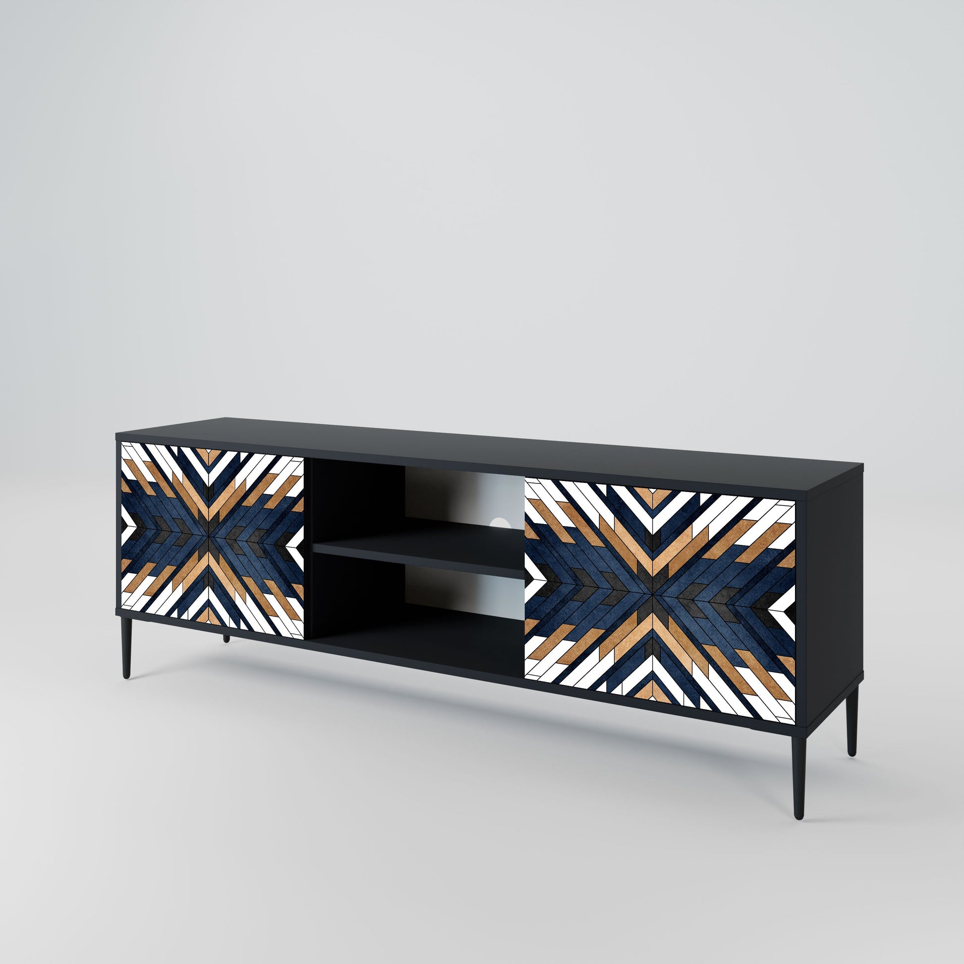 The black body gives the TV stand an elegant, modern look, while the fronts with an exceptional print draw attention, making it the focal point of any room. The spacious interior provides room for electronic devices, cables, remotes, and other accessories, helping you maintain order and organization.