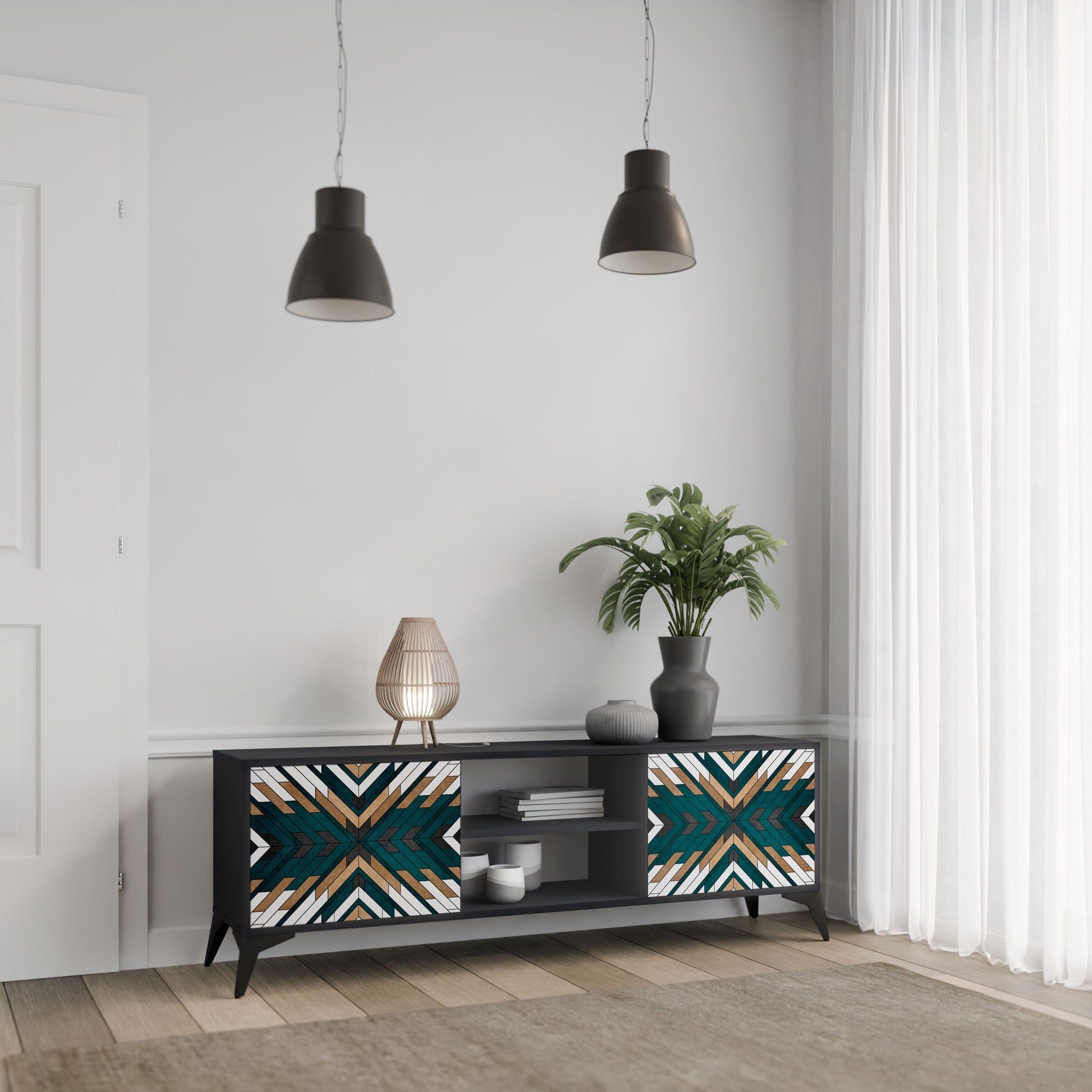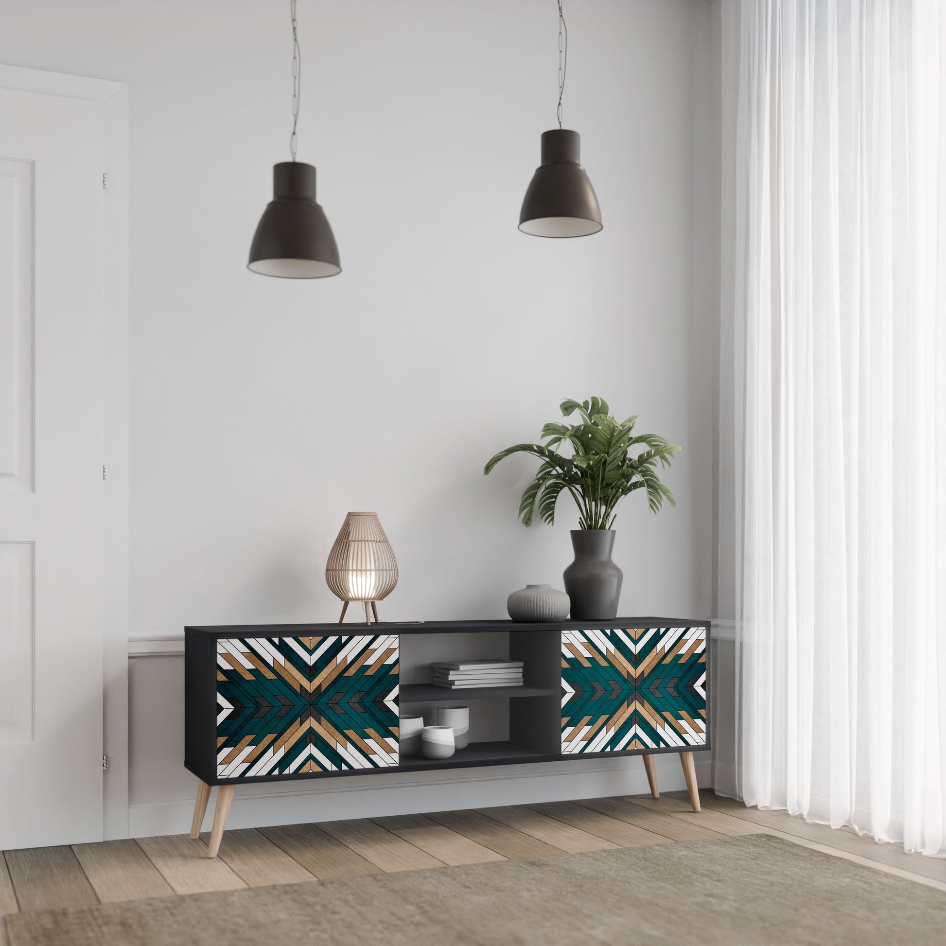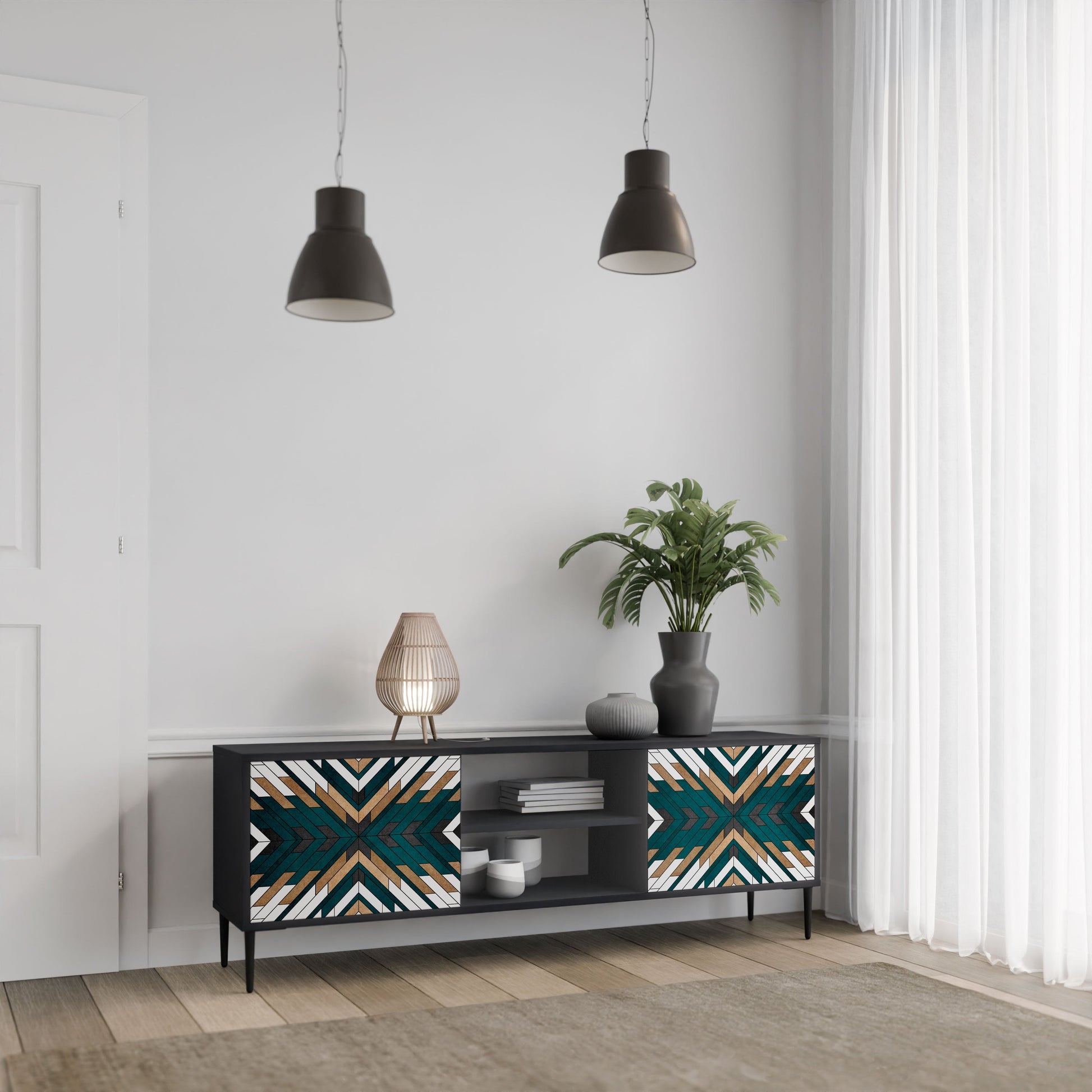 The black body gives the TV stand an elegant, modern look, while the fronts with an exceptional print draw attention, making it the focal point of any room. The spacious interior provides room for electronic devices, cables, remotes, and other accessories, helping you maintain order and organization.