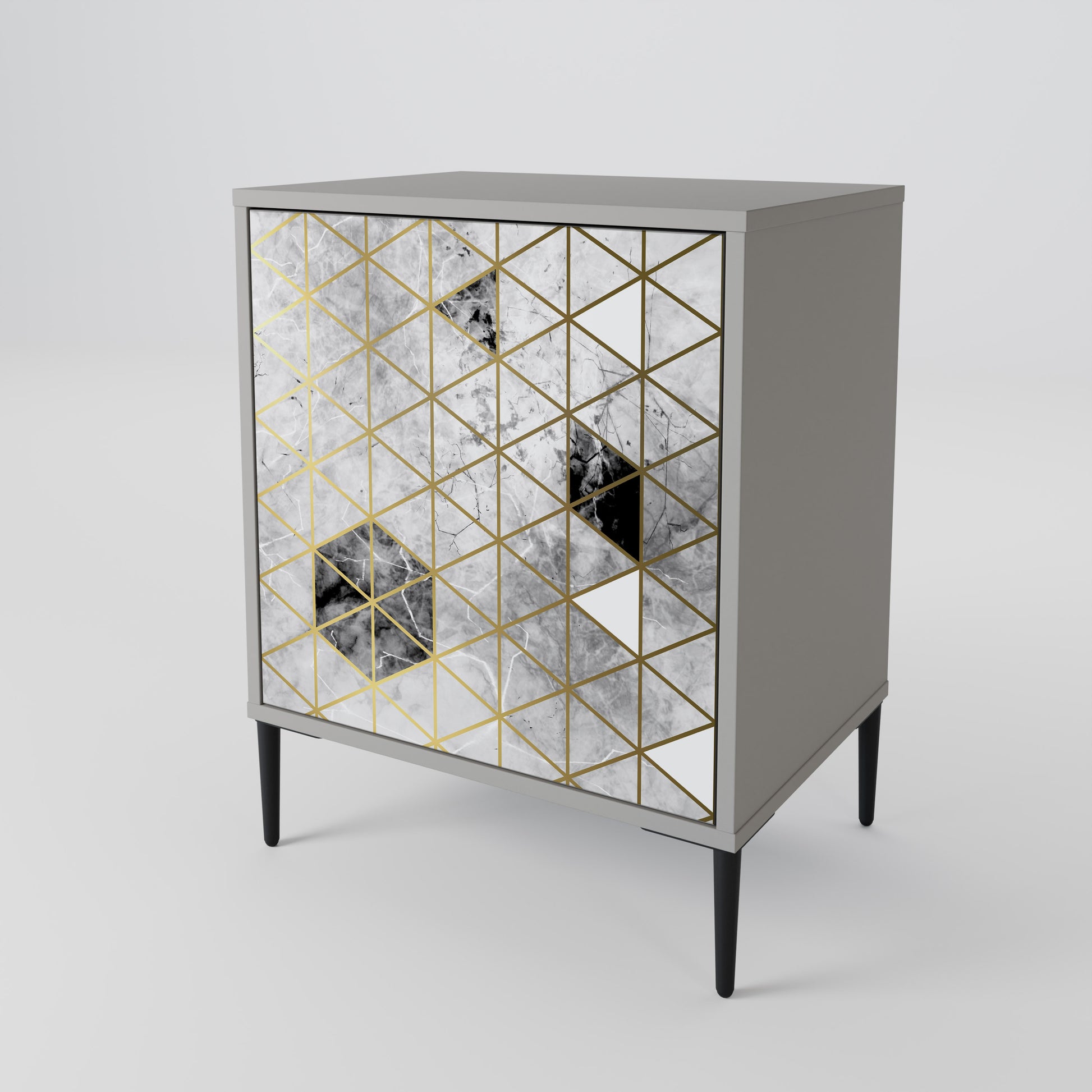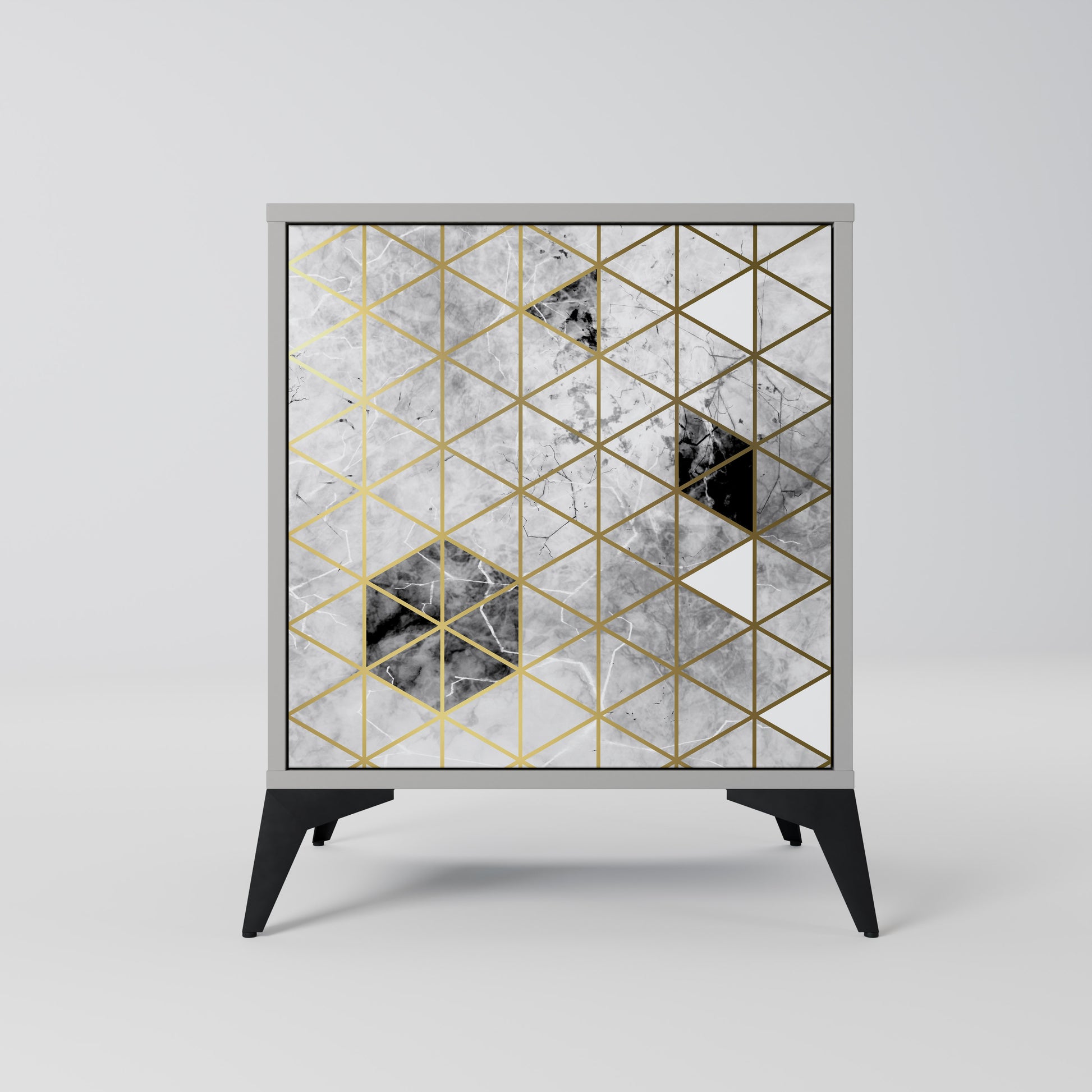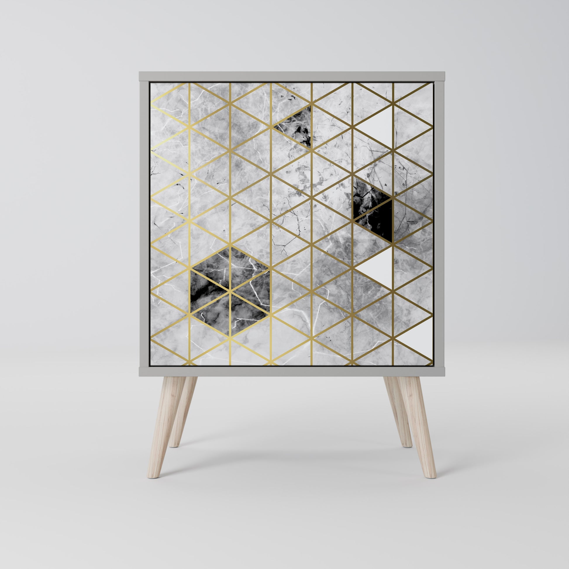This compact yet remarkably elegant piece of furniture impresses with its minimalist design, perfectly fitting into both modern and classic interiors. The subdued grey color of the body gives the furniture a subtle yet distinctive character, while the fronts with a unique print add an artistic touch.