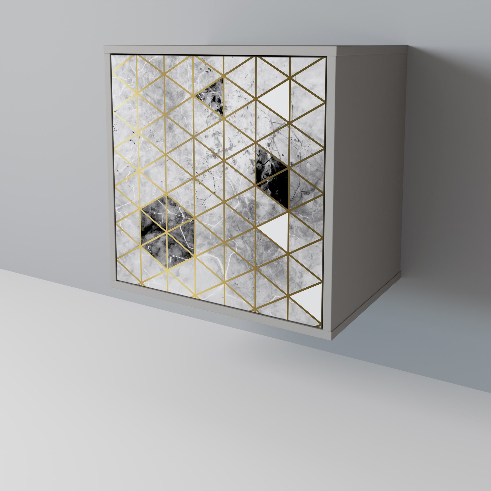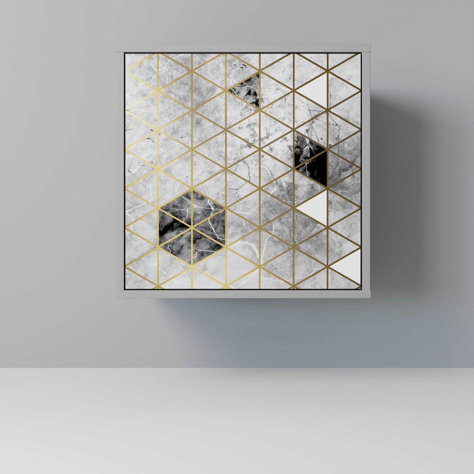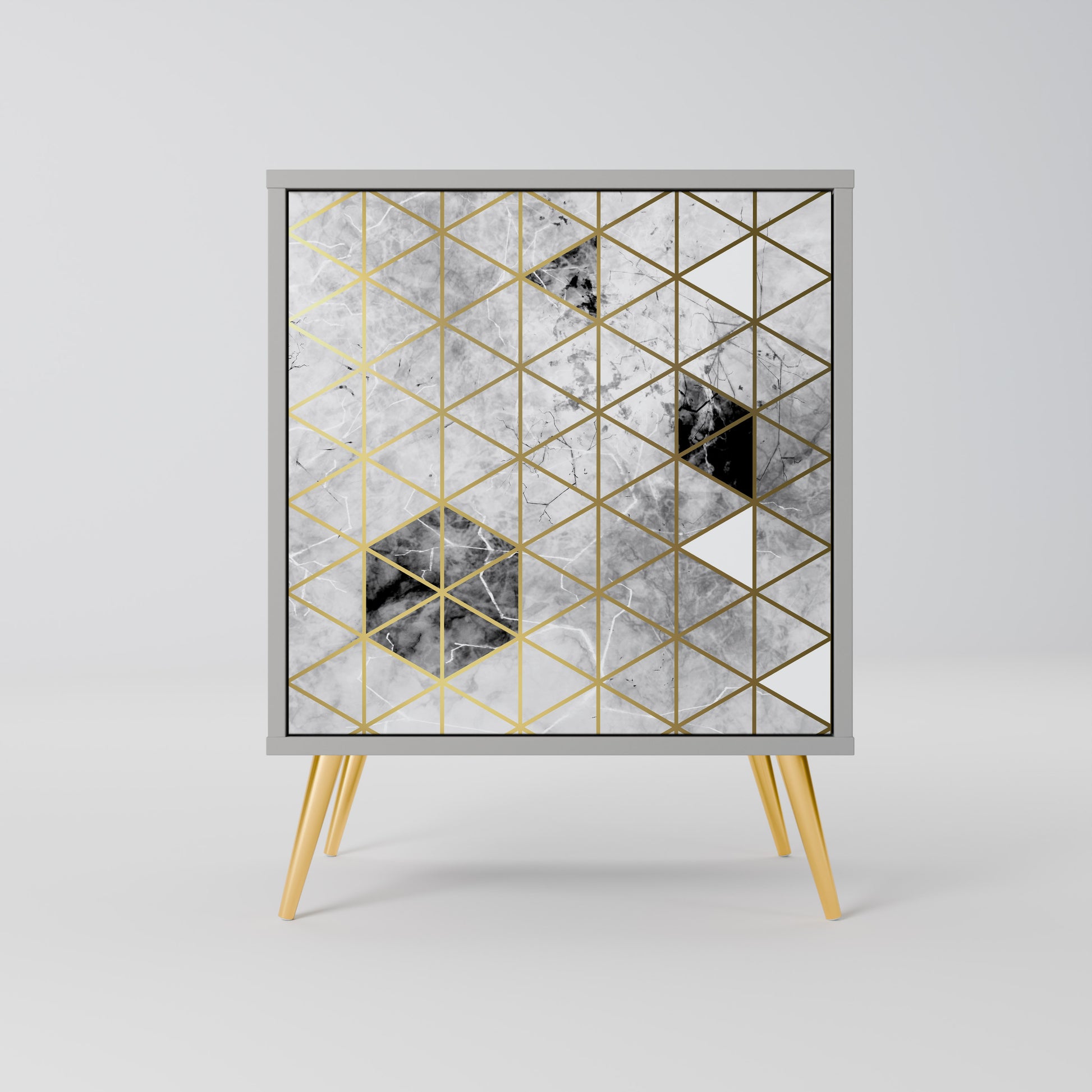 This compact yet remarkably elegant piece of furniture impresses with its minimalist design, perfectly fitting into both modern and classic interiors. The subdued grey color of the body gives the furniture a subtle yet distinctive character, while the fronts with a unique print add an artistic touch.