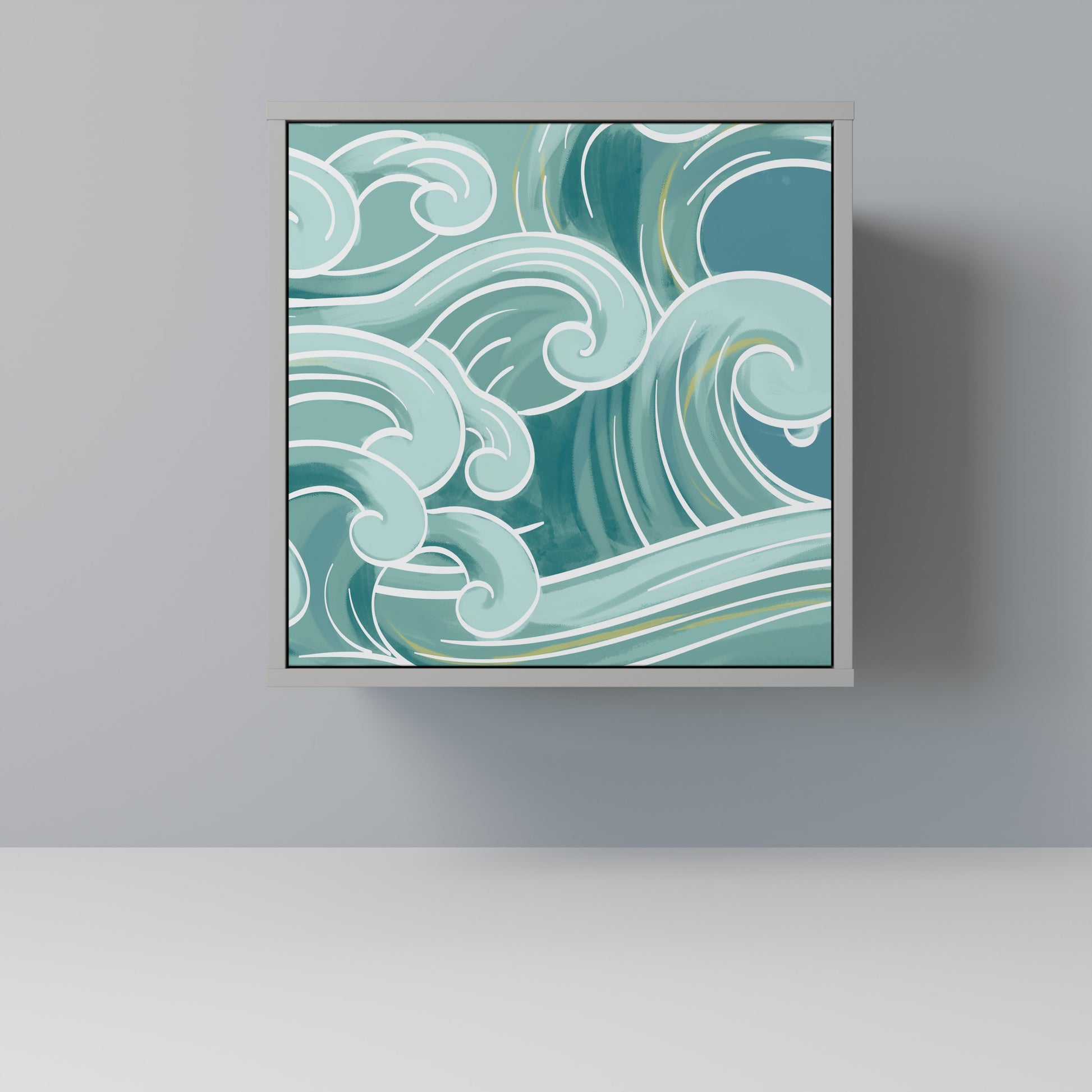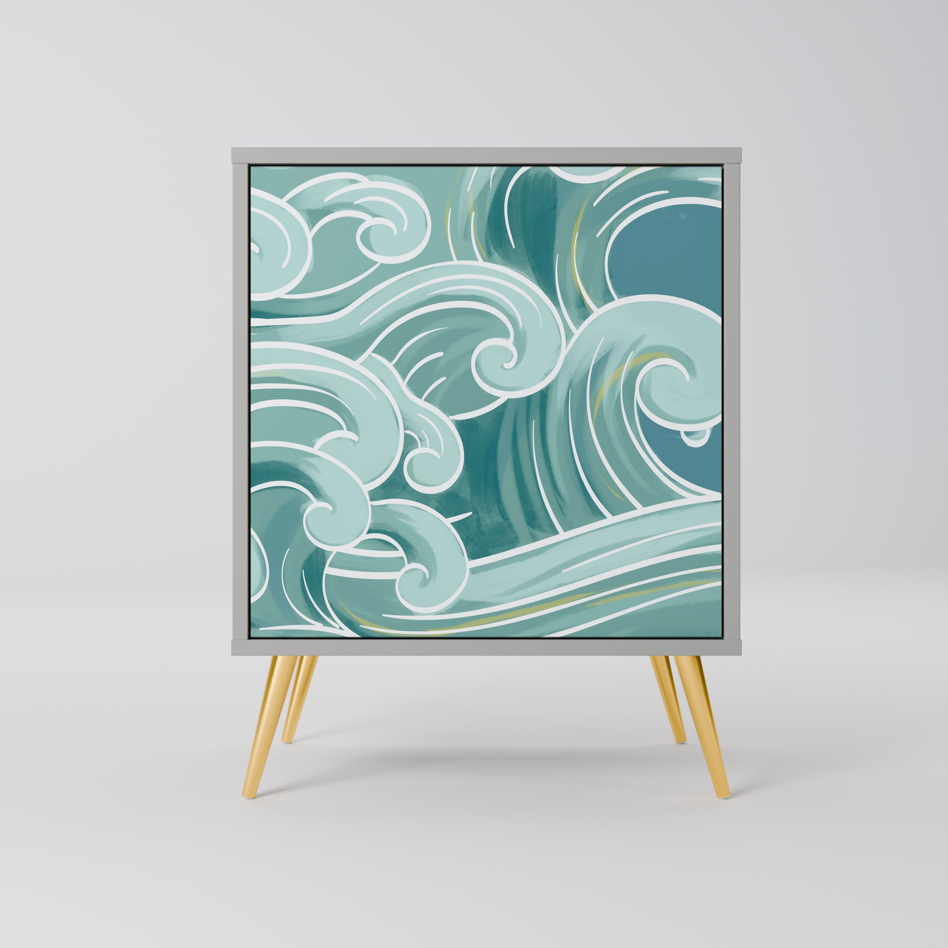This compact yet remarkably elegant piece of furniture impresses with its minimalist design, perfectly fitting into both modern and classic interiors. The subdued grey color of the body gives the furniture a subtle yet distinctive character, while the fronts with a unique print add an artistic touch.