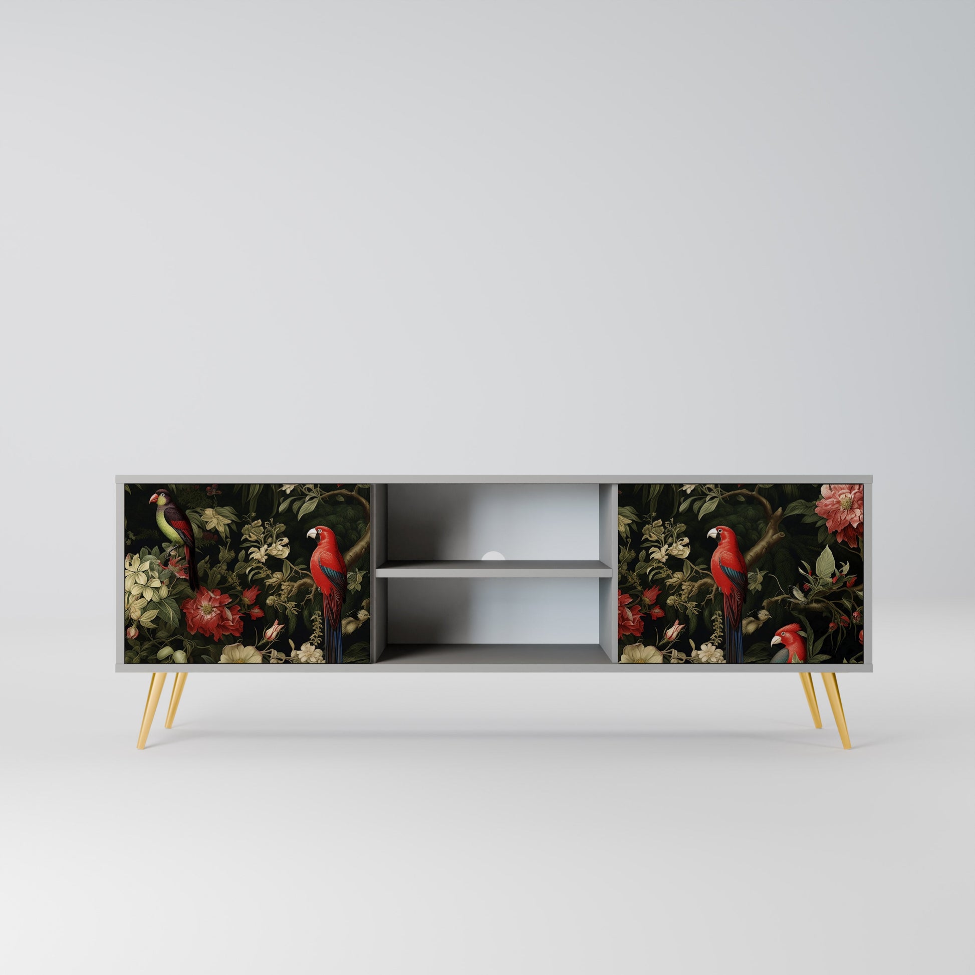 The grey body lends the TV stand a contemporary, refined look, while the fronts with an exceptional print capture attention, becoming the focal point of any room. The spacious interior provides room for electronic devices, cables, remotes, and other accessories, helping you maintain order and organization.