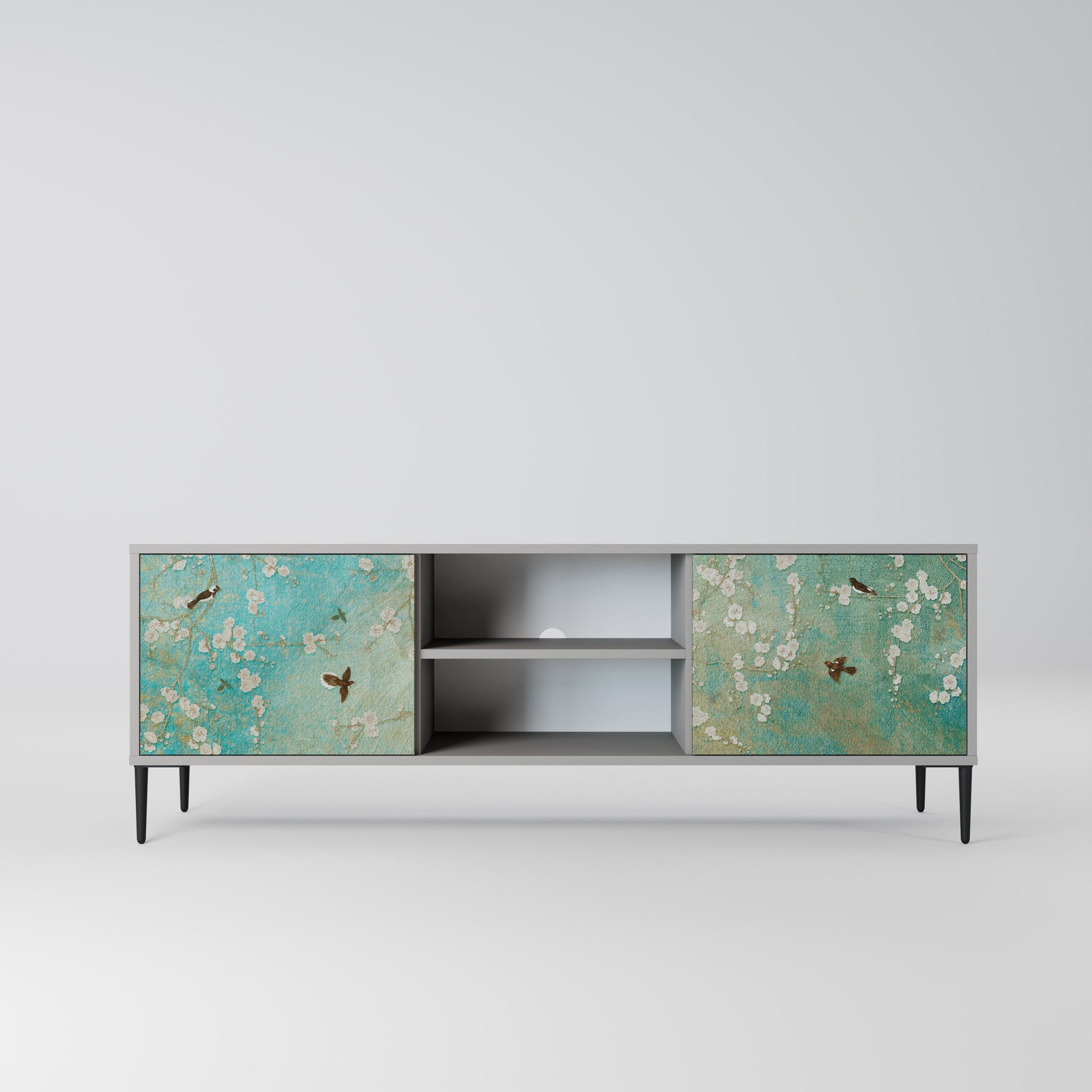 The grey body lends the TV stand a contemporary, refined look, while the fronts with an exceptional print capture attention, becoming the focal point of any room. The spacious interior provides room for electronic devices, cables, remotes, and other accessories, helping you maintain order and organization.