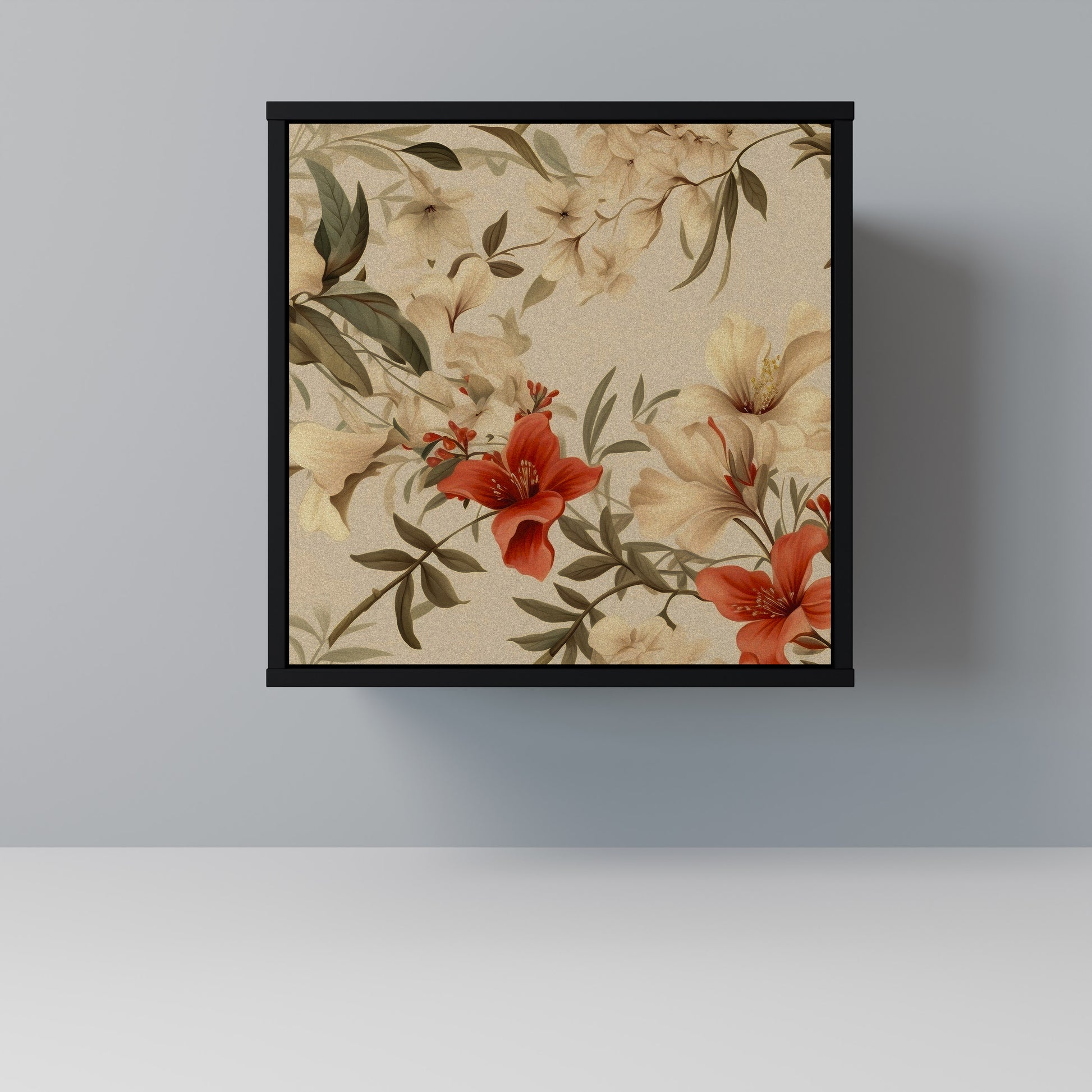 This compact yet remarkably elegant piece of furniture impresses with its minimalist design, perfectly fitting into both modern and classic interiors. The black body emphasizes the furniture’s bold character, while the fronts with a unique print add an artistic touch.