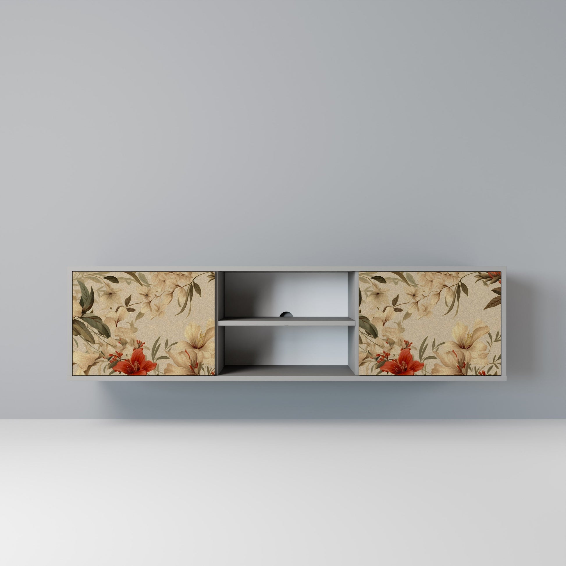 The grey body lends the TV stand a contemporary, refined look, while the fronts with an exceptional print capture attention, becoming the focal point of any room. The spacious interior provides room for electronic devices, cables, remotes, and other accessories, helping you maintain order and organization.