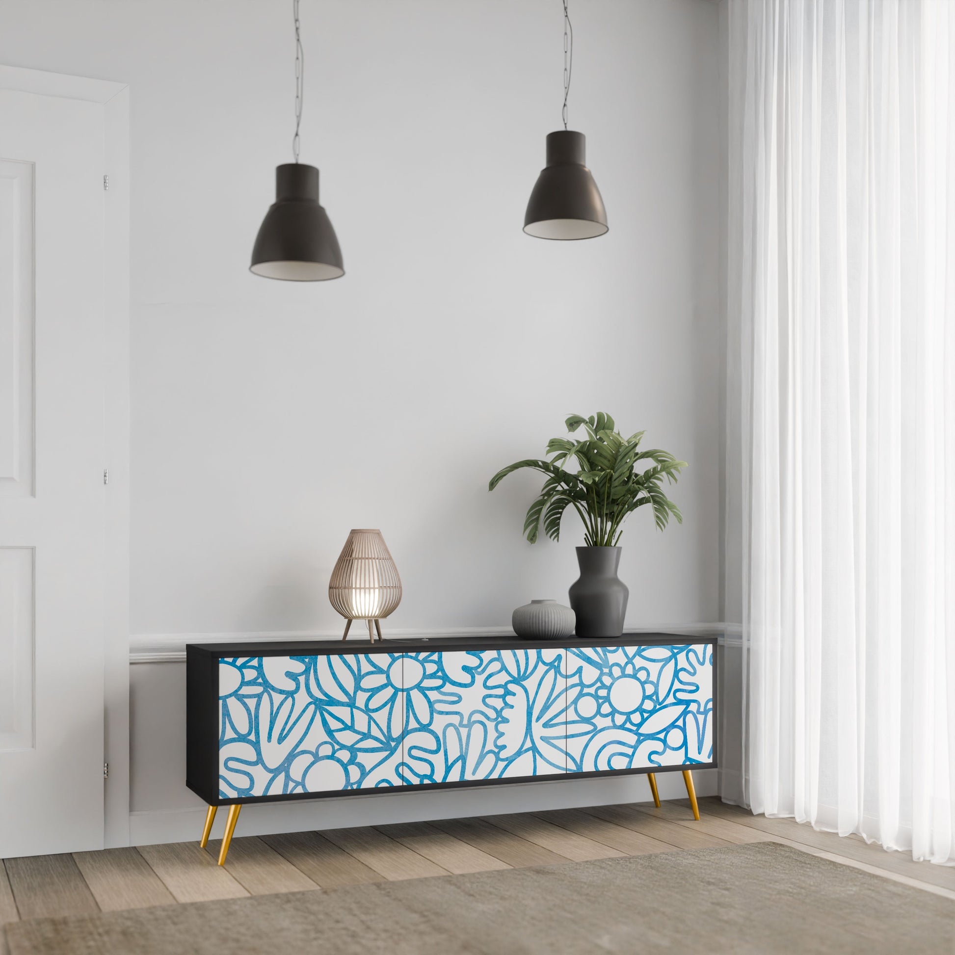 The black body of the stand creates a bold, modern accent that pairs beautifully with industrial and minimalist arrangements. The fronts with a designer print add character and uniqueness, making this piece not only practical but also a standout decorative element.