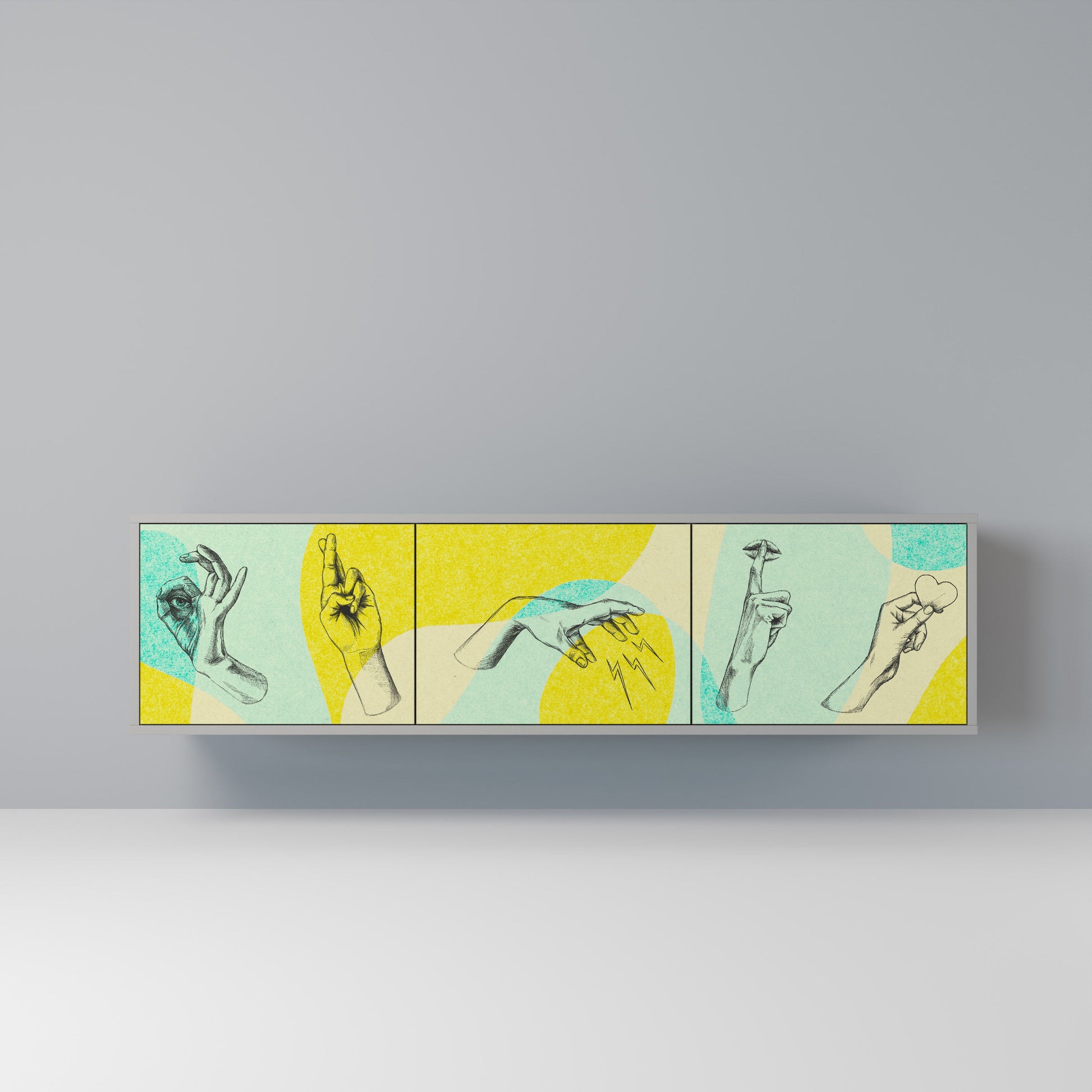 The grey body of the stand creates a refined, modern accent that pairs beautifully with industrial and minimalist arrangements. The fronts with a designer print add character and uniqueness, making this piece not only practical but also a standout decorative element.