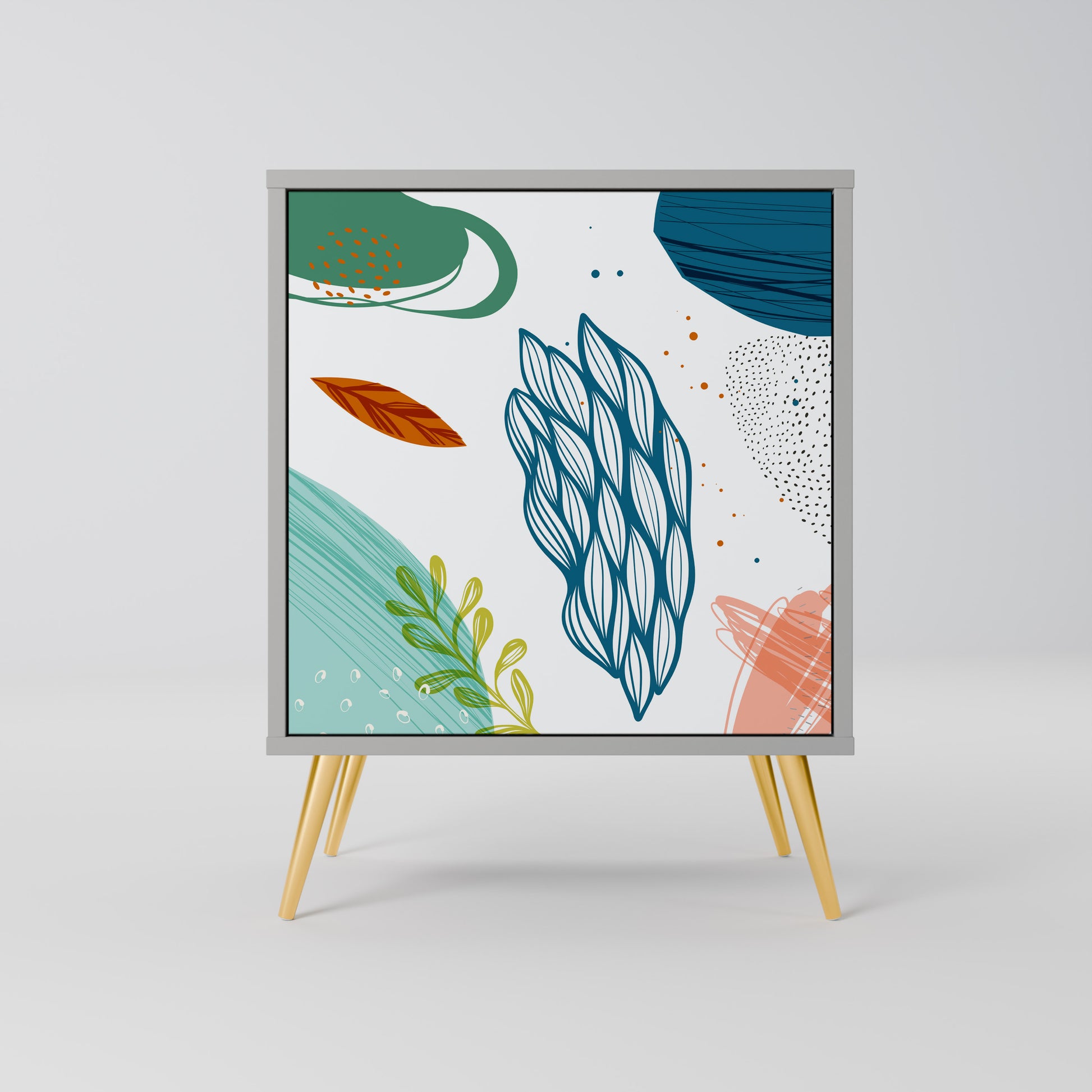 This compact yet remarkably elegant piece of furniture impresses with its minimalist design, perfectly fitting into both modern and classic interiors. The subdued grey color of the body gives the furniture a subtle yet distinctive character, while the fronts with a unique print add an artistic touch.