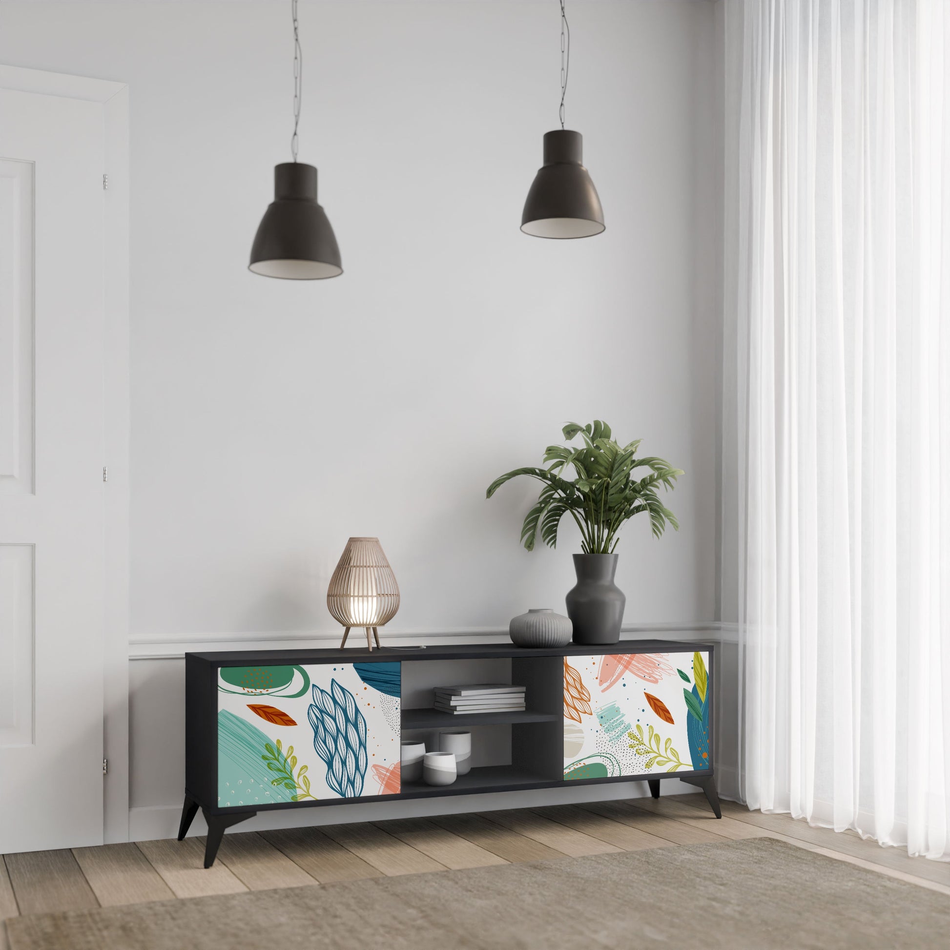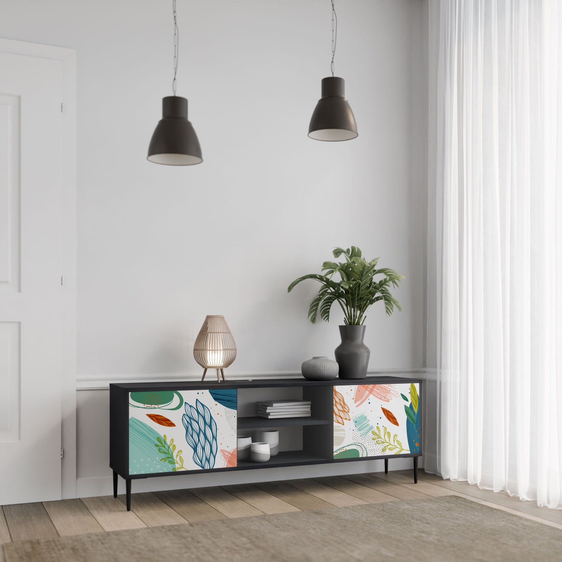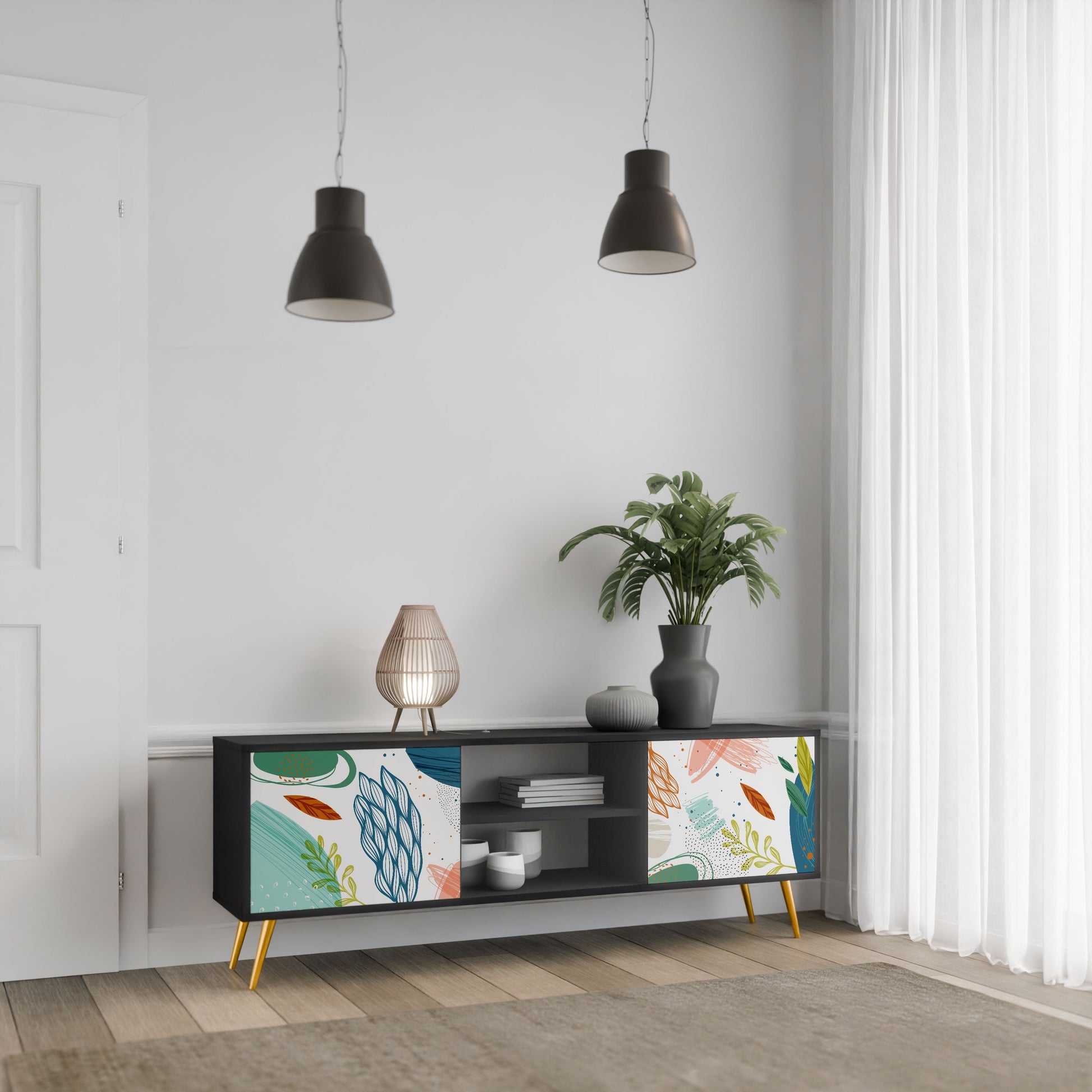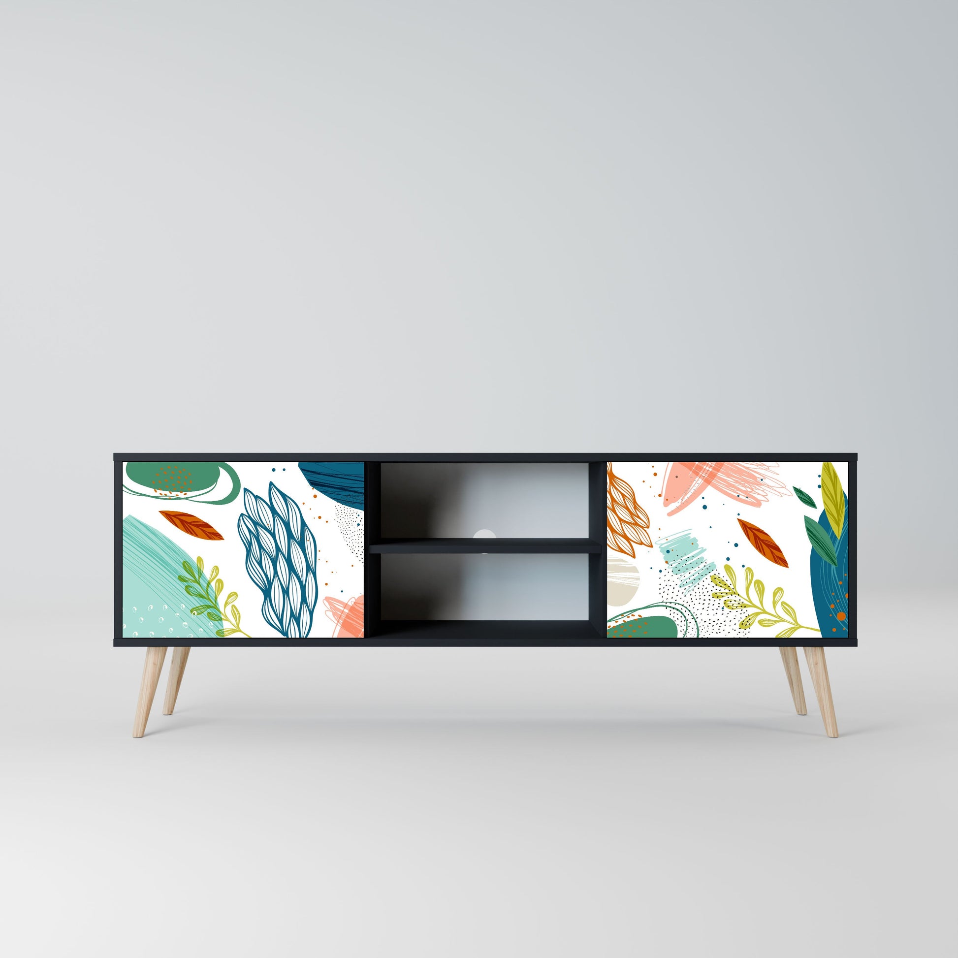 The black body gives the TV stand an elegant, modern look, while the fronts with an exceptional print draw attention, making it the focal point of any room. The spacious interior provides room for electronic devices, cables, remotes, and other accessories, helping you maintain order and organization.