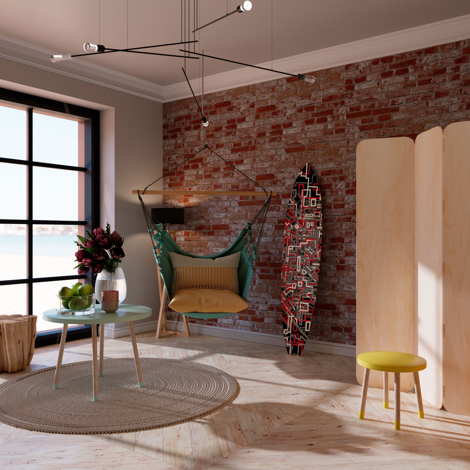The surfboard has been designed with maximum functionality and arrangement flexibility in mind. It can be hung vertically or horizontally, or displayed freestanding by leaning it against a wall, dresser, or shelf. This makes it easy to adapt the piece to the character of the space and changing interior needs.