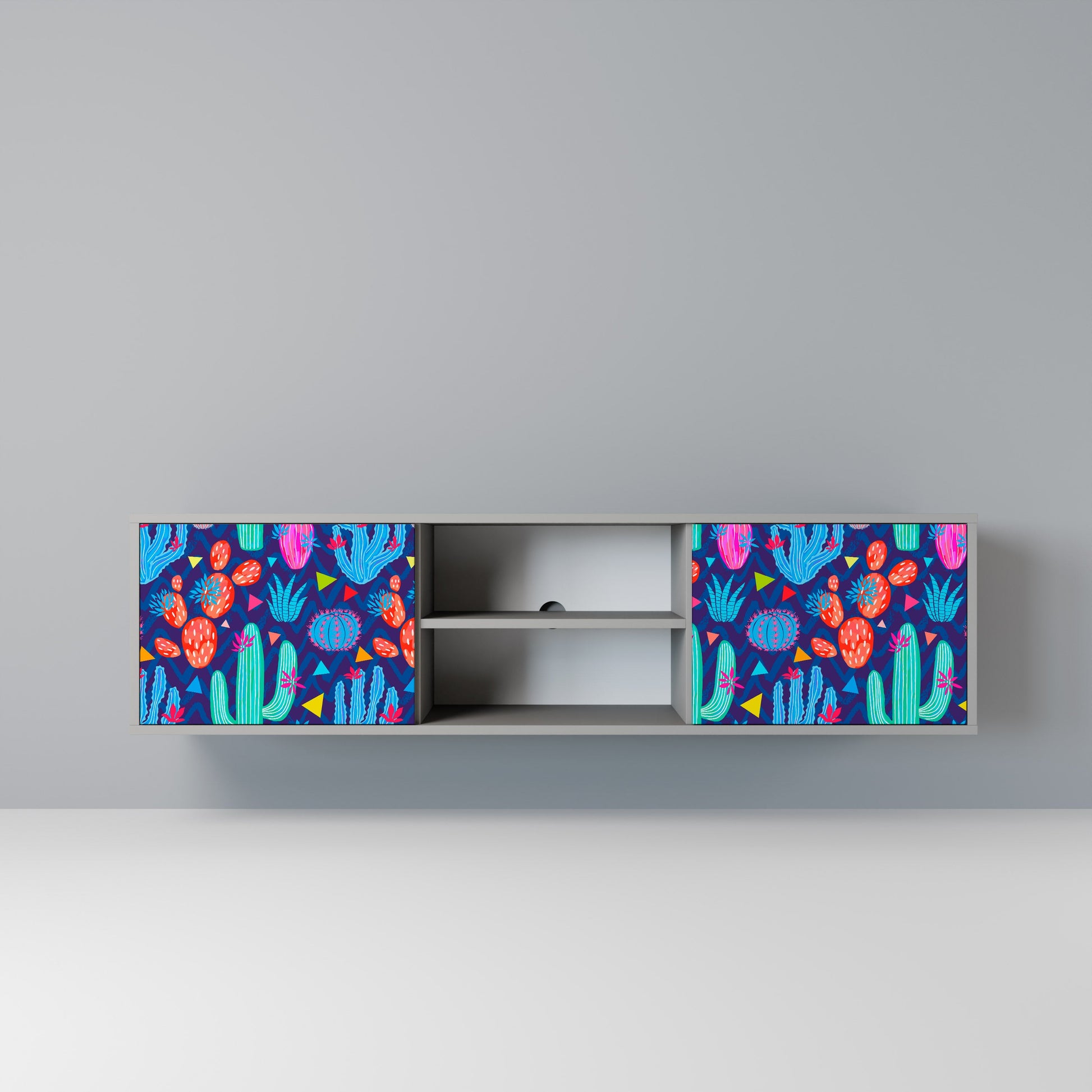 The grey body lends the TV stand a contemporary, refined look, while the fronts with an exceptional print capture attention, becoming the focal point of any room. The spacious interior provides room for electronic devices, cables, remotes, and other accessories, helping you maintain order and organization.