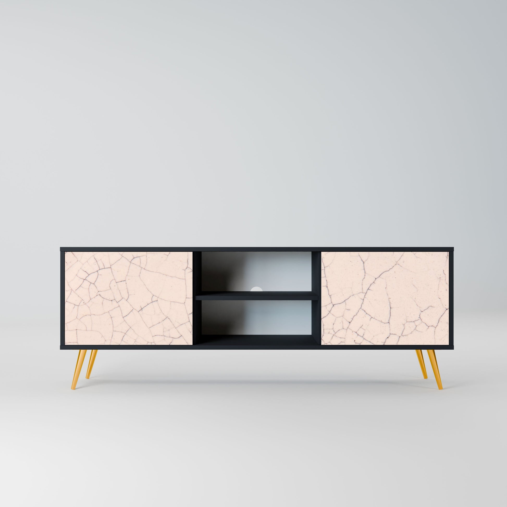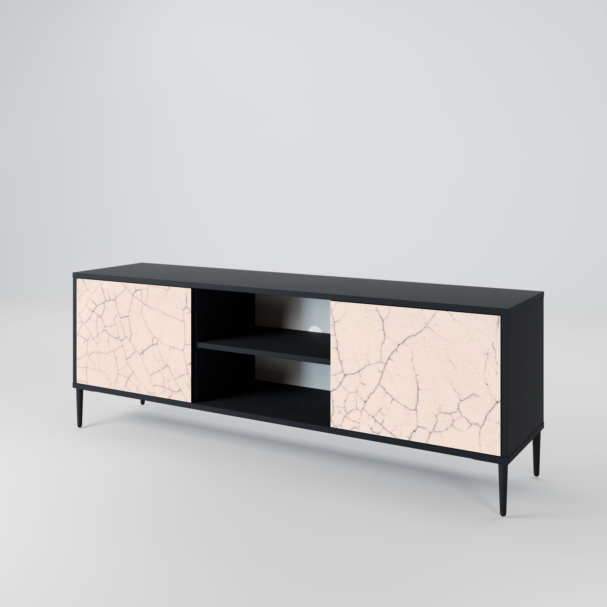 The black body gives the TV stand an elegant, modern look, while the fronts with an exceptional print draw attention, making it the focal point of any room. The spacious interior provides room for electronic devices, cables, remotes, and other accessories, helping you maintain order and organization.