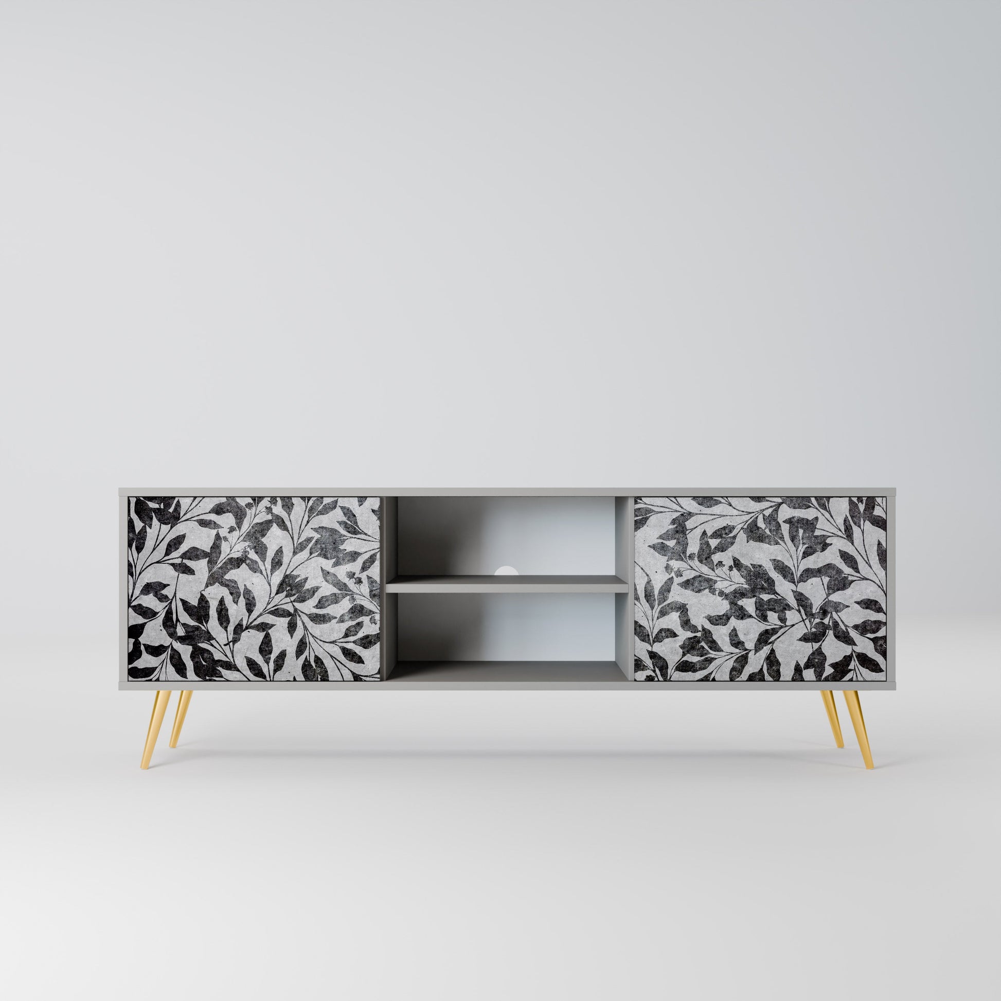 The grey body lends the TV stand a contemporary, refined look, while the fronts with an exceptional print capture attention, becoming the focal point of any room. The spacious interior provides room for electronic devices, cables, remotes, and other accessories, helping you maintain order and organization.