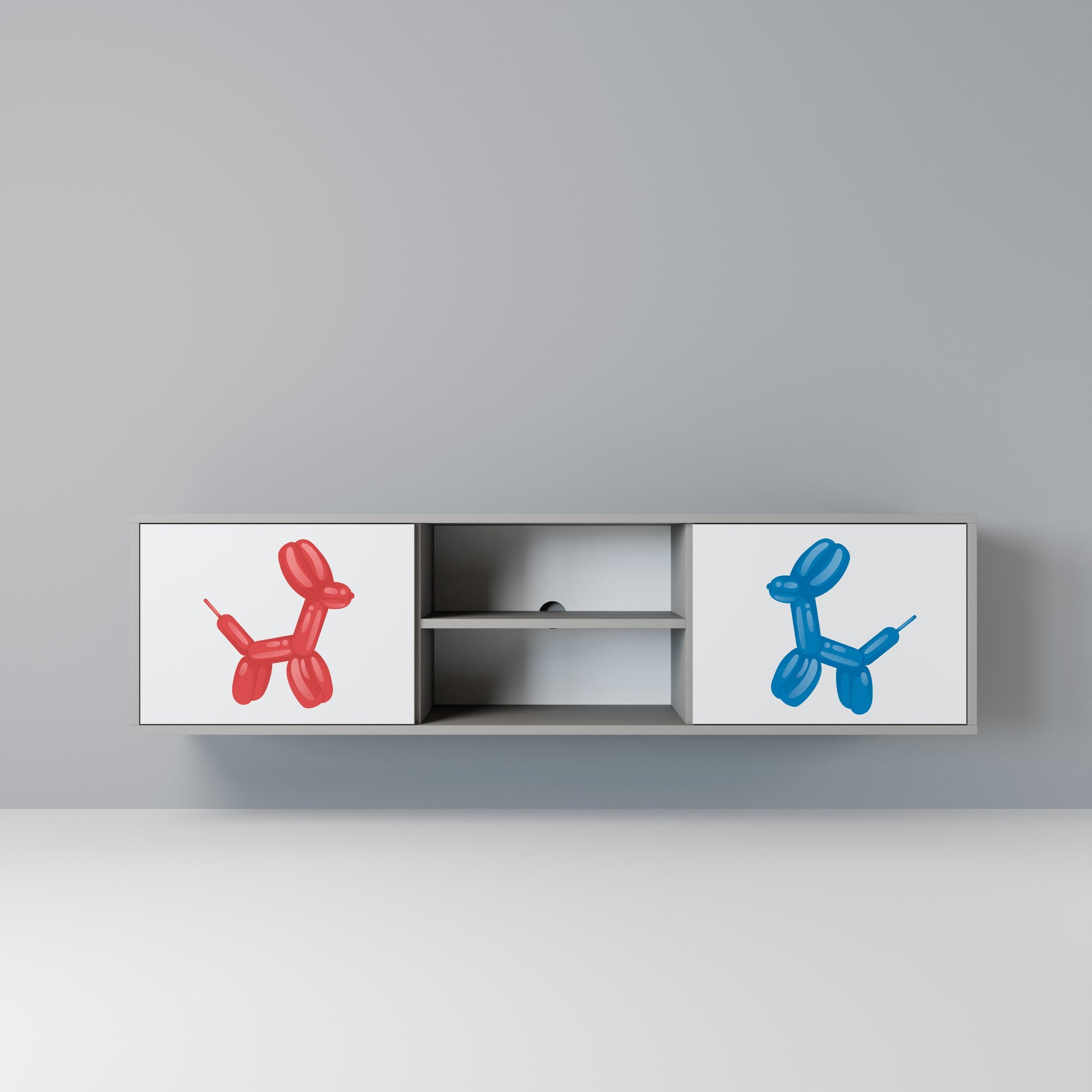 The grey body lends the TV stand a contemporary, refined look, while the fronts with an exceptional print capture attention, becoming the focal point of any room. The spacious interior provides room for electronic devices, cables, remotes, and other accessories, helping you maintain order and organization.