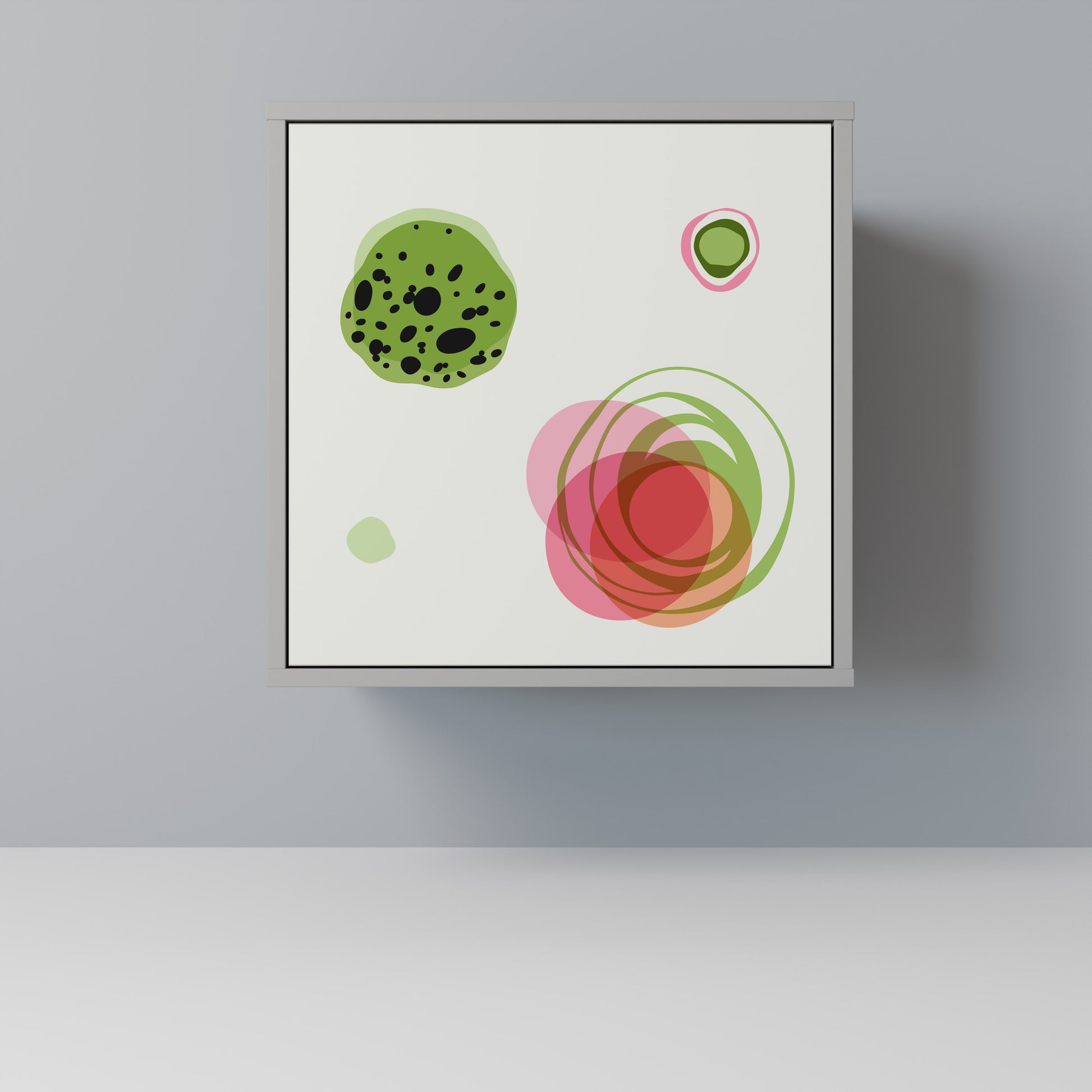 This compact yet remarkably elegant piece of furniture impresses with its minimalist design, perfectly fitting into both modern and classic interiors. The subdued grey color of the body gives the furniture a subtle yet distinctive character, while the fronts with a unique print add an artistic touch.