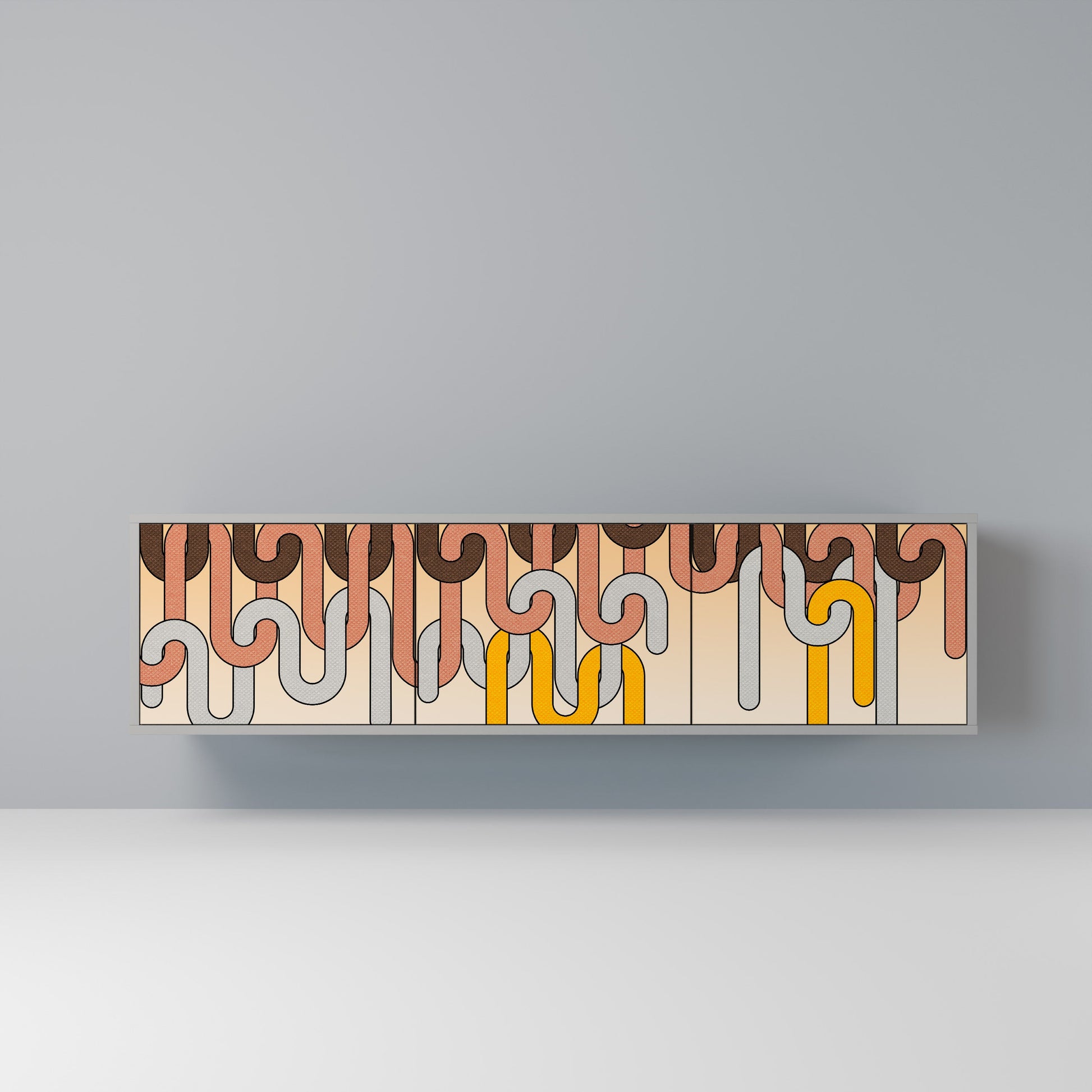 The grey body of the stand creates a refined, modern accent that pairs beautifully with industrial and minimalist arrangements. The fronts with a designer print add character and uniqueness, making this piece not only practical but also a standout decorative element.