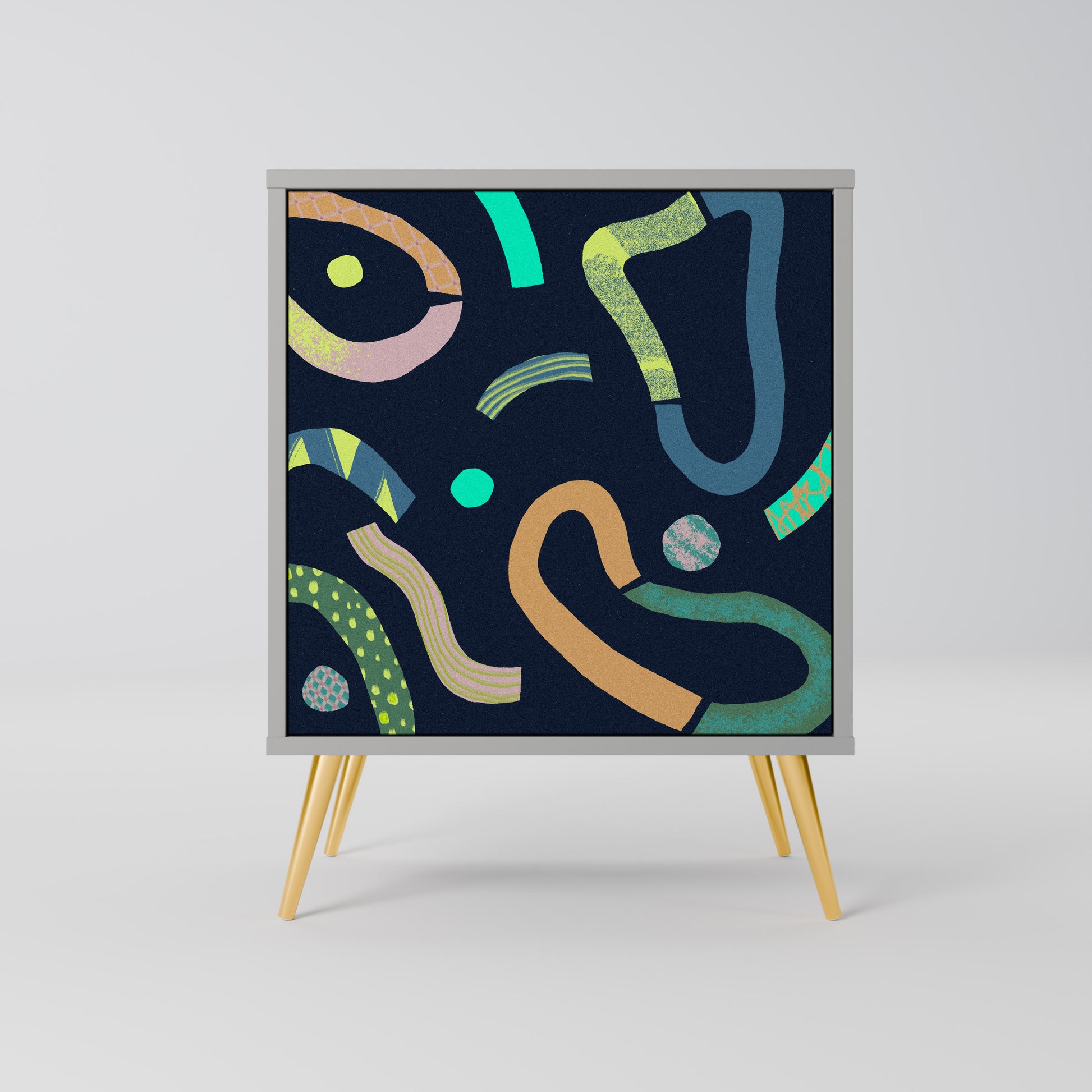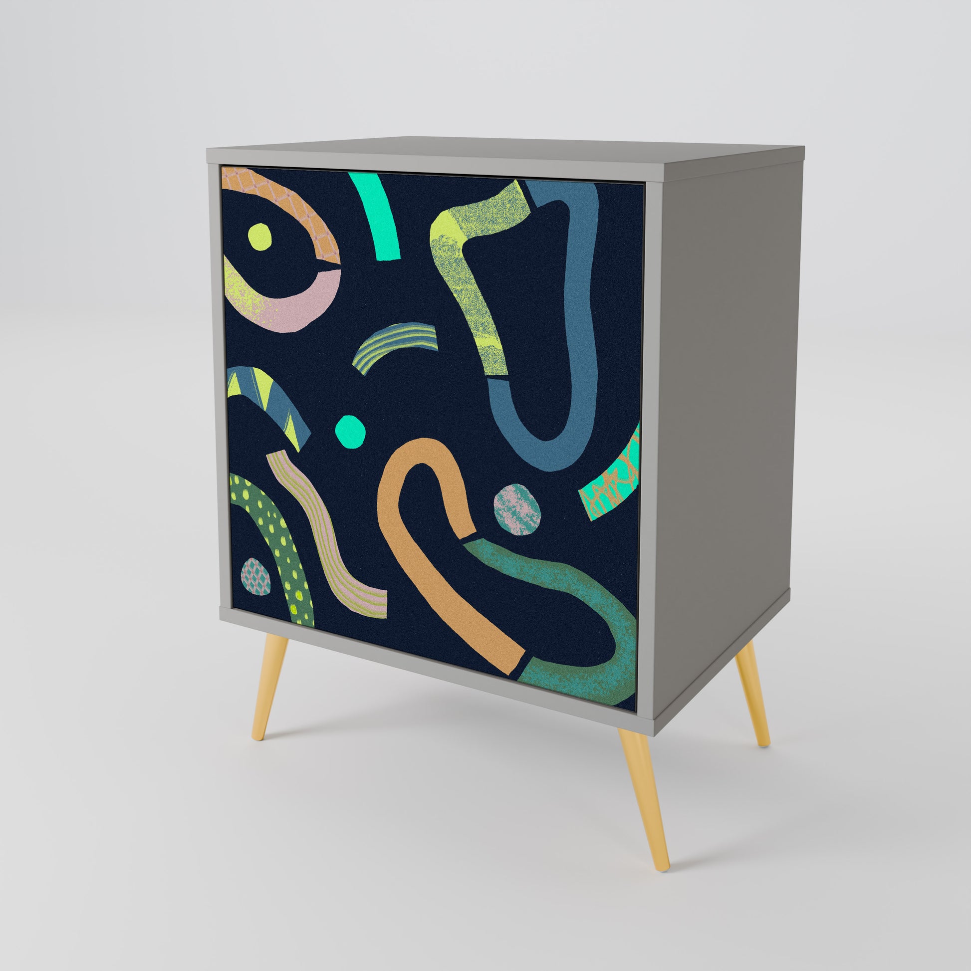 This compact yet remarkably elegant piece of furniture impresses with its minimalist design, perfectly fitting into both modern and classic interiors. The subdued grey color of the body gives the furniture a subtle yet distinctive character, while the fronts with a unique print add an artistic touch.