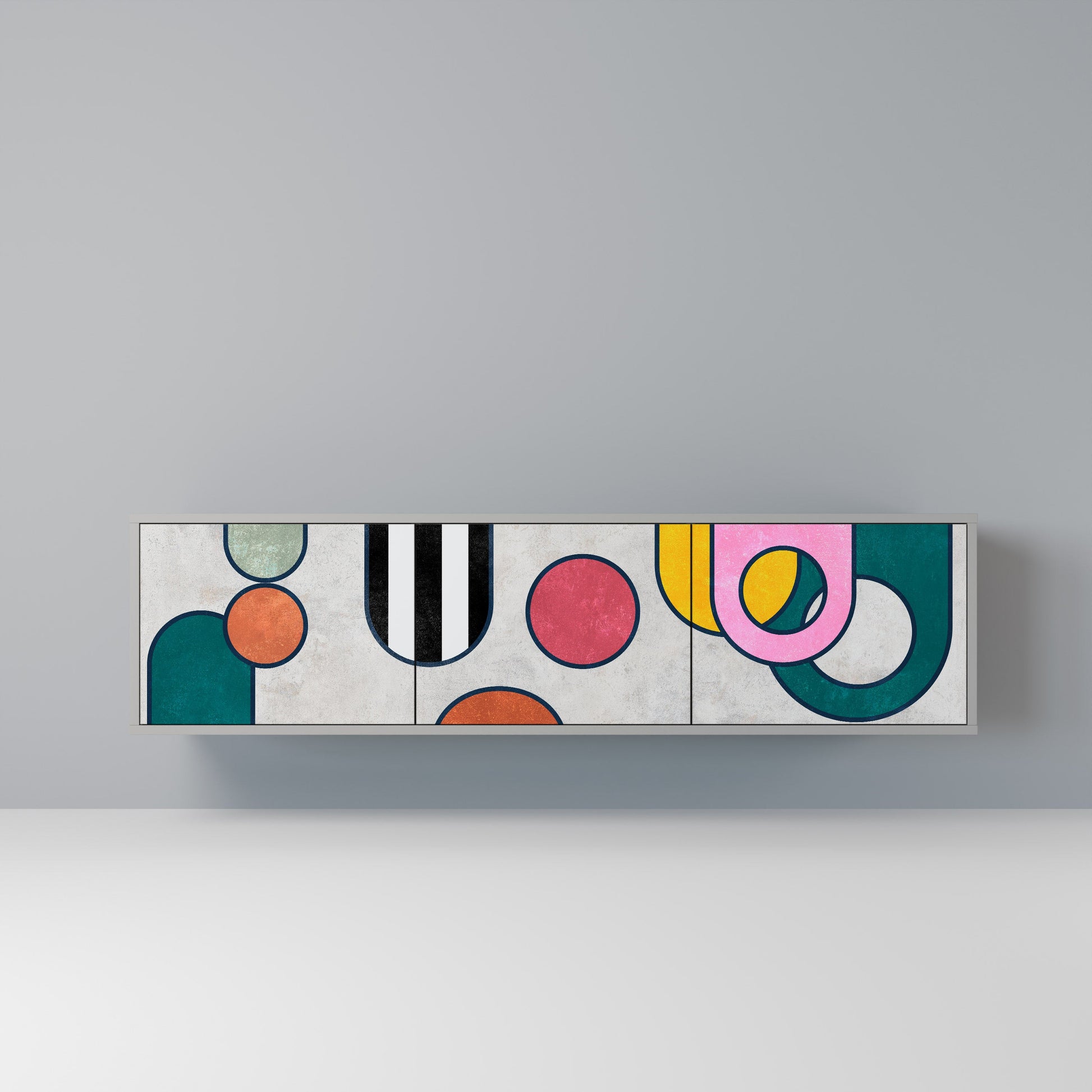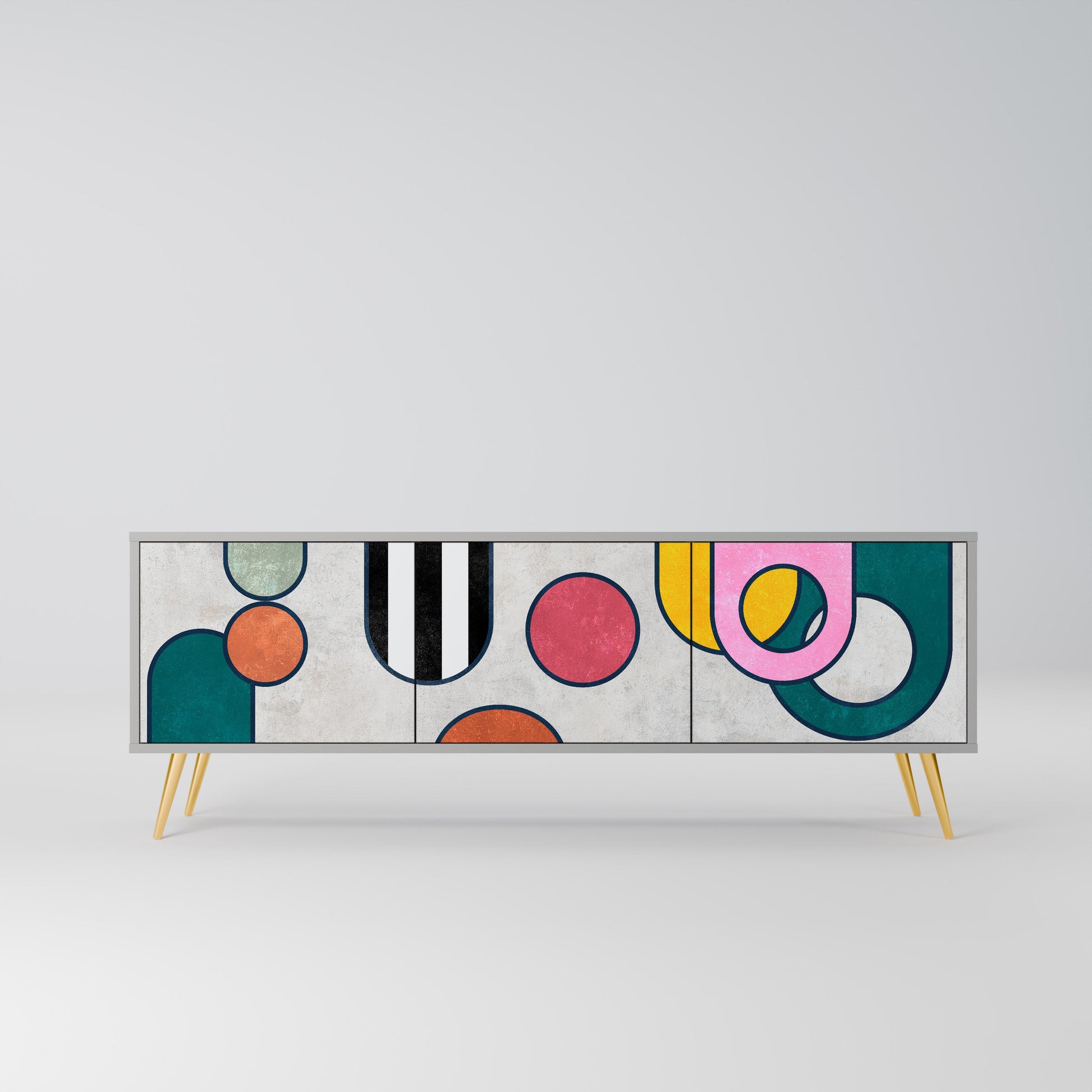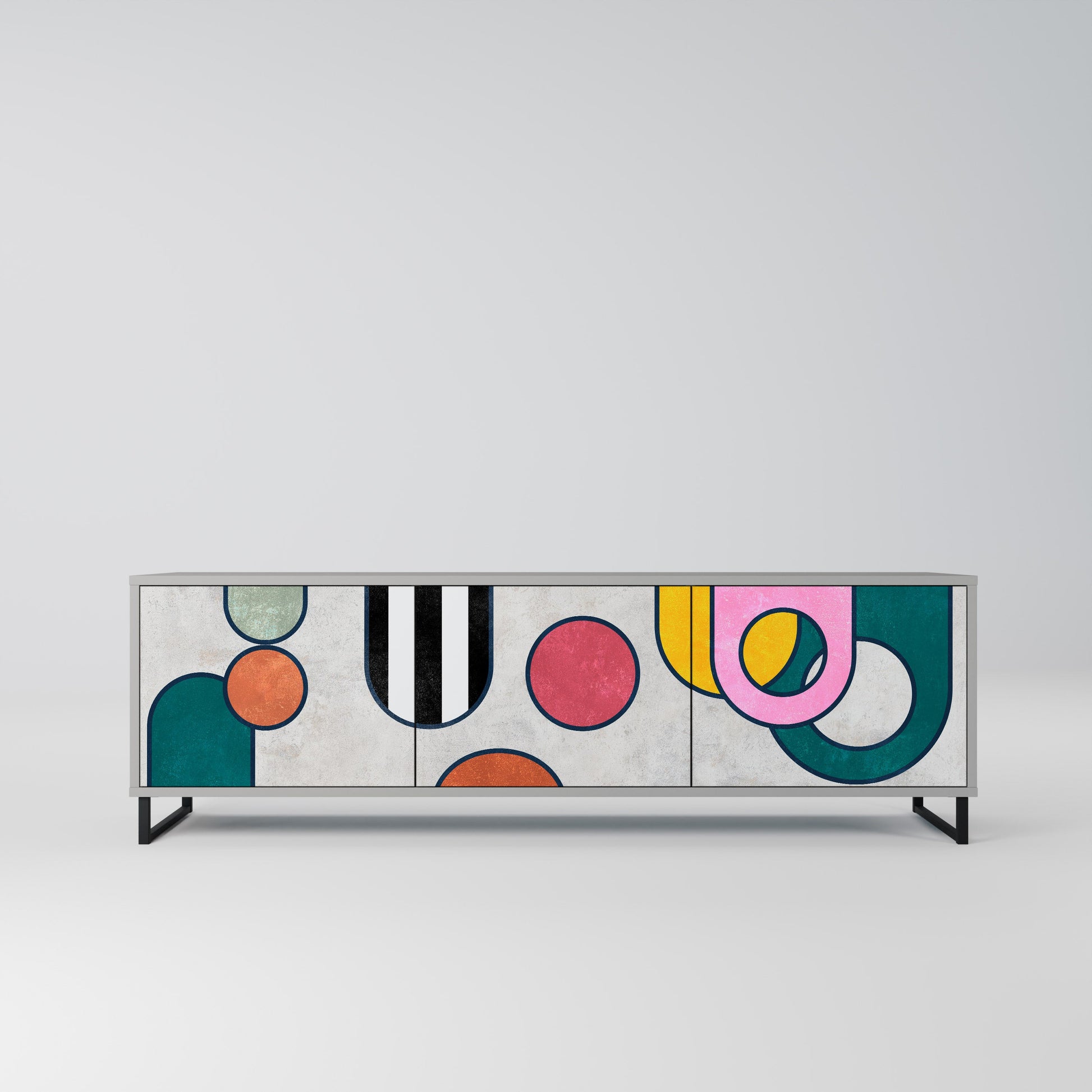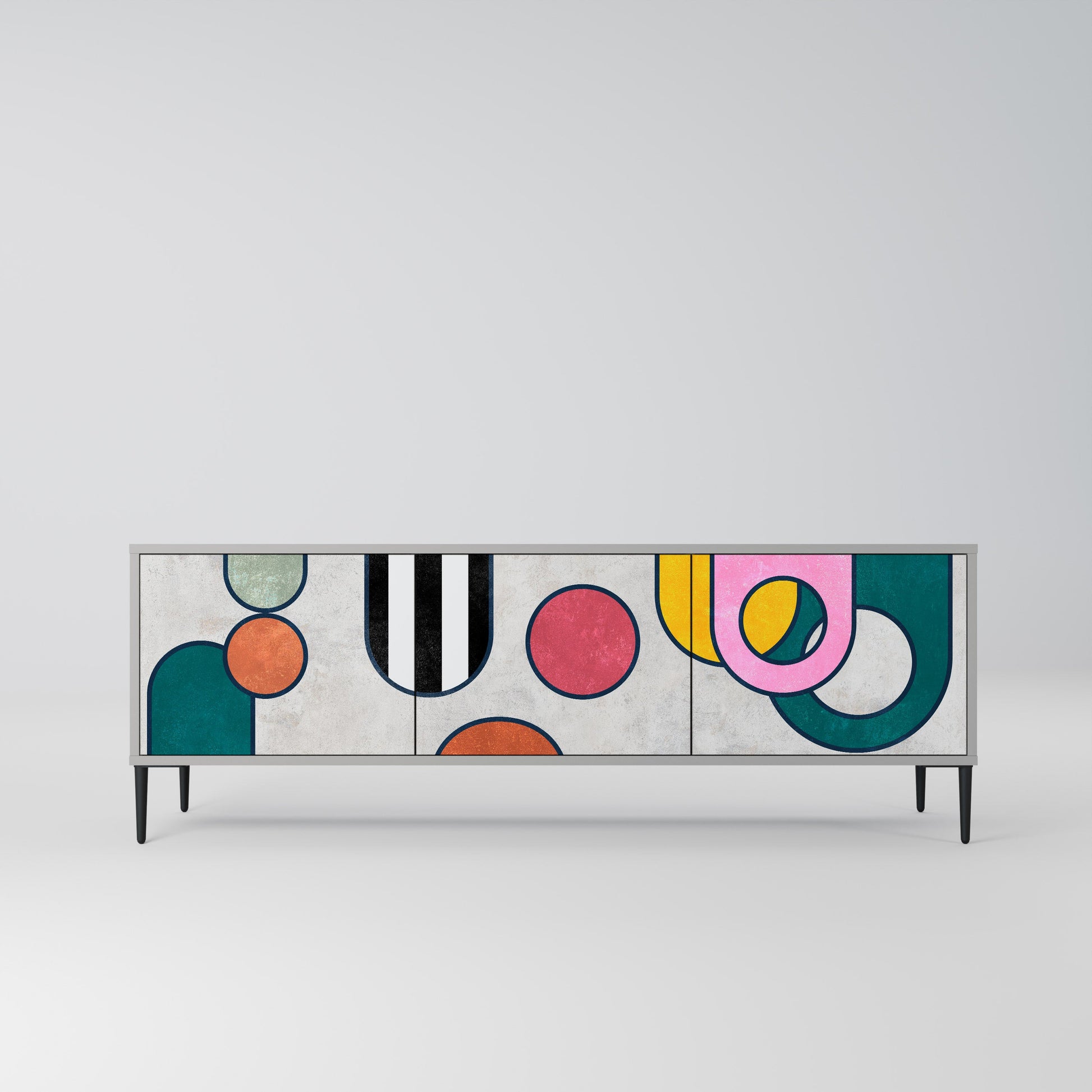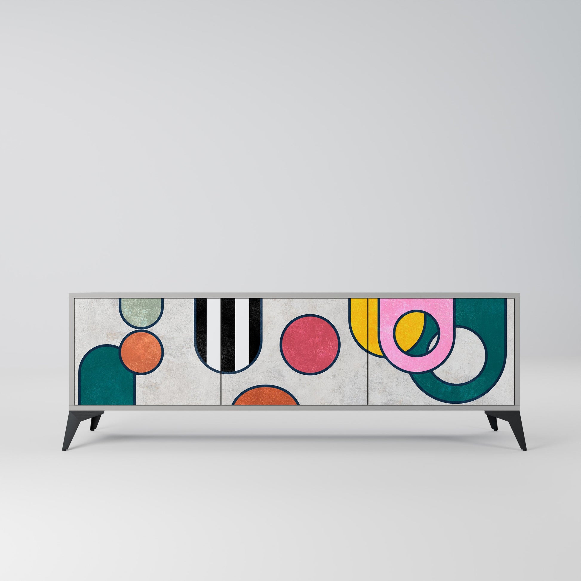 The grey body of the stand creates a refined, modern accent that pairs beautifully with industrial and minimalist arrangements. The fronts with a designer print add character and uniqueness, making this piece not only practical but also a standout decorative element.