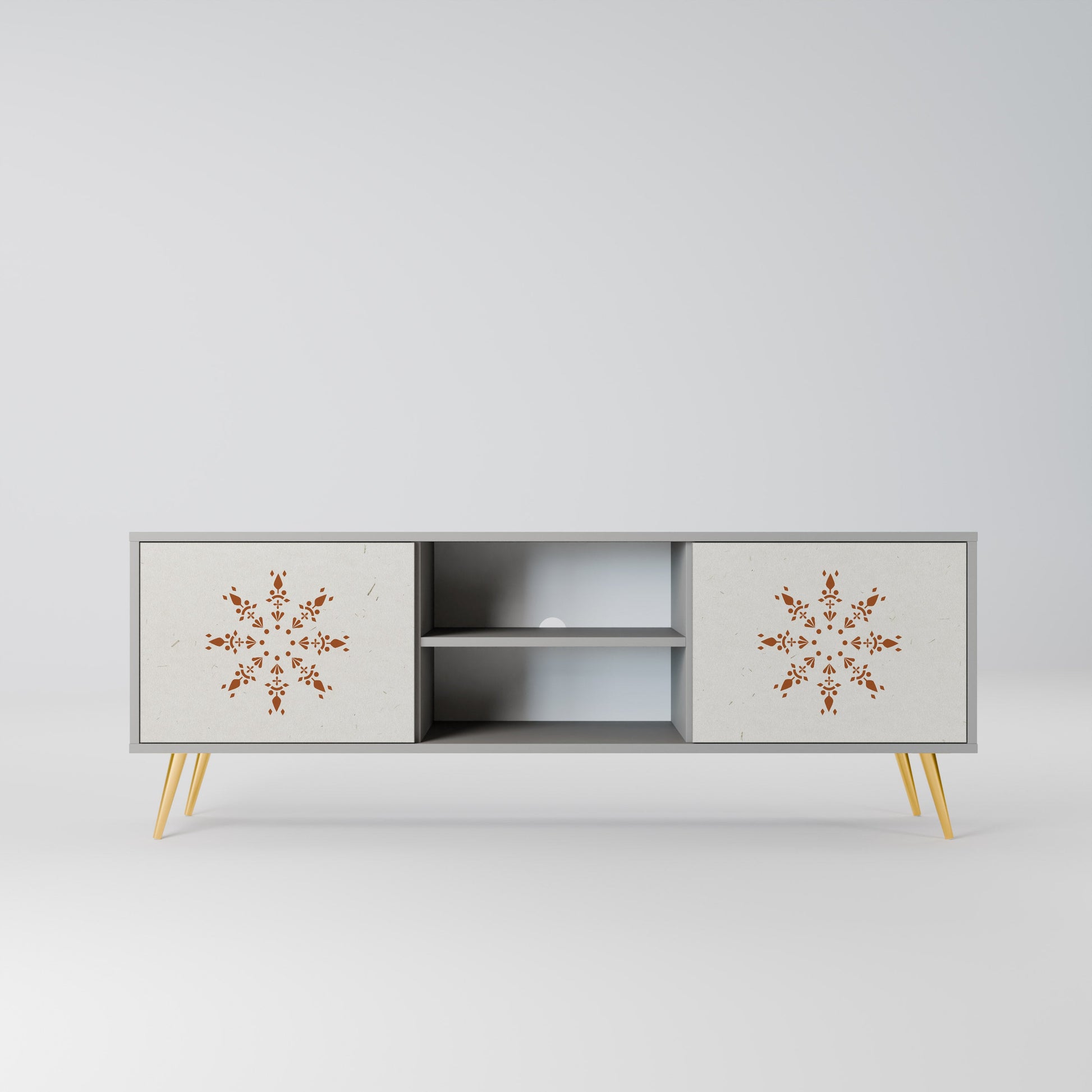 The grey body lends the TV stand a contemporary, refined look, while the fronts with an exceptional print capture attention, becoming the focal point of any room. The spacious interior provides room for electronic devices, cables, remotes, and other accessories, helping you maintain order and organization.