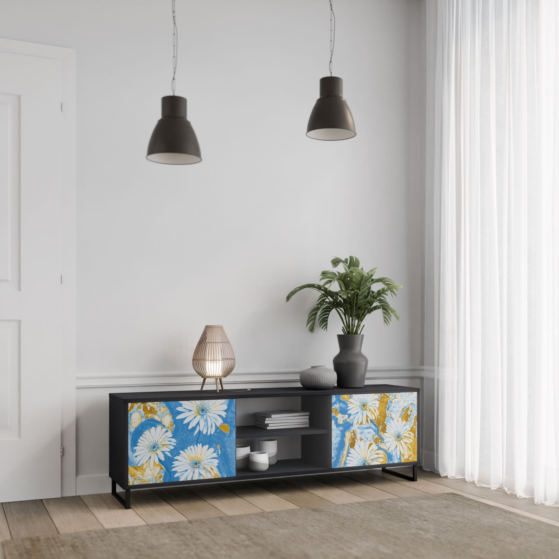 The black body gives the TV stand an elegant, modern look, while the fronts with an exceptional print draw attention, making it the focal point of any room. The spacious interior provides room for electronic devices, cables, remotes, and other accessories, helping you maintain order and organization.