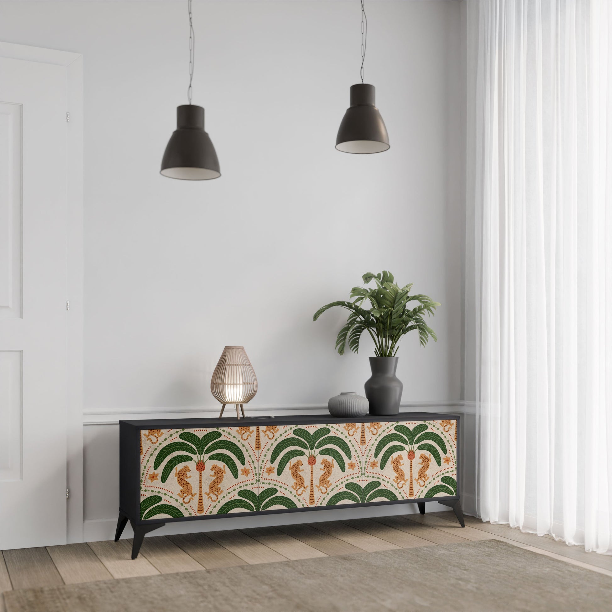 The black body of the stand creates a bold, modern accent that pairs beautifully with industrial and minimalist arrangements. The fronts with a designer print add character and uniqueness, making this piece not only practical but also a standout decorative element.