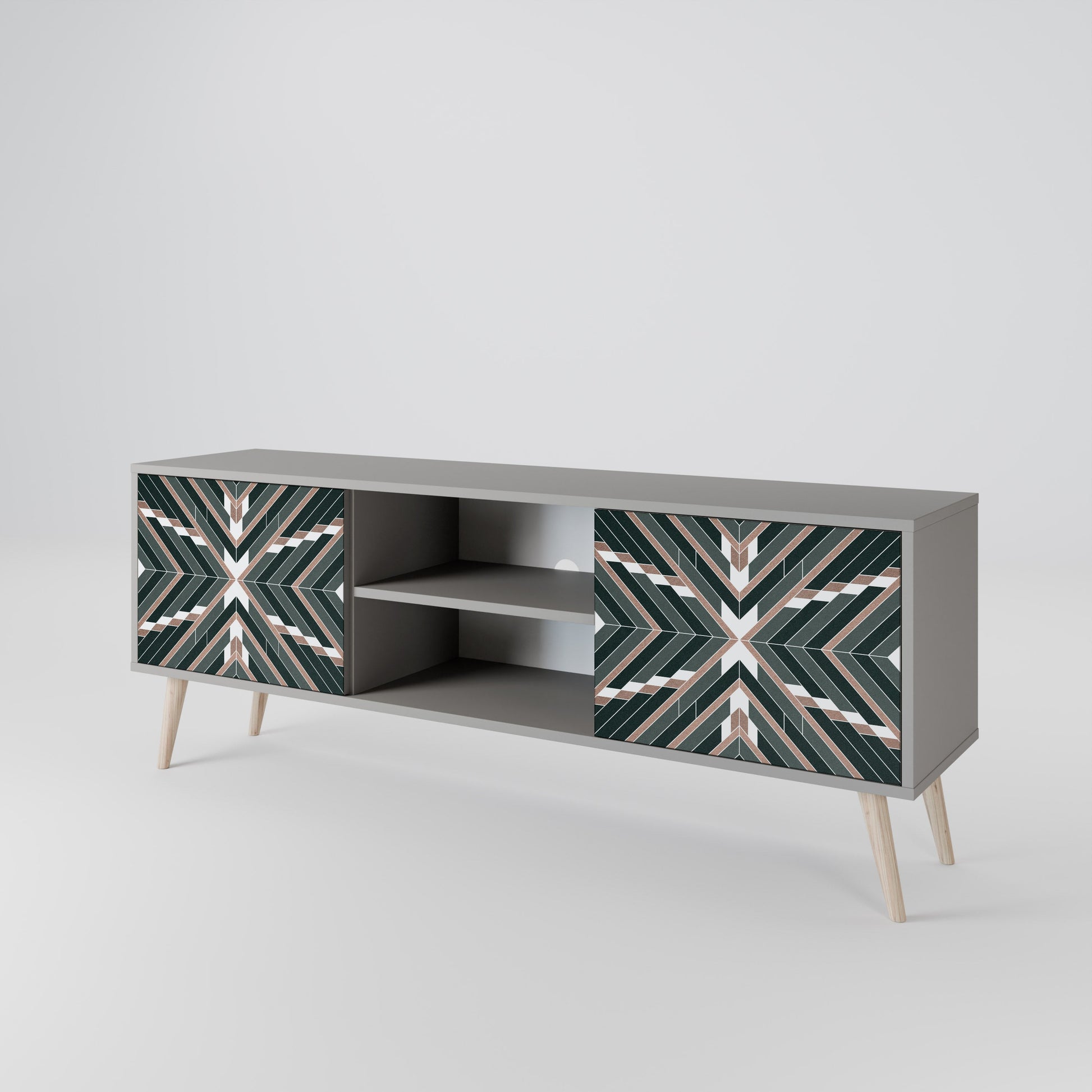 The grey body lends the TV stand a contemporary, refined look, while the fronts with an exceptional print capture attention, becoming the focal point of any room. The spacious interior provides room for electronic devices, cables, remotes, and other accessories, helping you maintain order and organization.