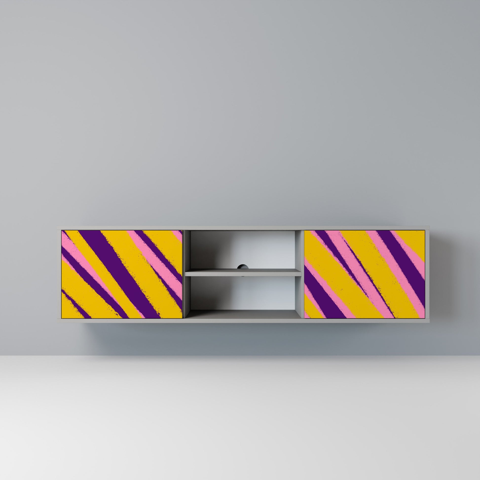 The grey body lends the TV stand a contemporary, refined look, while the fronts with an exceptional print capture attention, becoming the focal point of any room. The spacious interior provides room for electronic devices, cables, remotes, and other accessories, helping you maintain order and organization.