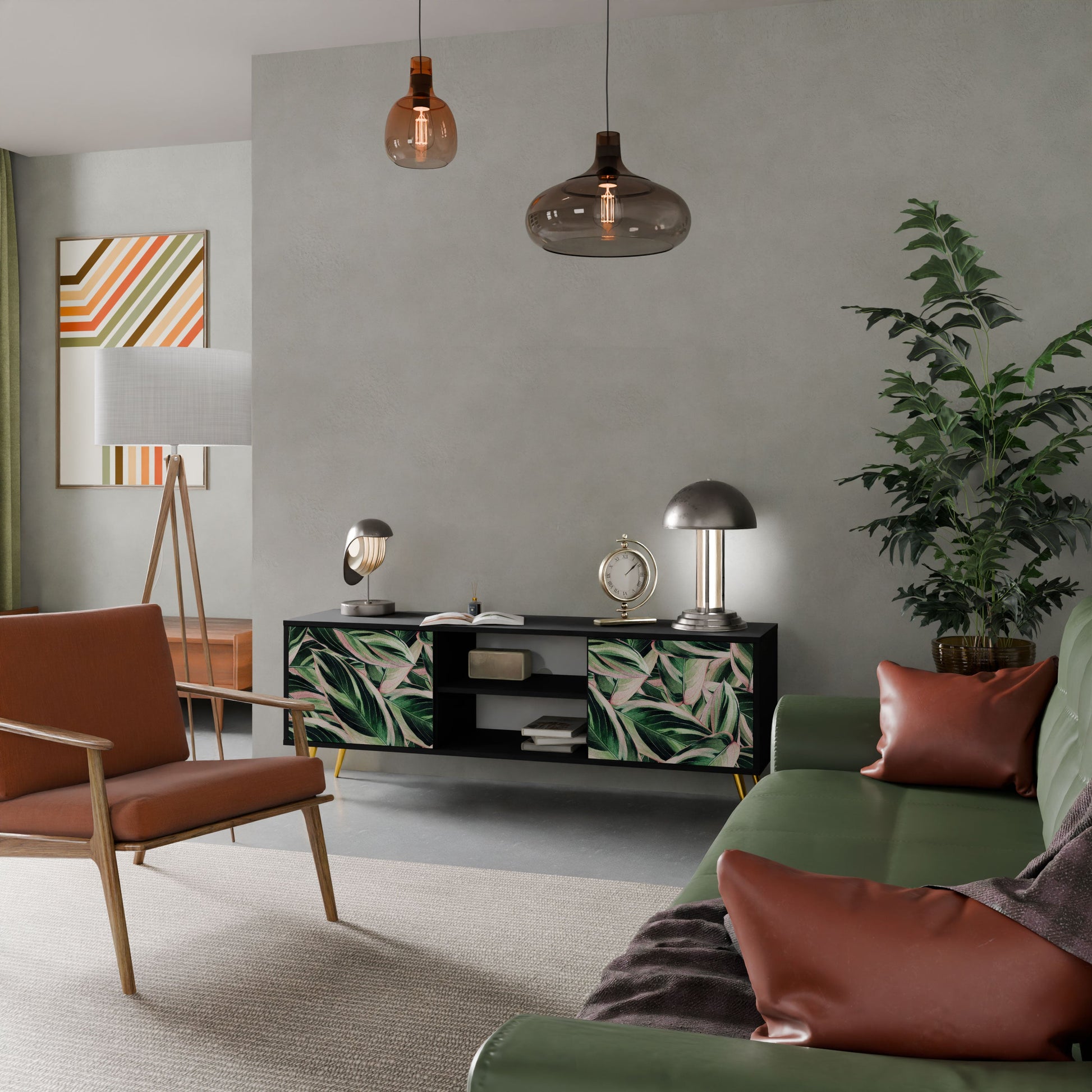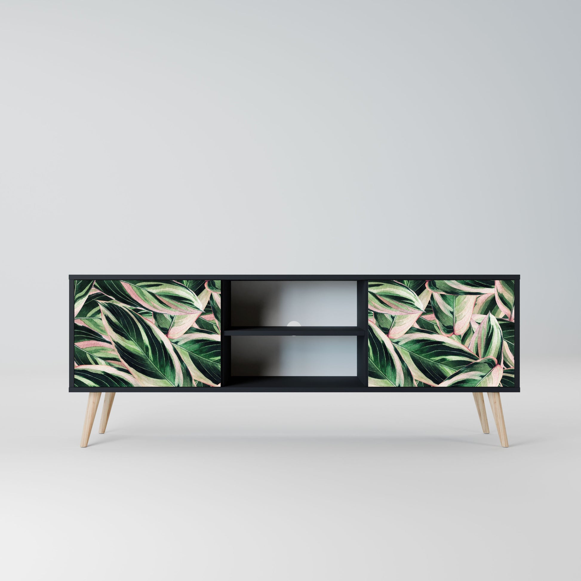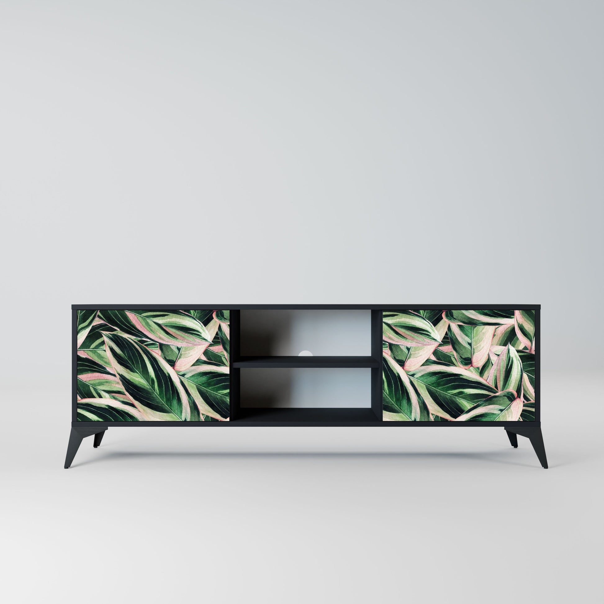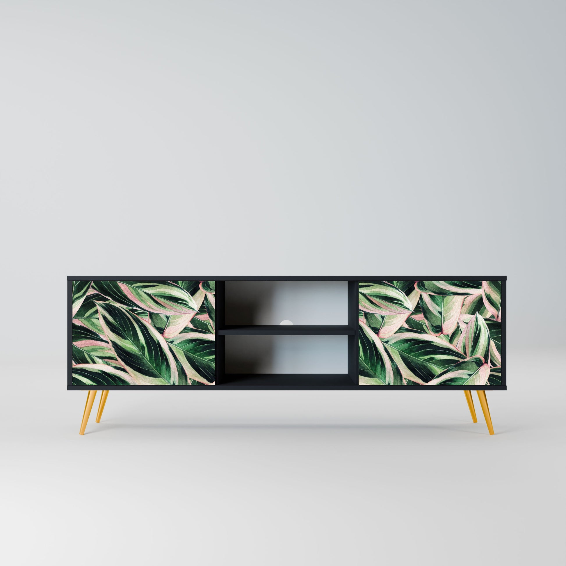 The black body gives the TV stand an elegant, modern look, while the fronts with an exceptional print draw attention, making it the focal point of any room. The spacious interior provides room for electronic devices, cables, remotes, and other accessories, helping you maintain order and organization.
