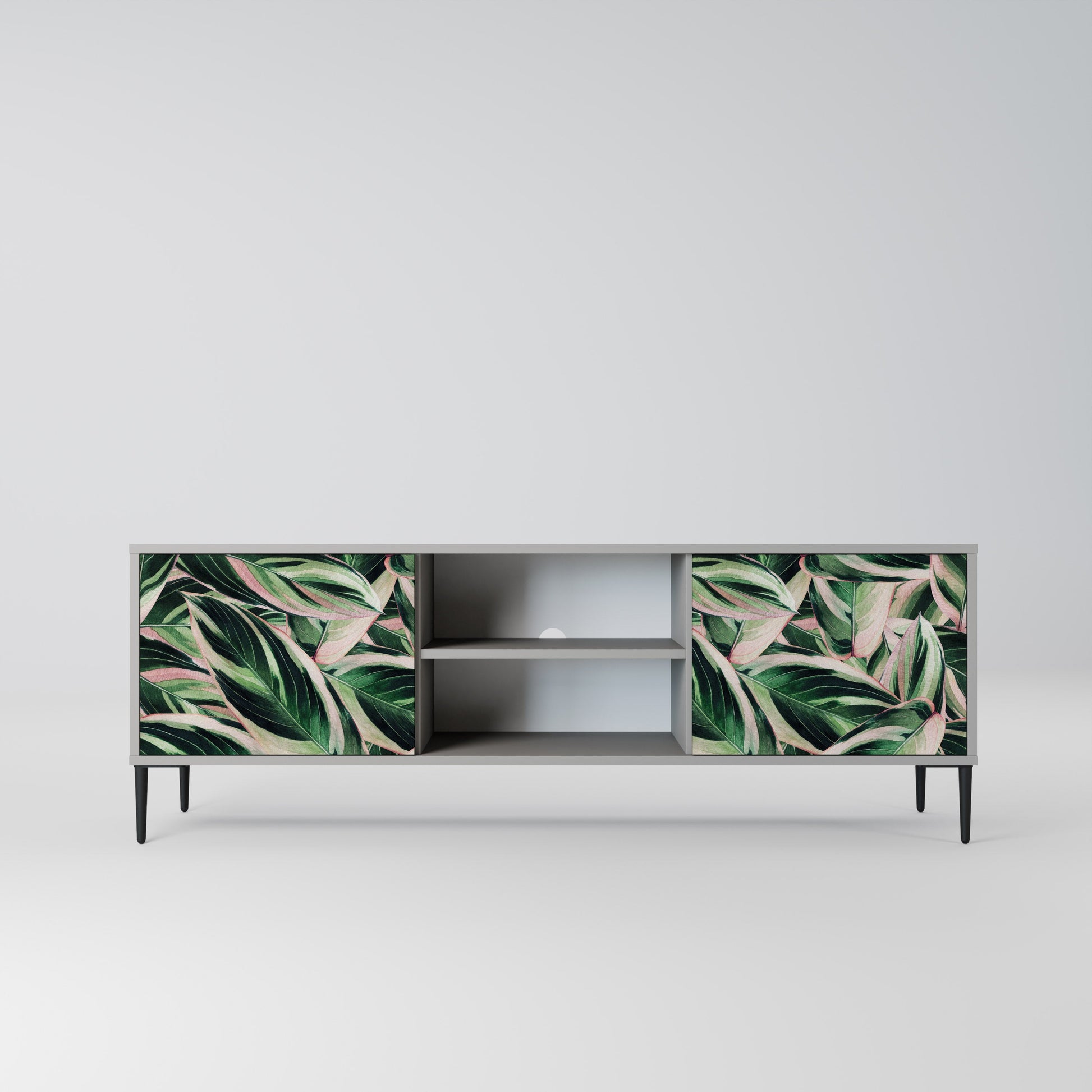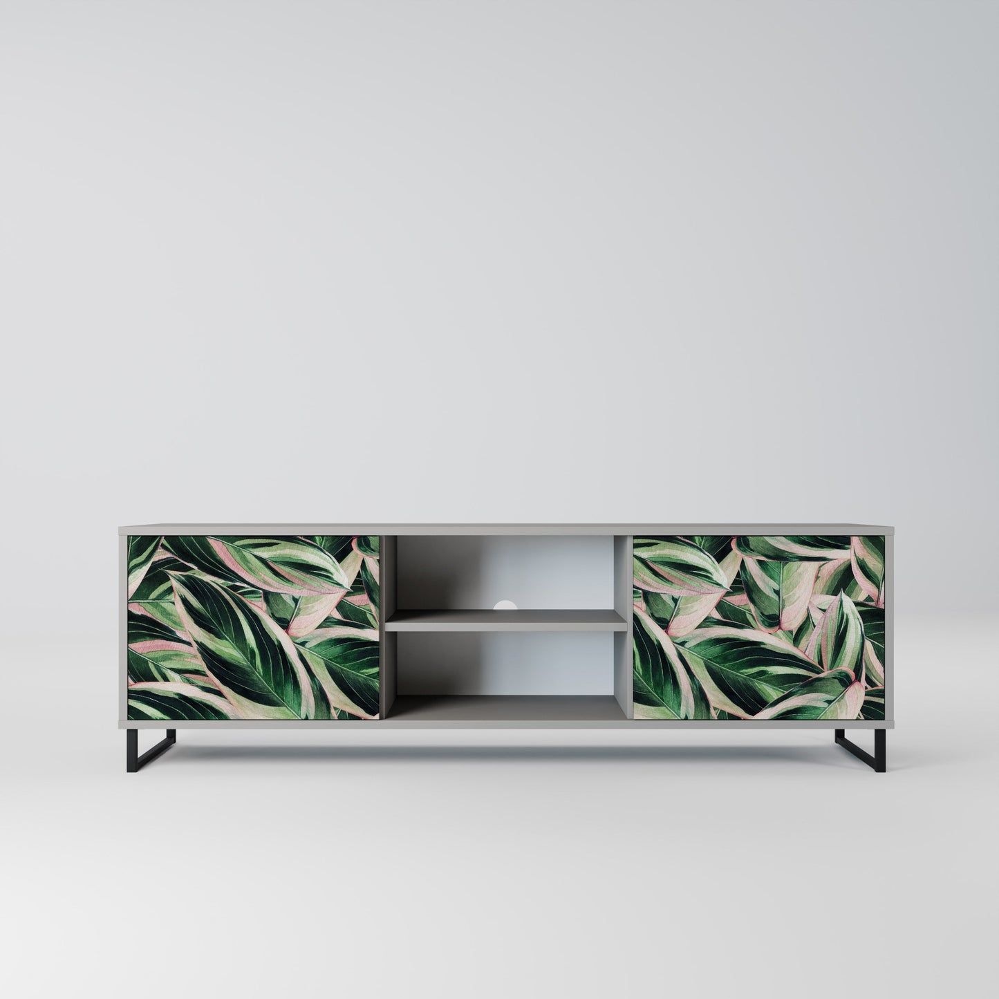 The grey body lends the TV stand a contemporary, refined look, while the fronts with an exceptional print capture attention, becoming the focal point of any room. The spacious interior provides room for electronic devices, cables, remotes, and other accessories, helping you maintain order and organization.