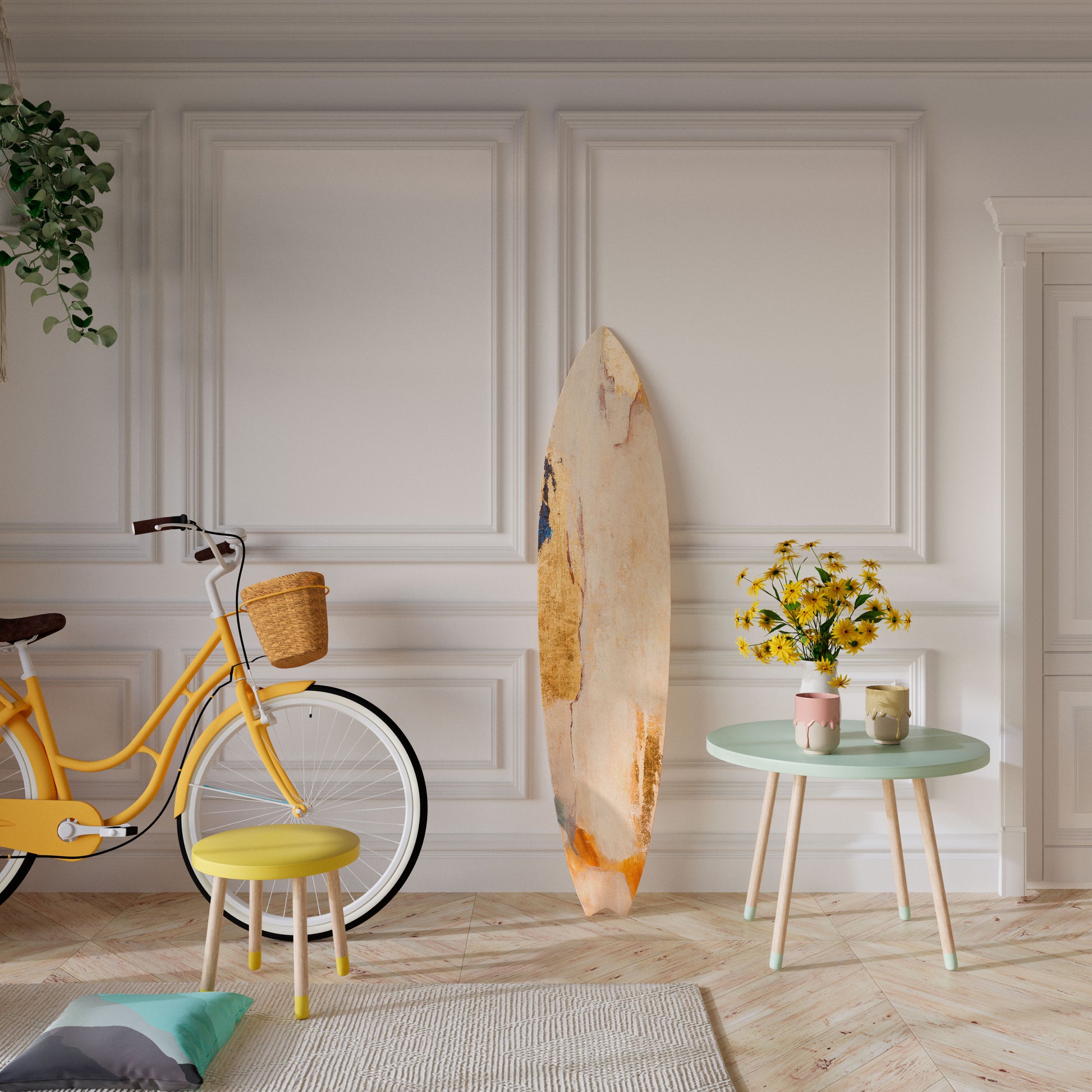 The surfboard has been designed with maximum functionality and arrangement flexibility in mind. It can be hung vertically or horizontally, or displayed freestanding by leaning it against a wall, dresser, or shelf. This makes it easy to adapt the piece to the character of the space and changing interior needs.