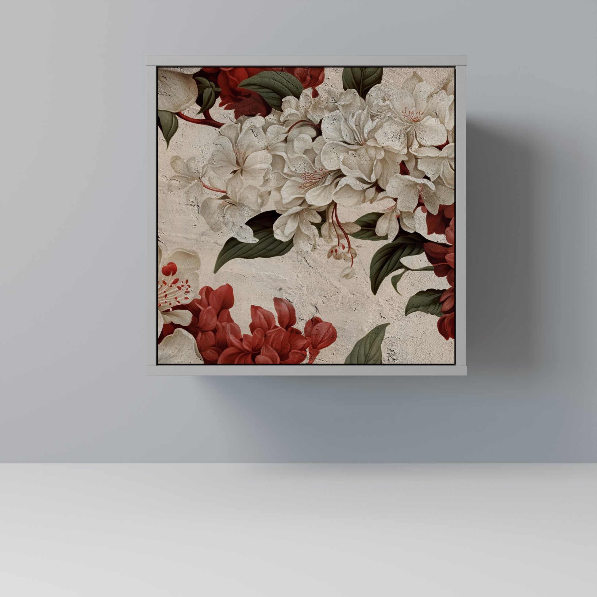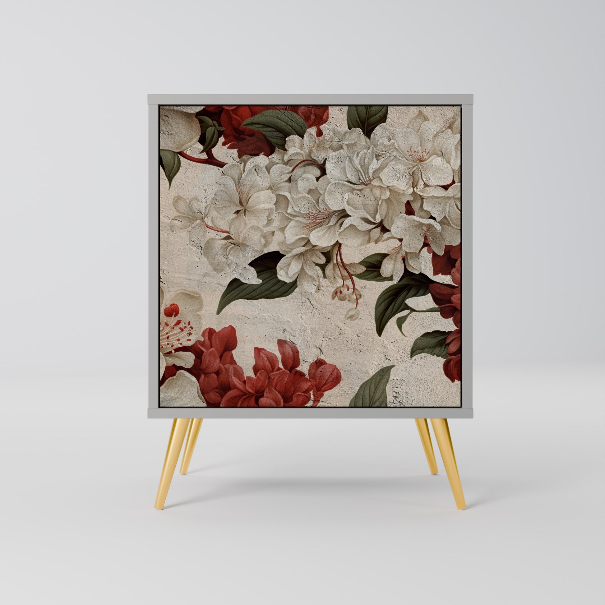 This compact yet remarkably elegant piece of furniture impresses with its minimalist design, perfectly fitting into both modern and classic interiors. The subdued grey color of the body gives the furniture a subtle yet distinctive character, while the fronts with a unique print add an artistic touch.