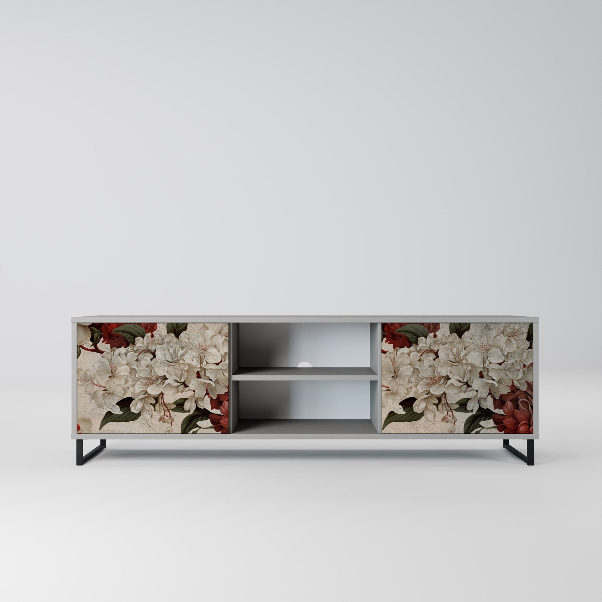 The grey body lends the TV stand a contemporary, refined look, while the fronts with an exceptional print capture attention, becoming the focal point of any room. The spacious interior provides room for electronic devices, cables, remotes, and other accessories, helping you maintain order and organization.
