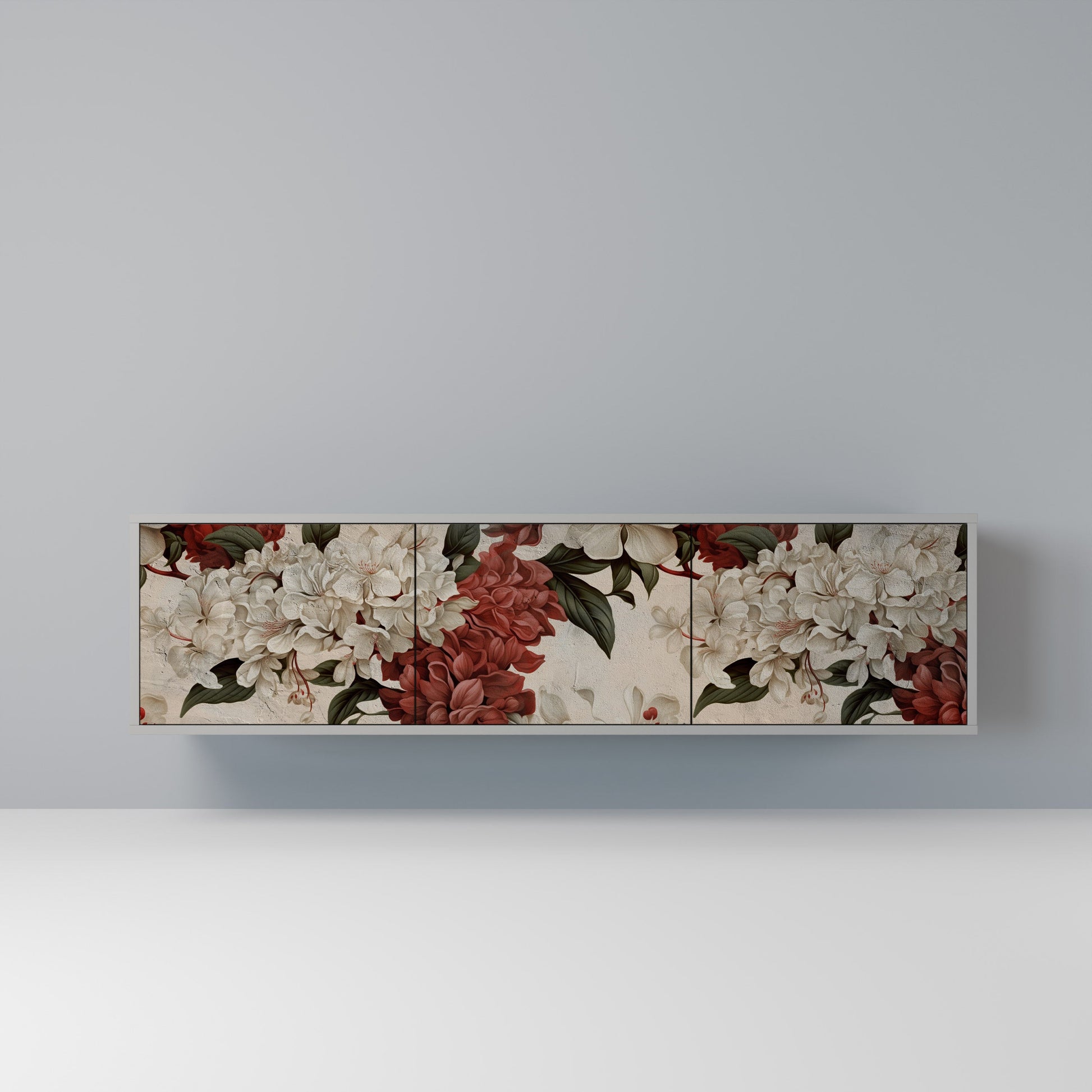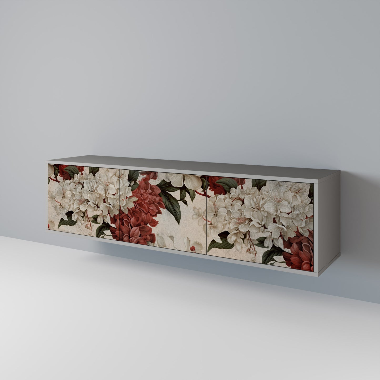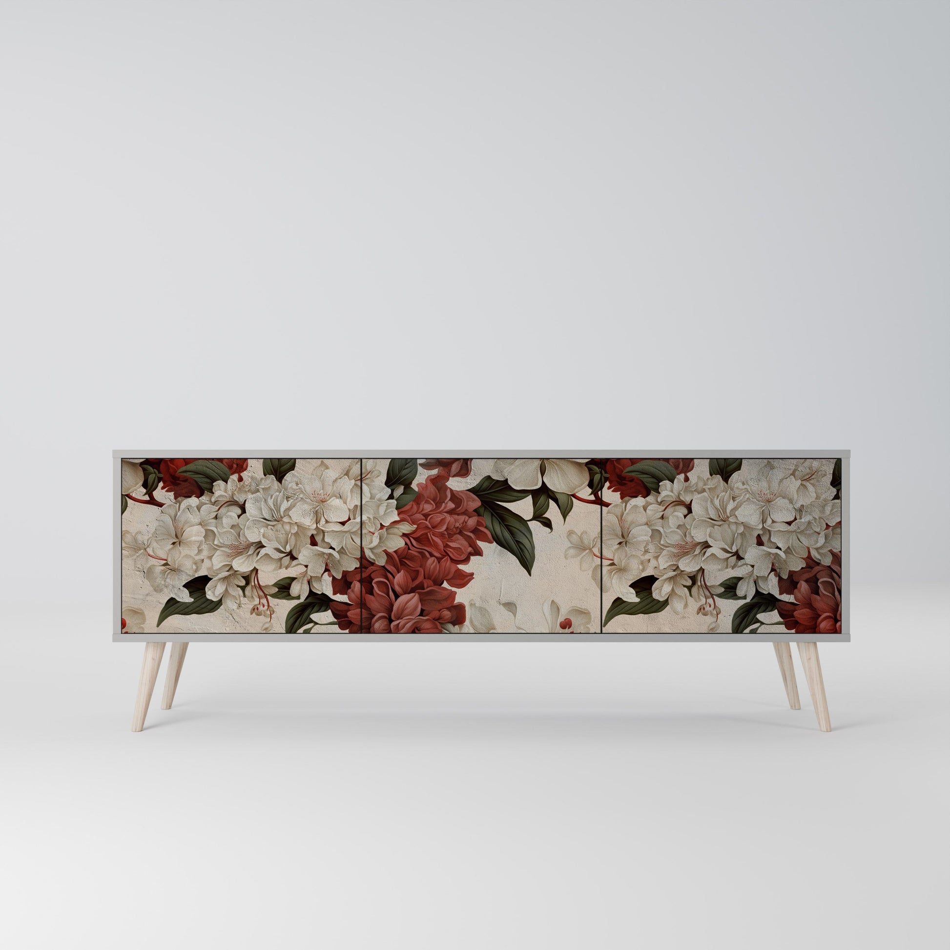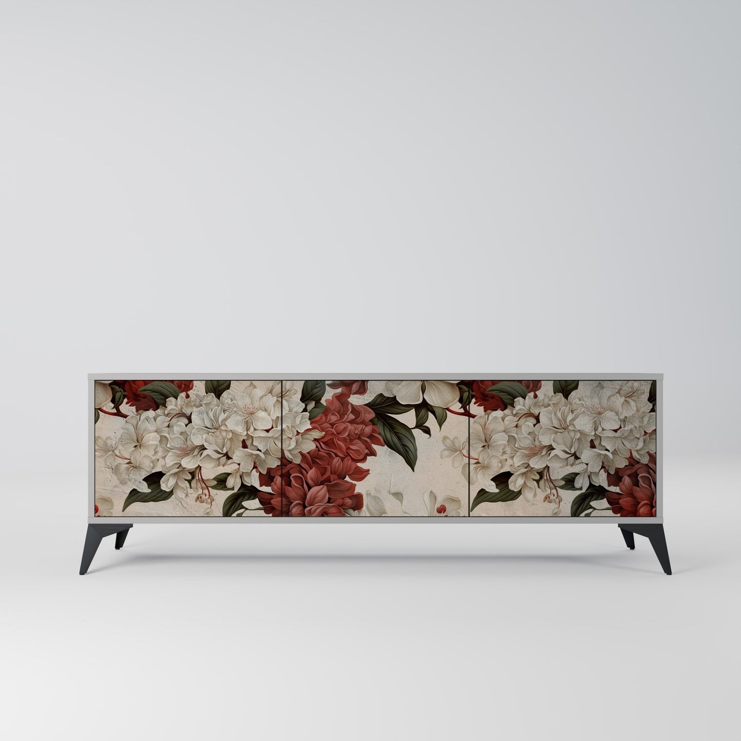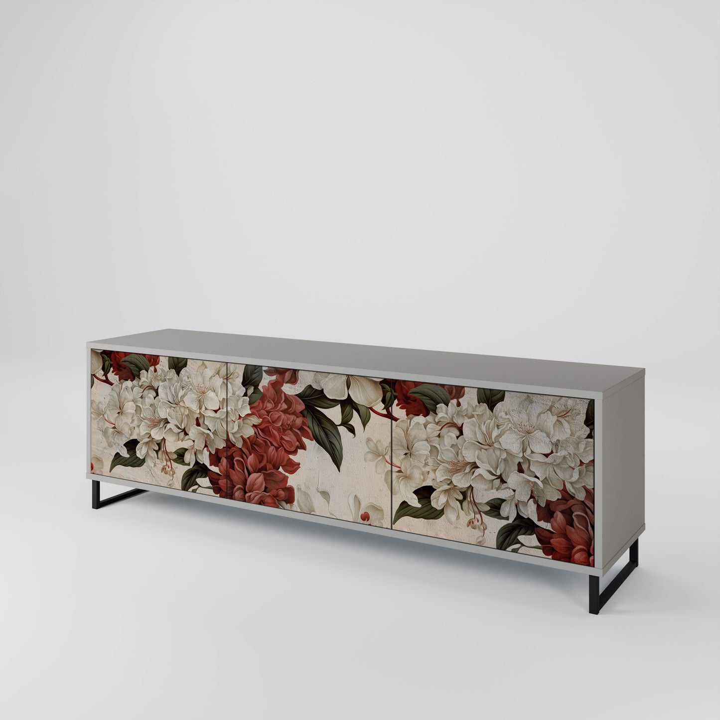 The grey body of the stand creates a refined, modern accent that pairs beautifully with industrial and minimalist arrangements. The fronts with a designer print add character and uniqueness, making this piece not only practical but also a standout decorative element.