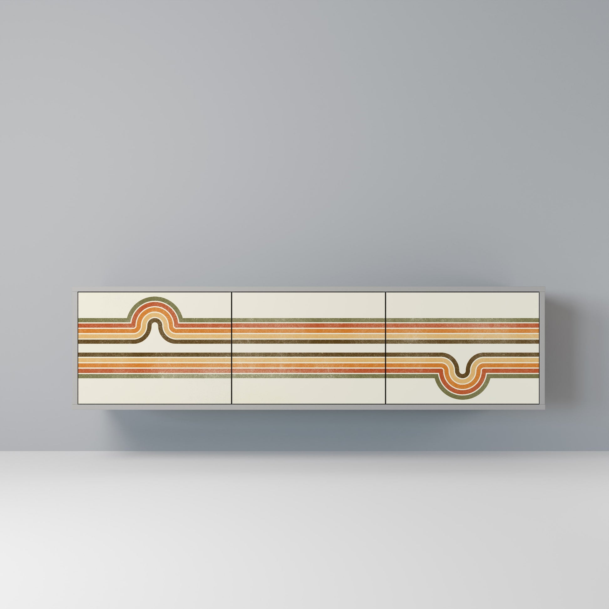 The grey body of the stand creates a refined, modern accent that pairs beautifully with industrial and minimalist arrangements. The fronts with a designer print add character and uniqueness, making this piece not only practical but also a standout decorative element.