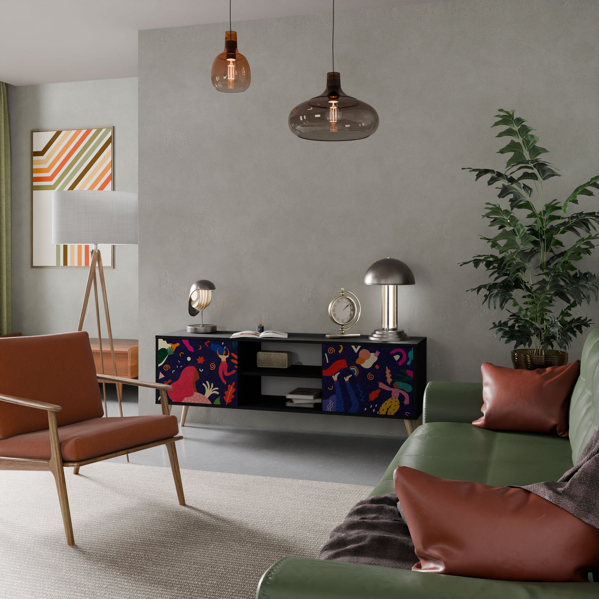The black body gives the TV stand an elegant, modern look, while the fronts with an exceptional print draw attention, making it the focal point of any room. The spacious interior provides room for electronic devices, cables, remotes, and other accessories, helping you maintain order and organization.