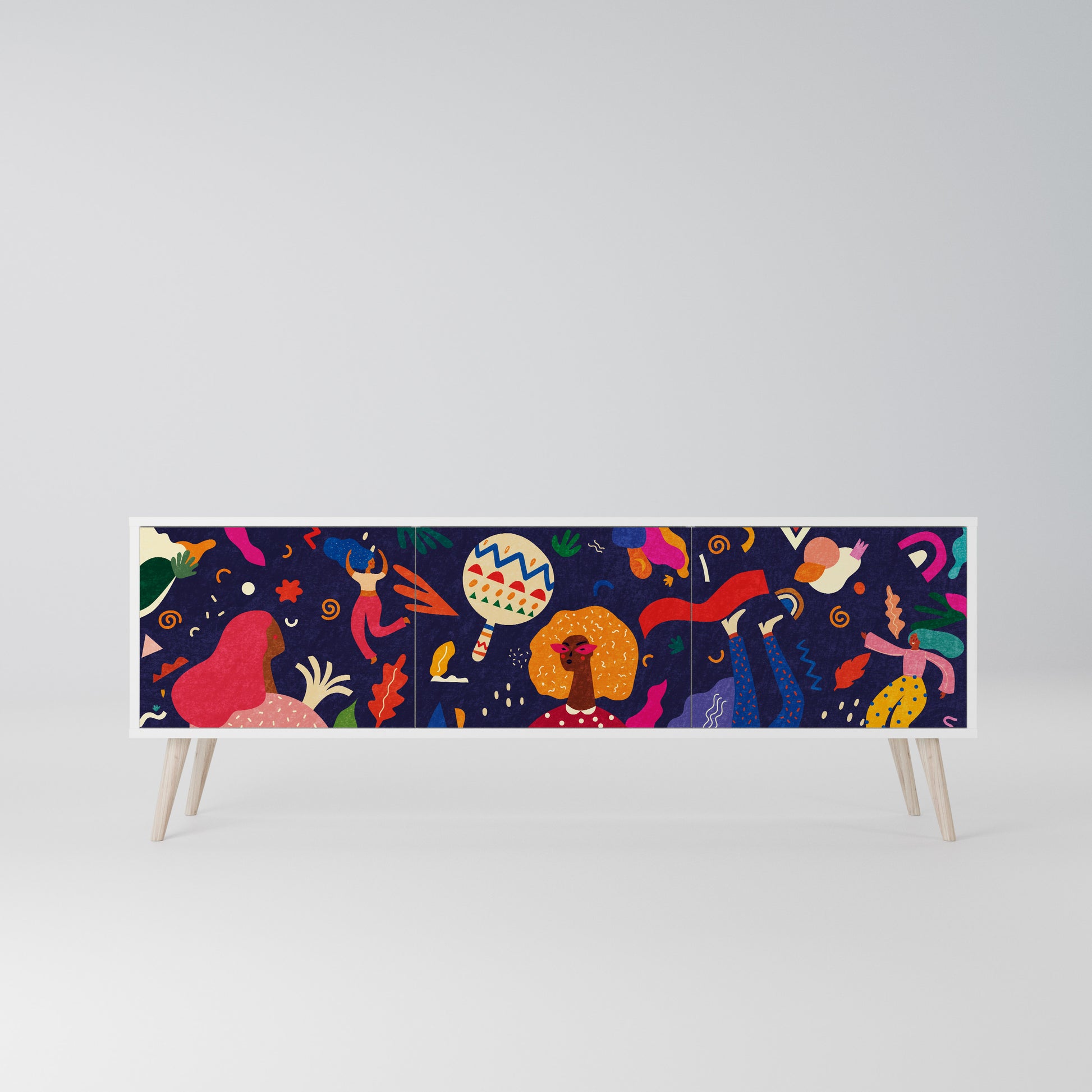 The white body of the stand creates a crisp, modern accent that pairs beautifully with minimalist and Scandinavian arrangements. The fronts with a designer print add character and uniqueness, making this piece not only practical but also a standout decorative element.