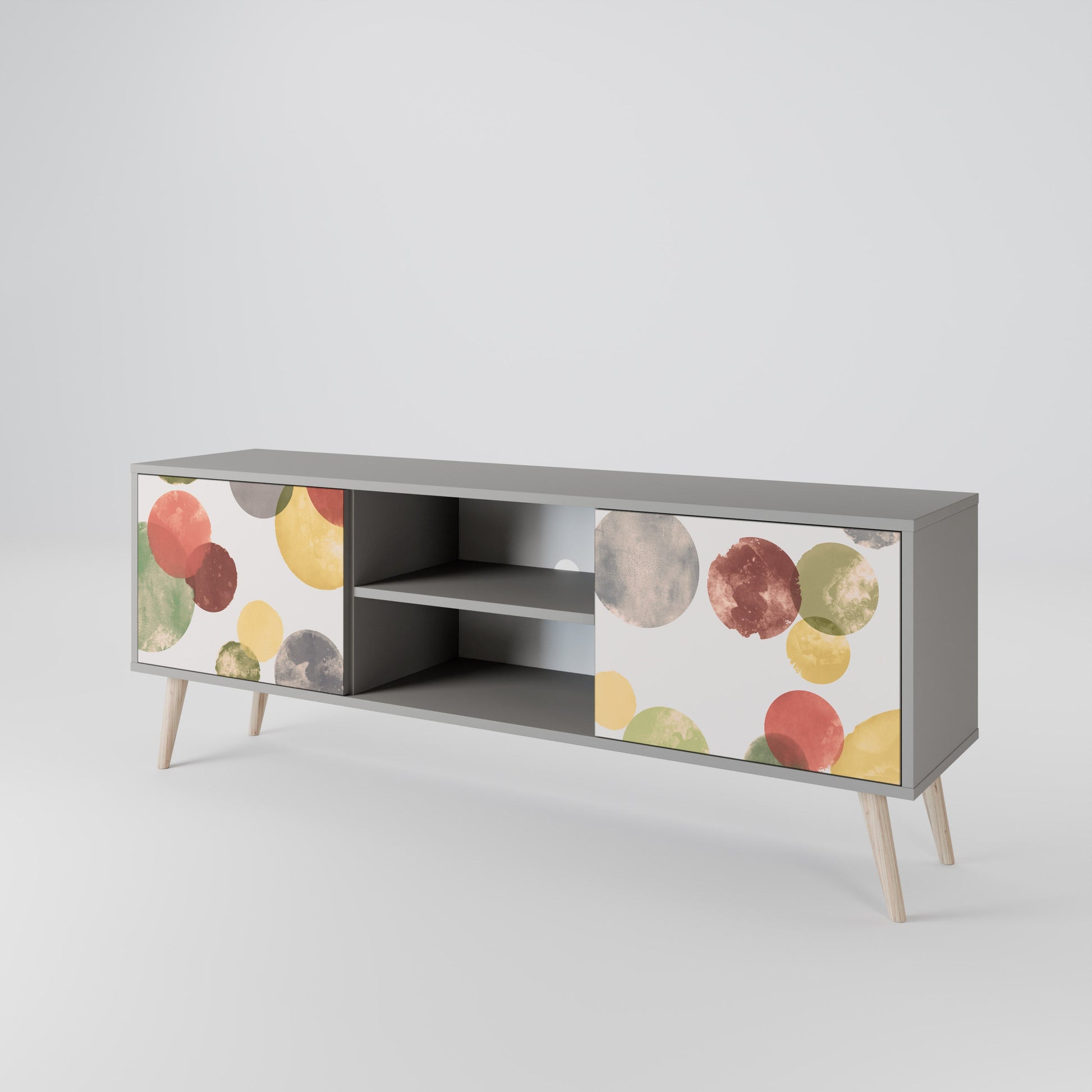 The grey body lends the TV stand a contemporary, refined look, while the fronts with an exceptional print capture attention, becoming the focal point of any room. The spacious interior provides room for electronic devices, cables, remotes, and other accessories, helping you maintain order and organization.
