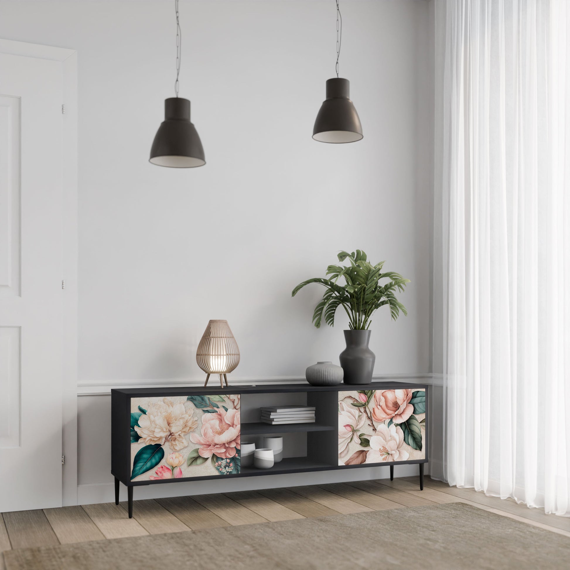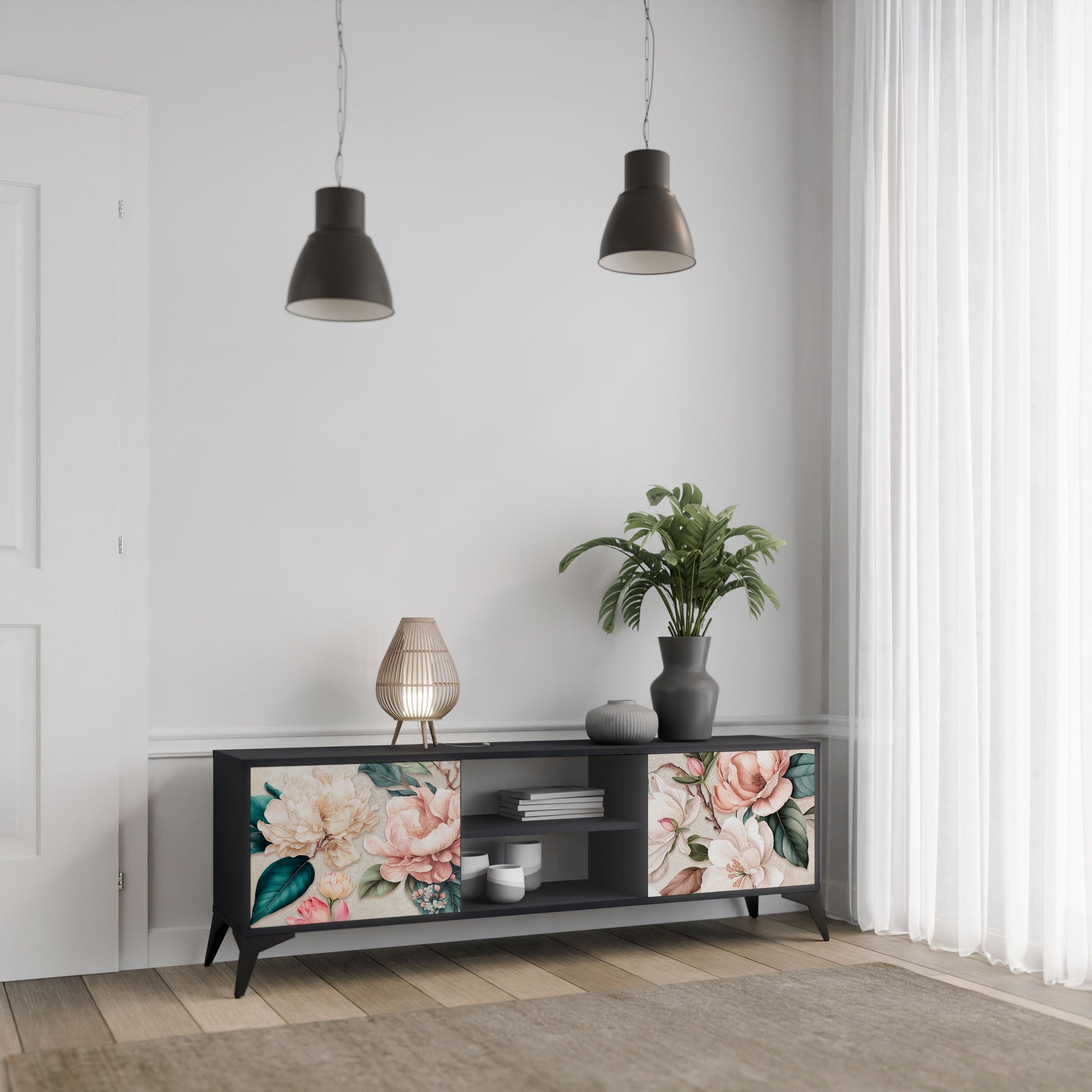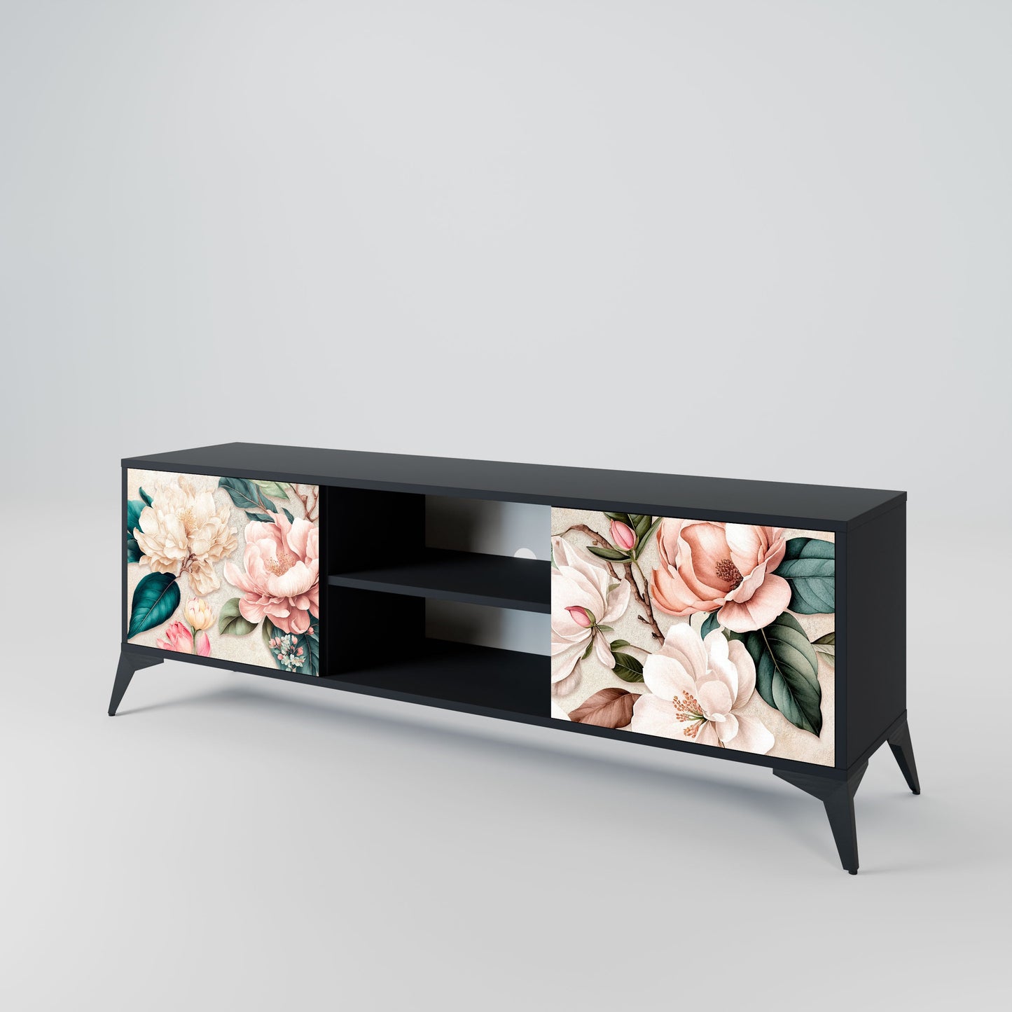 The black body gives the TV stand an elegant, modern look, while the fronts with an exceptional print draw attention, making it the focal point of any room. The spacious interior provides room for electronic devices, cables, remotes, and other accessories, helping you maintain order and organization.
