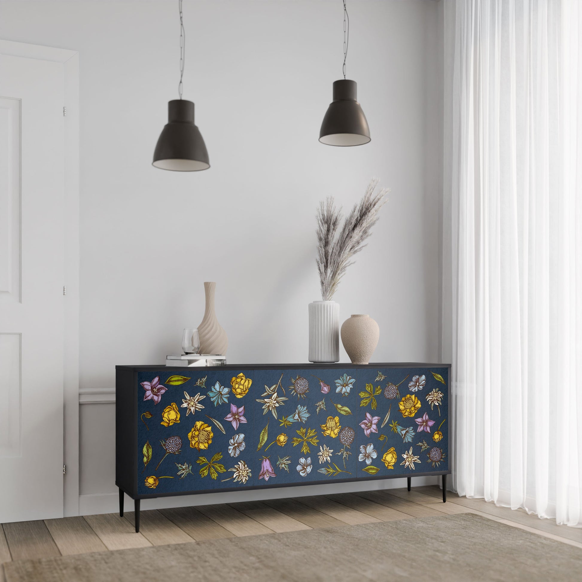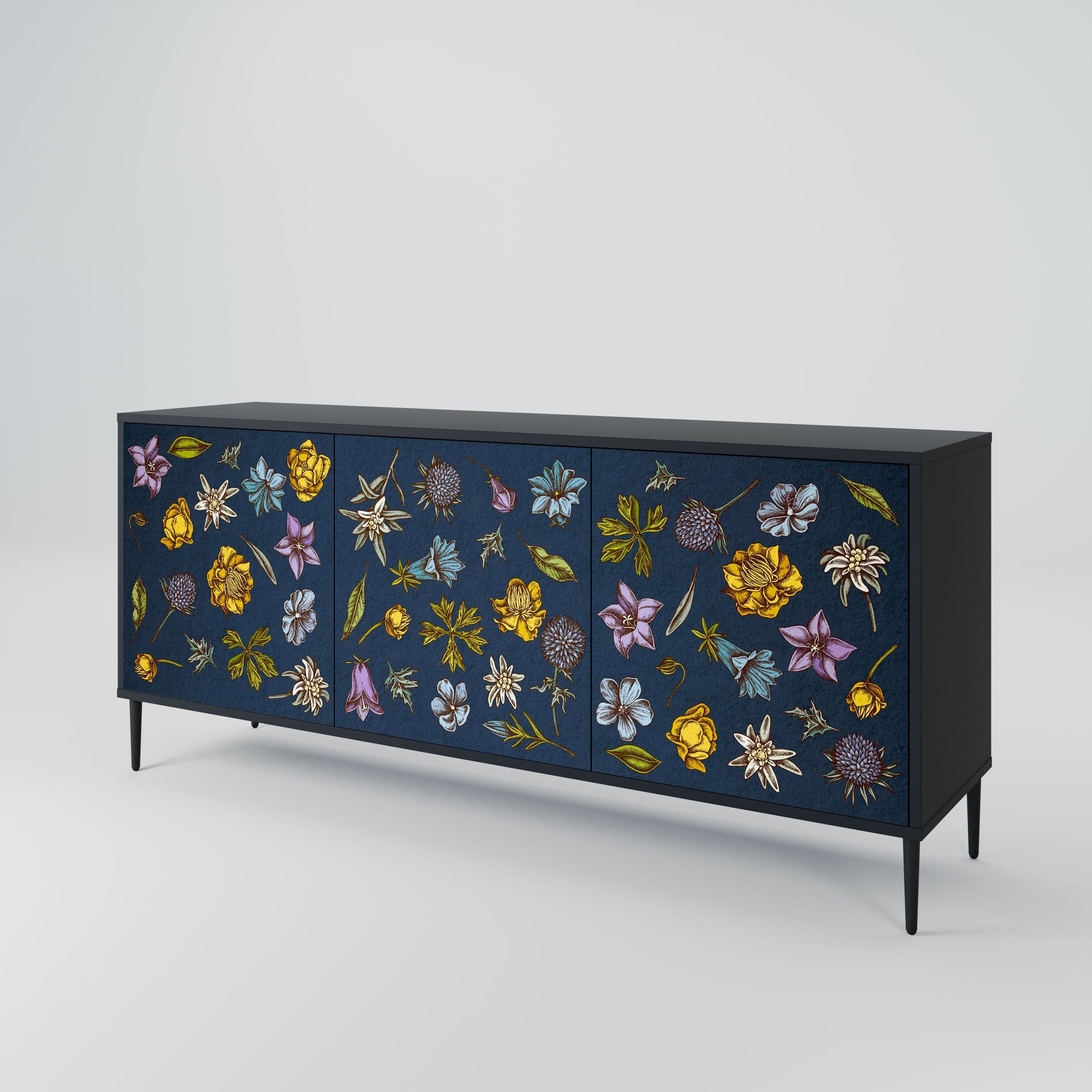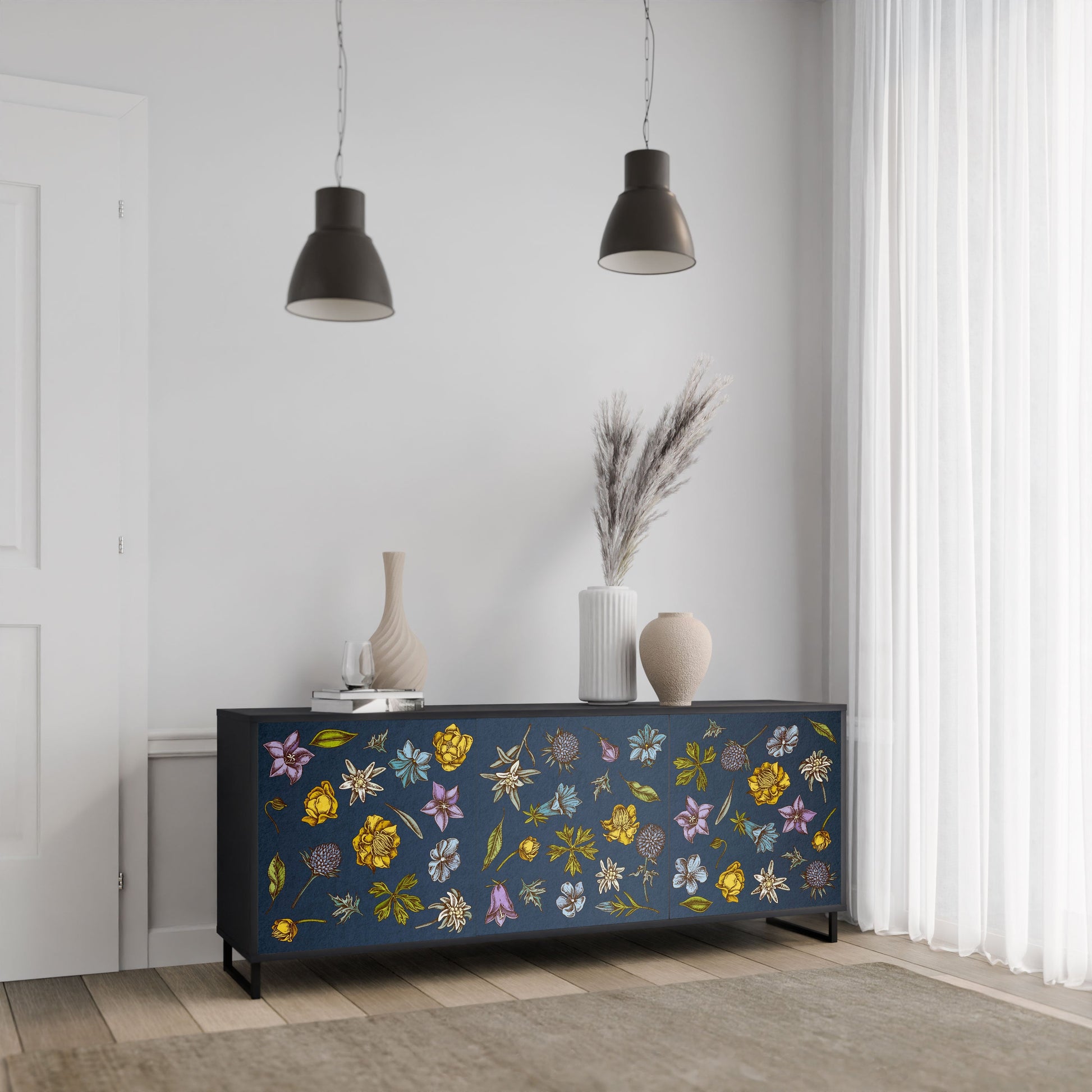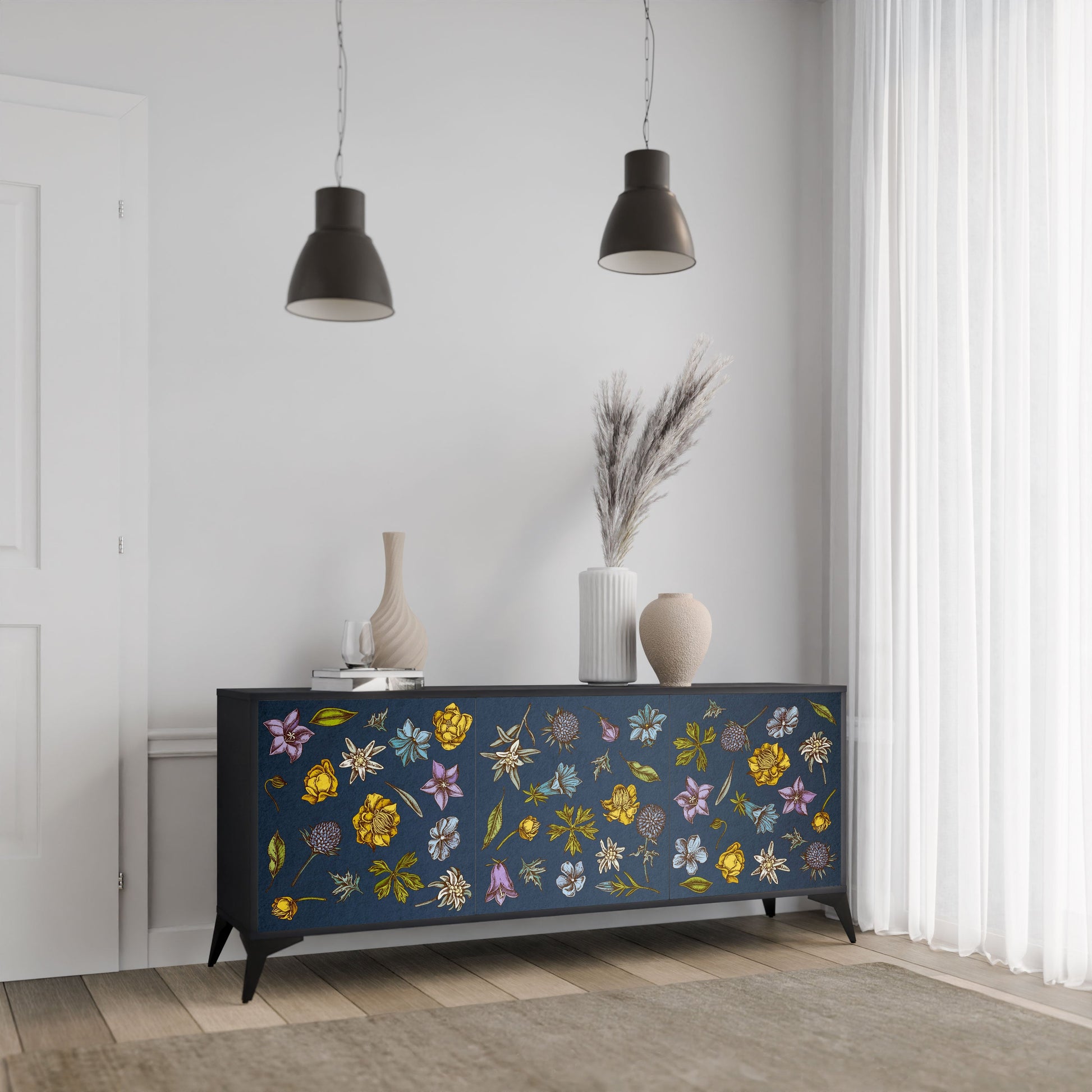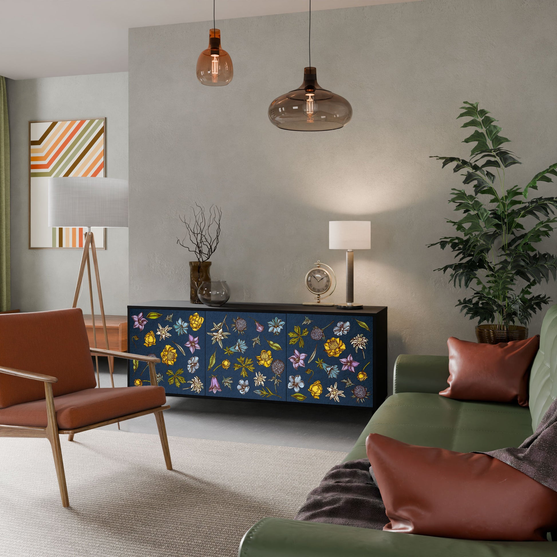 FLOWERS ON NAVY BLUE 3-Door Sideboard in Black Finish