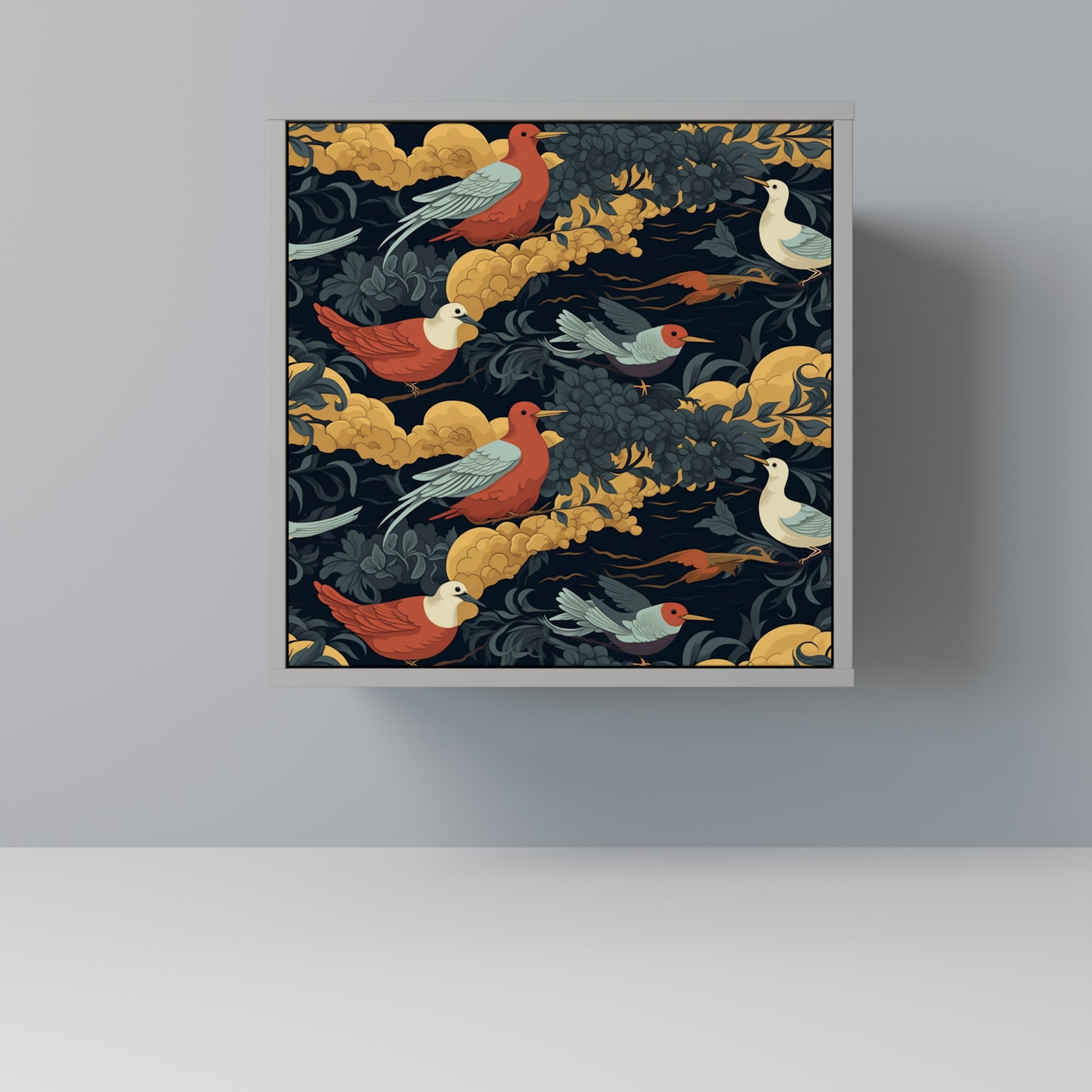 This compact yet remarkably elegant piece of furniture impresses with its minimalist design, perfectly fitting into both modern and classic interiors. The subdued grey color of the body gives the furniture a subtle yet distinctive character, while the fronts with a unique print add an artistic touch.