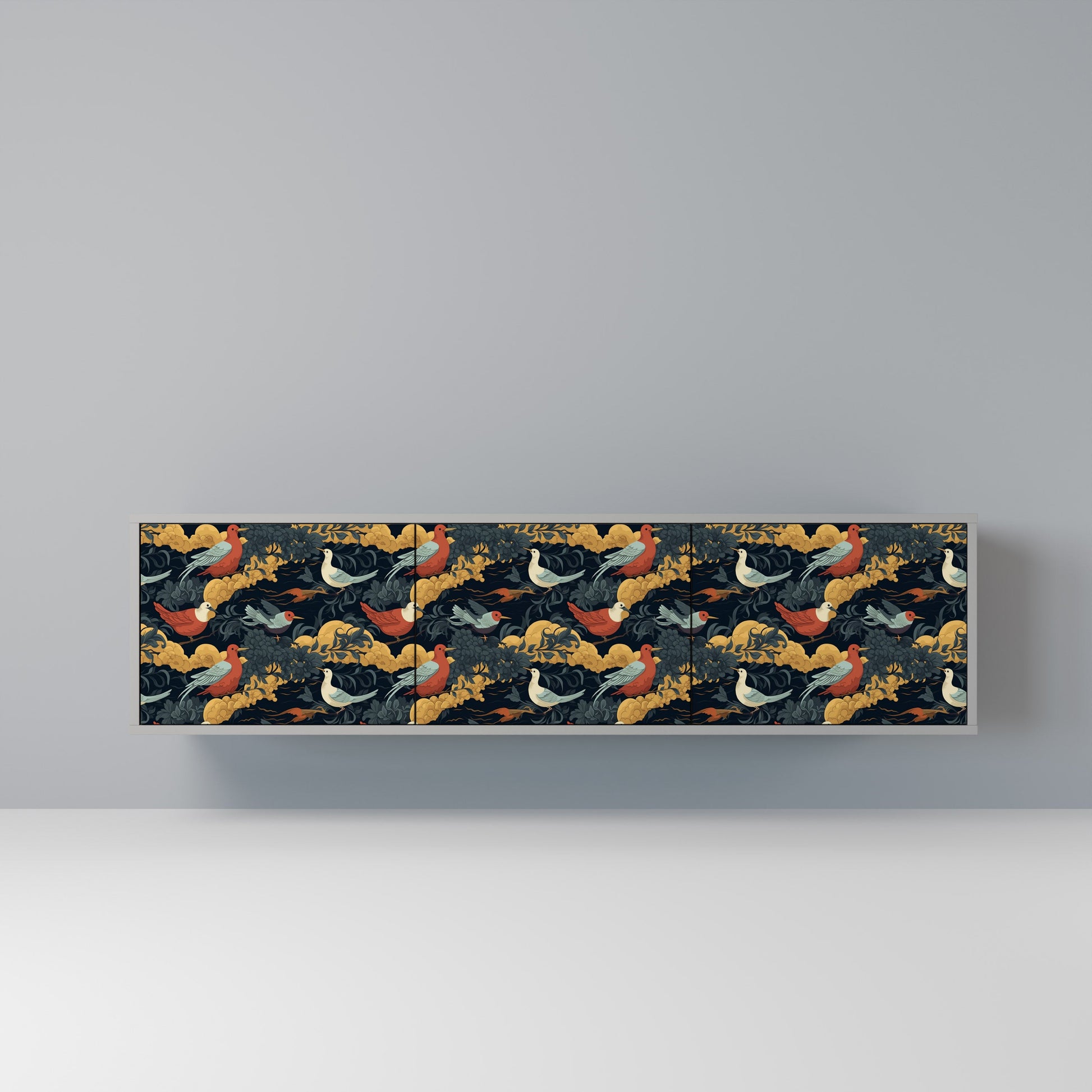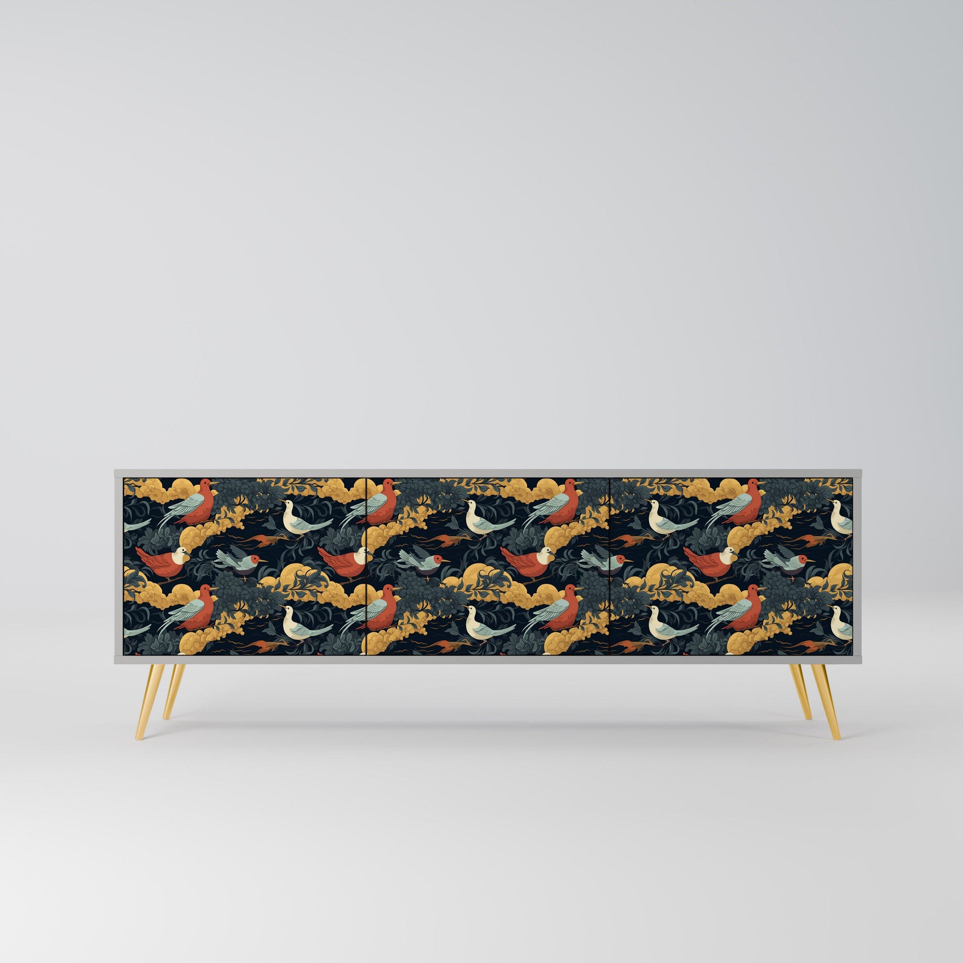 The grey body of the stand creates a refined, modern accent that pairs beautifully with industrial and minimalist arrangements. The fronts with a designer print add character and uniqueness, making this piece not only practical but also a standout decorative element.