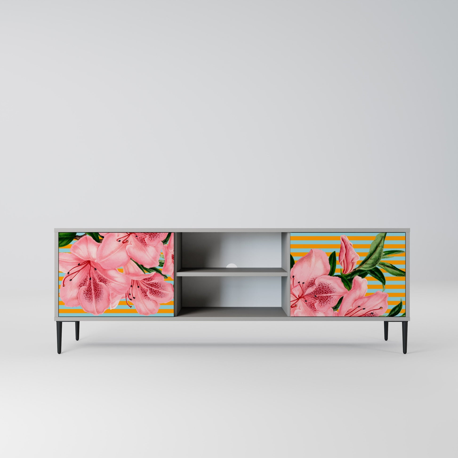 The grey body lends the TV stand a contemporary, refined look, while the fronts with an exceptional print capture attention, becoming the focal point of any room. The spacious interior provides room for electronic devices, cables, remotes, and other accessories, helping you maintain order and organization.