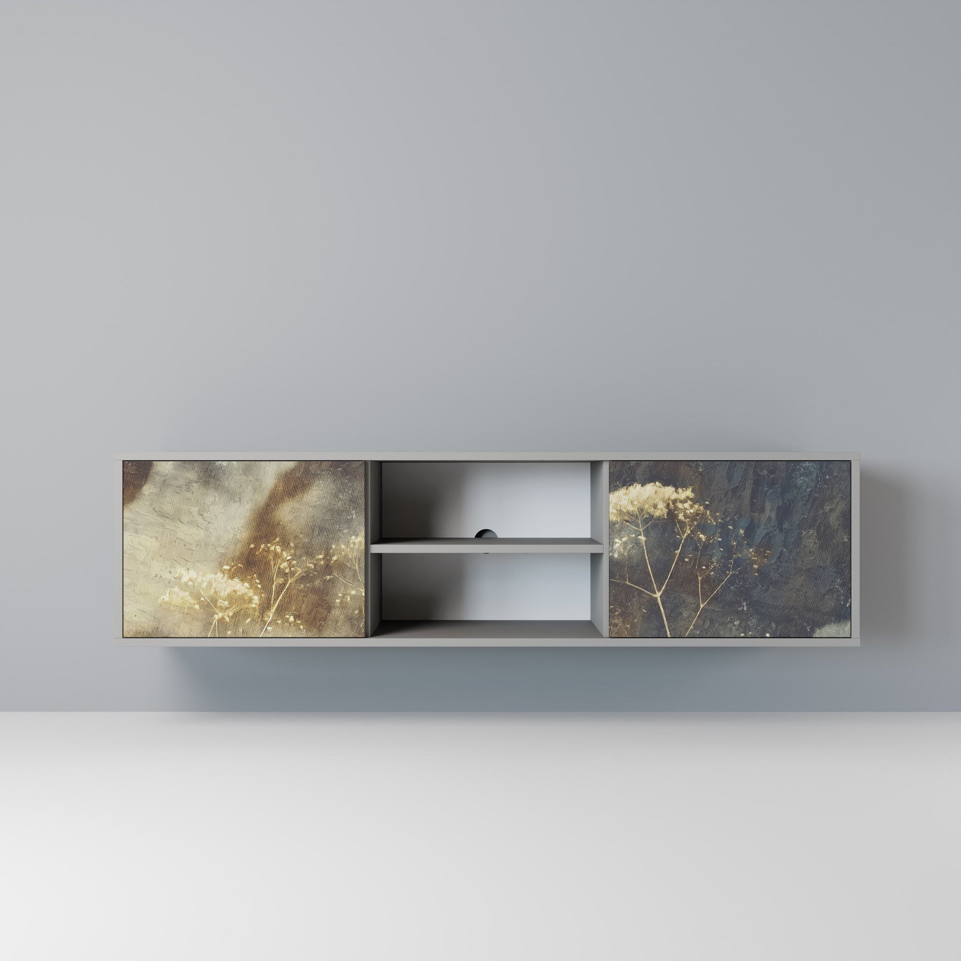 The grey body lends the TV stand a contemporary, refined look, while the fronts with an exceptional print capture attention, becoming the focal point of any room. The spacious interior provides room for electronic devices, cables, remotes, and other accessories, helping you maintain order and organization.