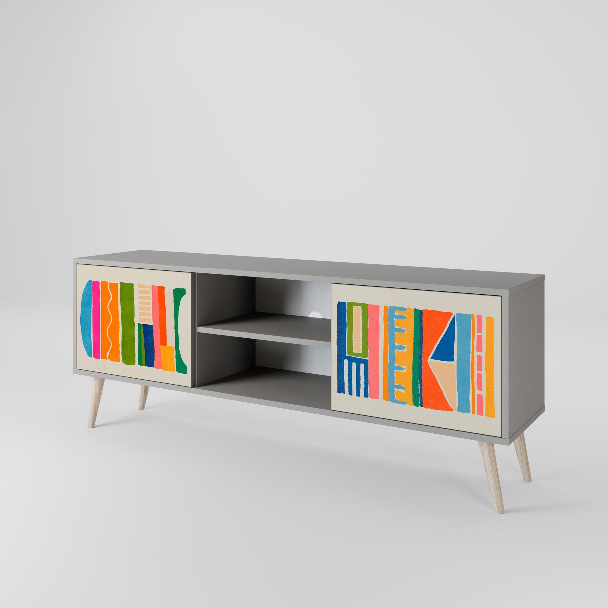 The grey body lends the TV stand a contemporary, refined look, while the fronts with an exceptional print capture attention, becoming the focal point of any room. The spacious interior provides room for electronic devices, cables, remotes, and other accessories, helping you maintain order and organization.