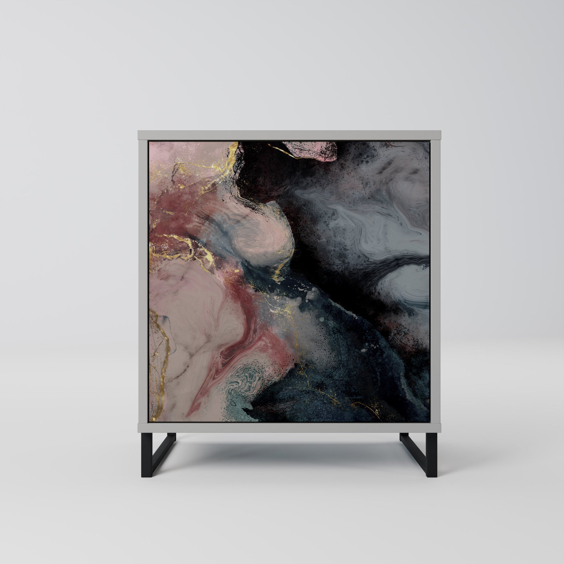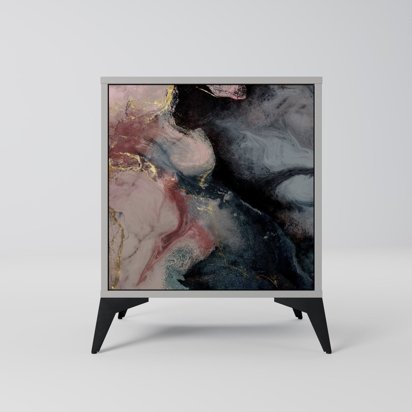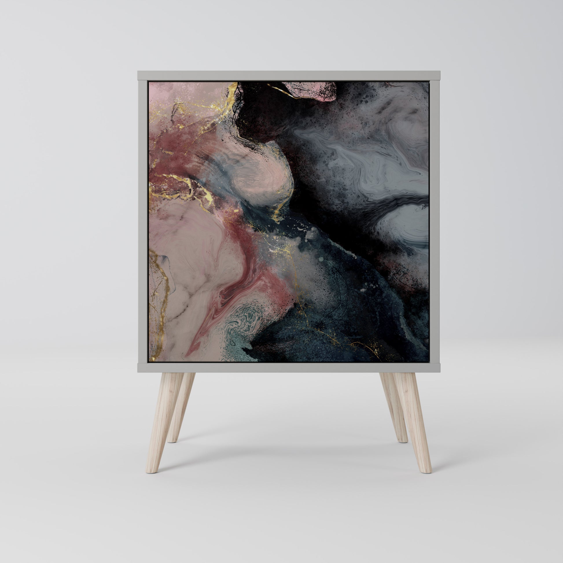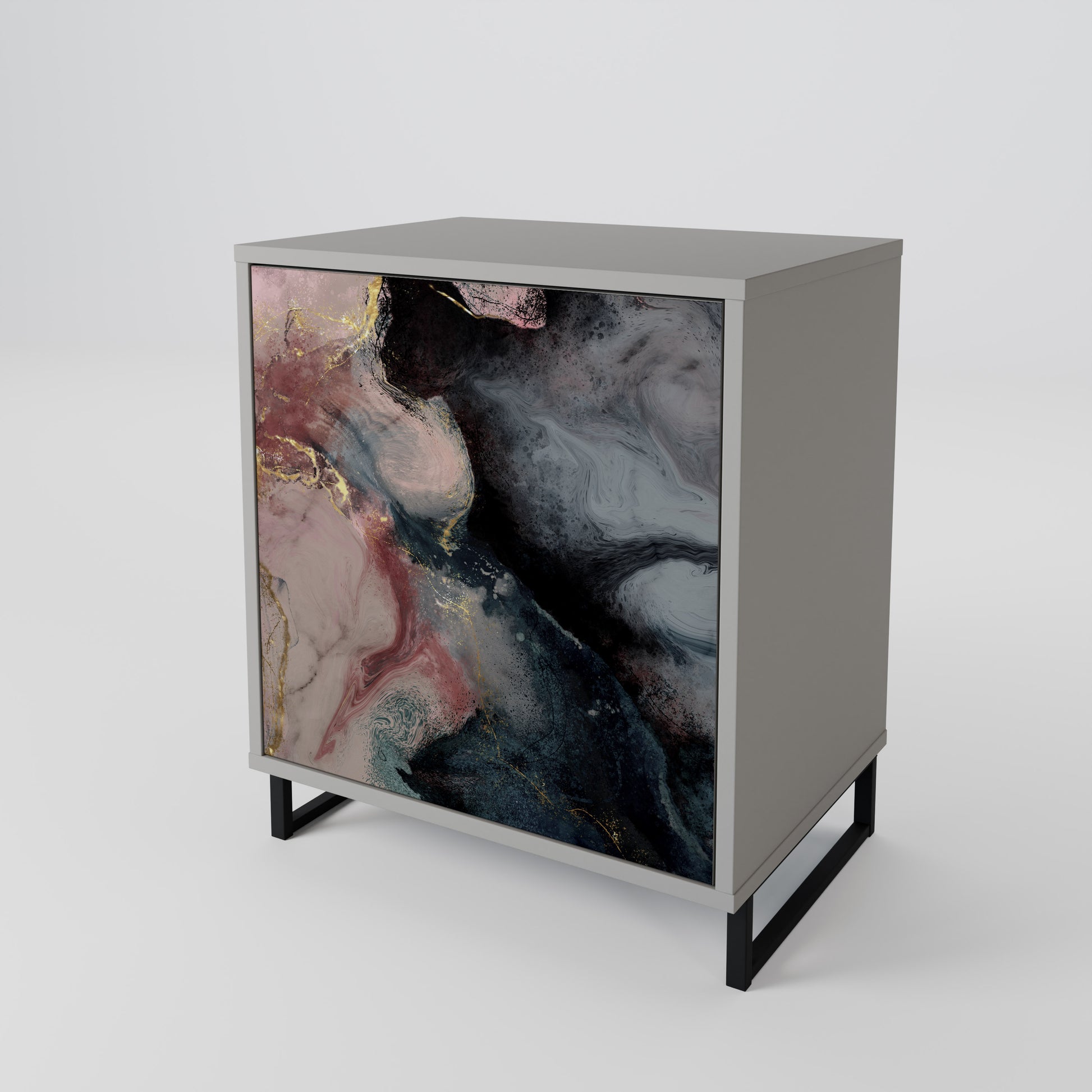This compact yet remarkably elegant piece of furniture impresses with its minimalist design, perfectly fitting into both modern and classic interiors. The subdued grey color of the body gives the furniture a subtle yet distinctive character, while the fronts with a unique print add an artistic touch.