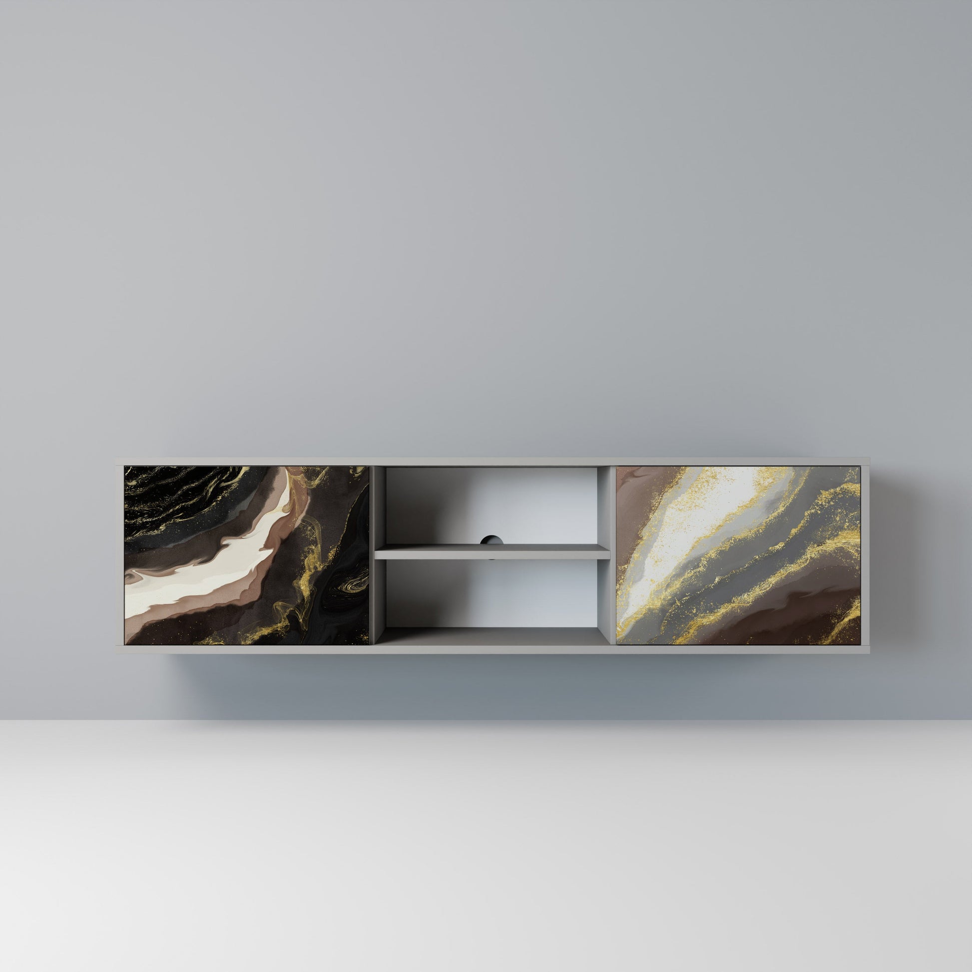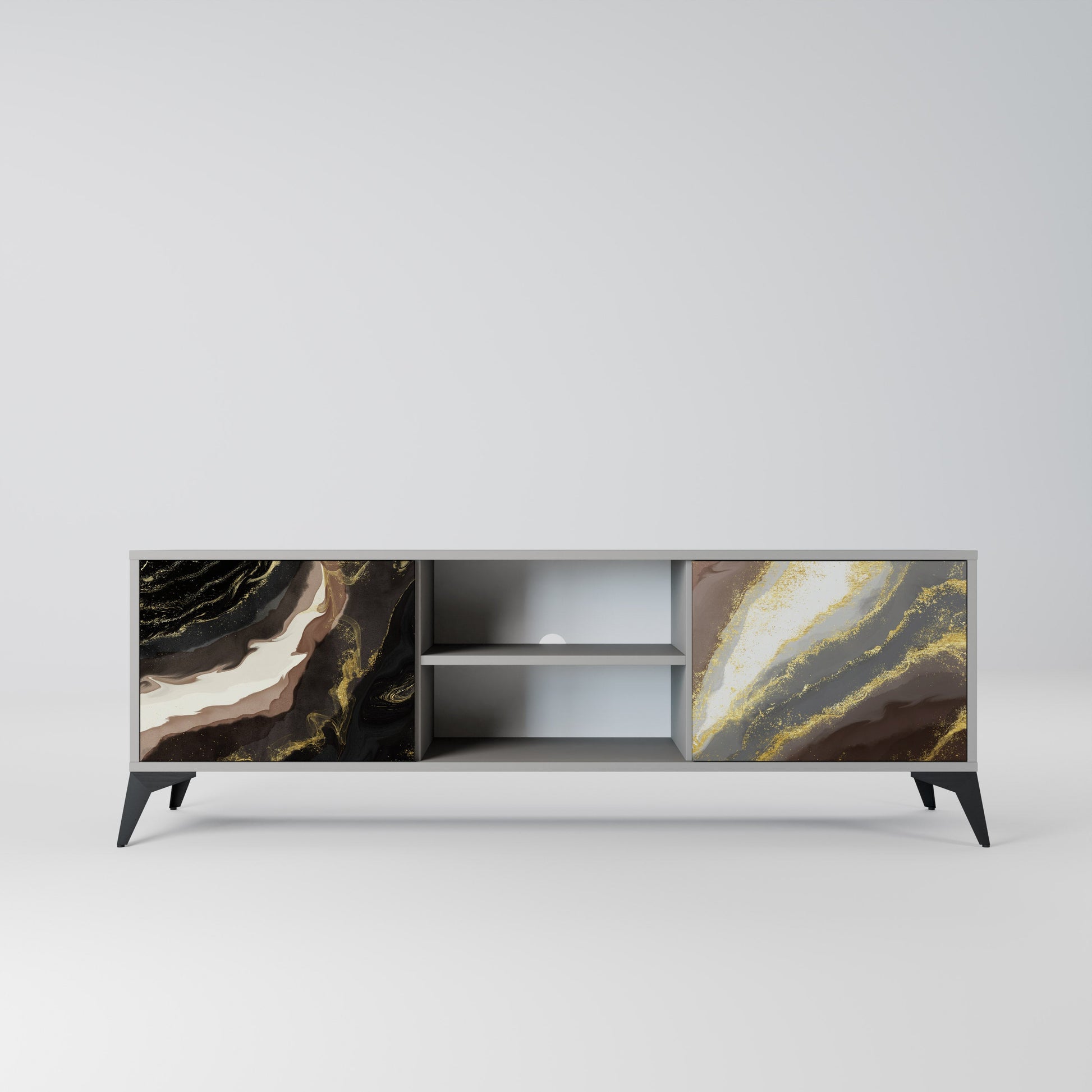 The grey body lends the TV stand a contemporary, refined look, while the fronts with an exceptional print capture attention, becoming the focal point of any room. The spacious interior provides room for electronic devices, cables, remotes, and other accessories, helping you maintain order and organization.